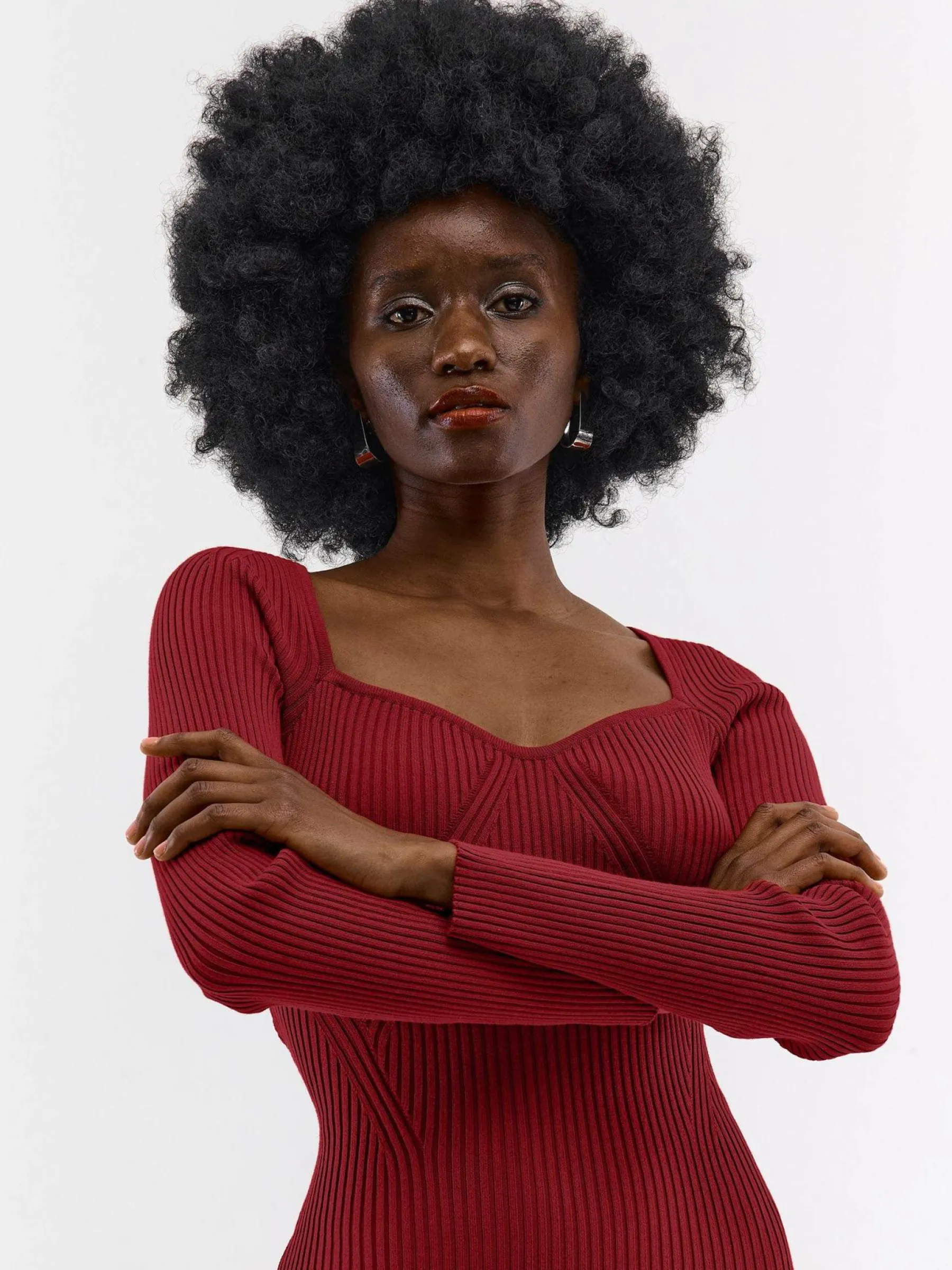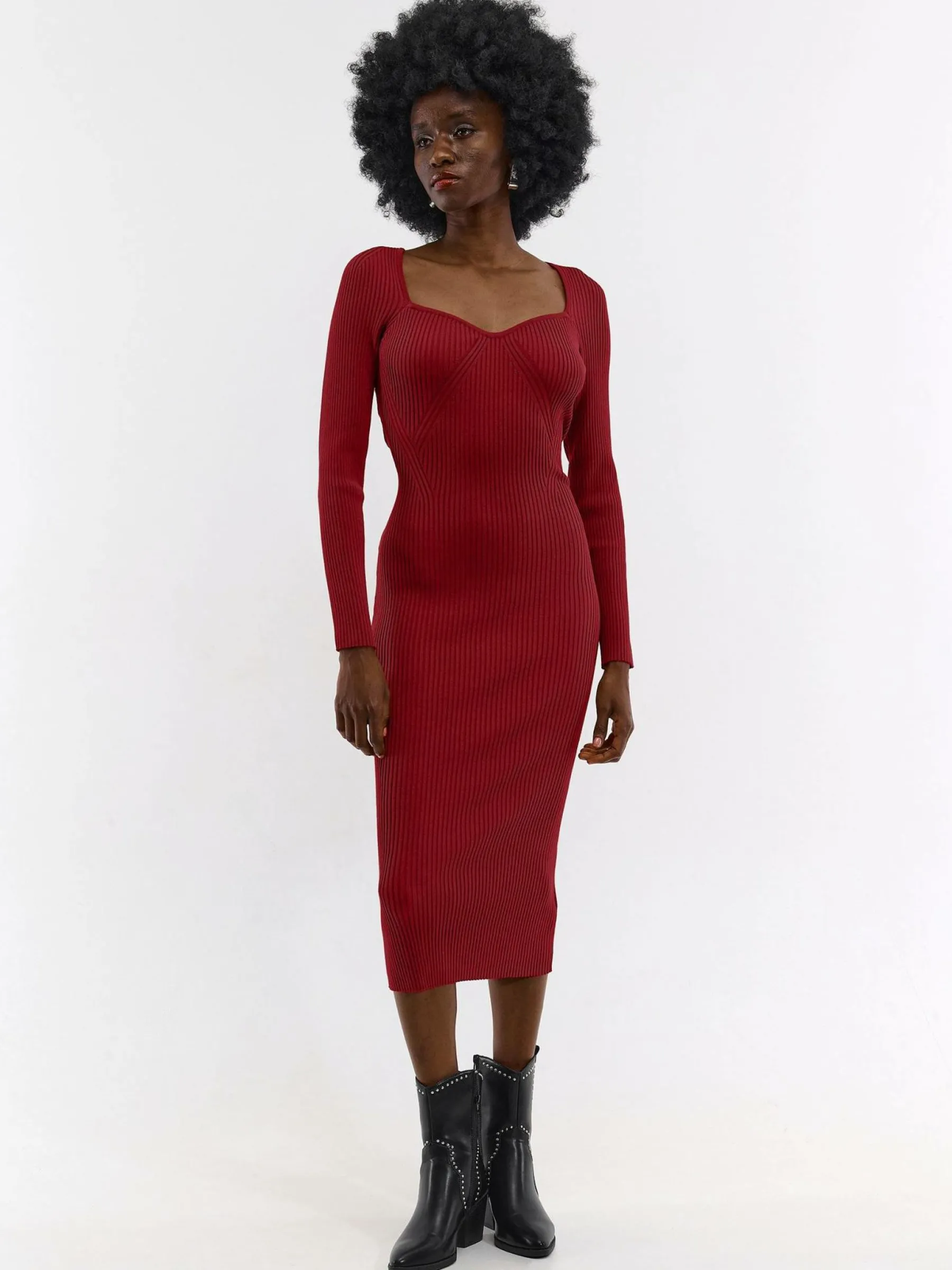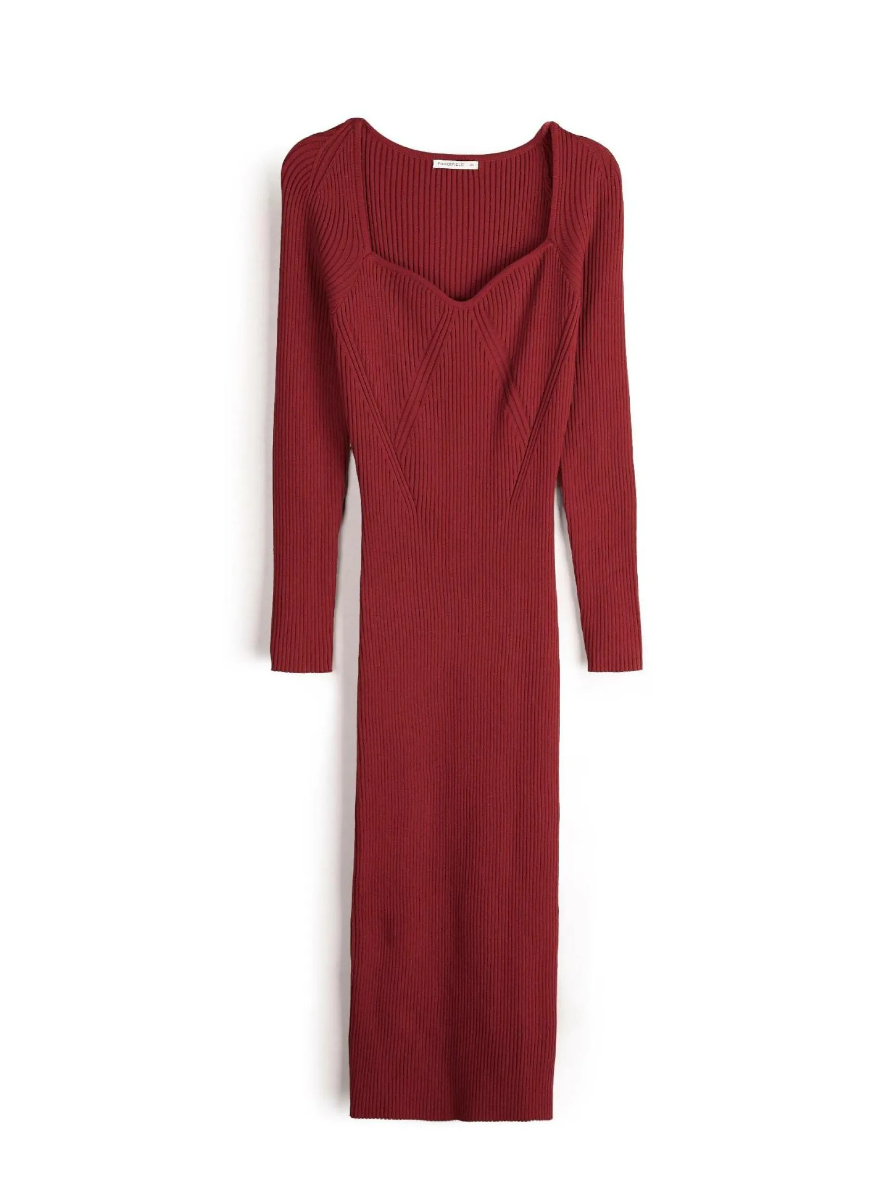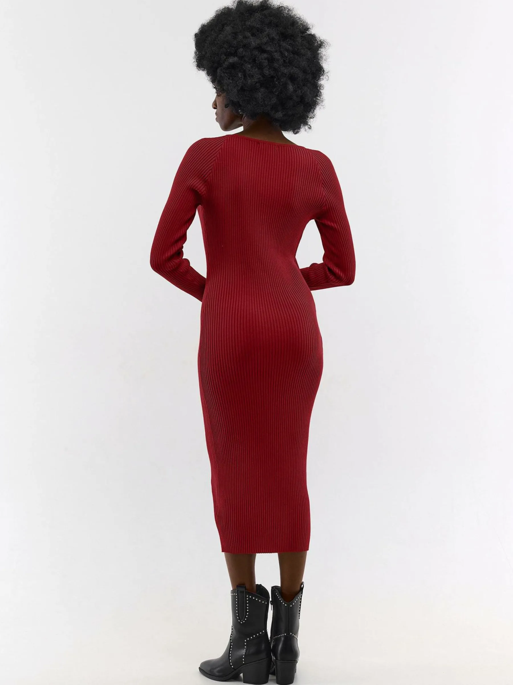 Kolor: burgundyKrój: ołówkoweTyp: sukienkaRekaw: długi rękawDługość: midiPattern style: pojedynczy kolor, żebro…