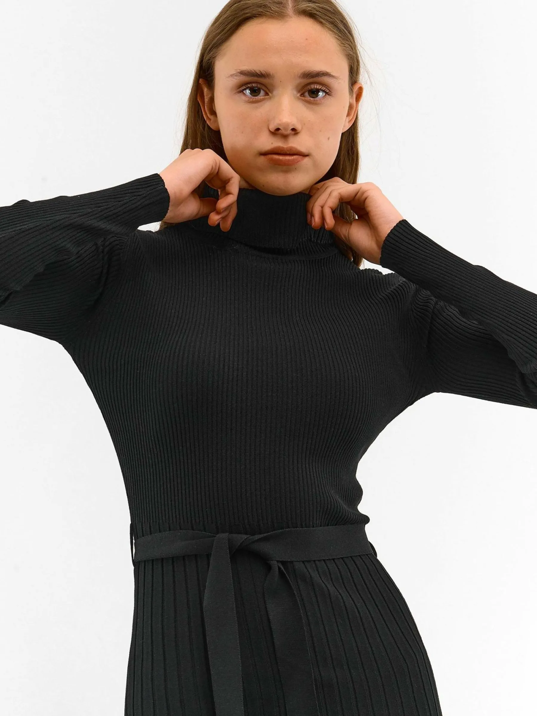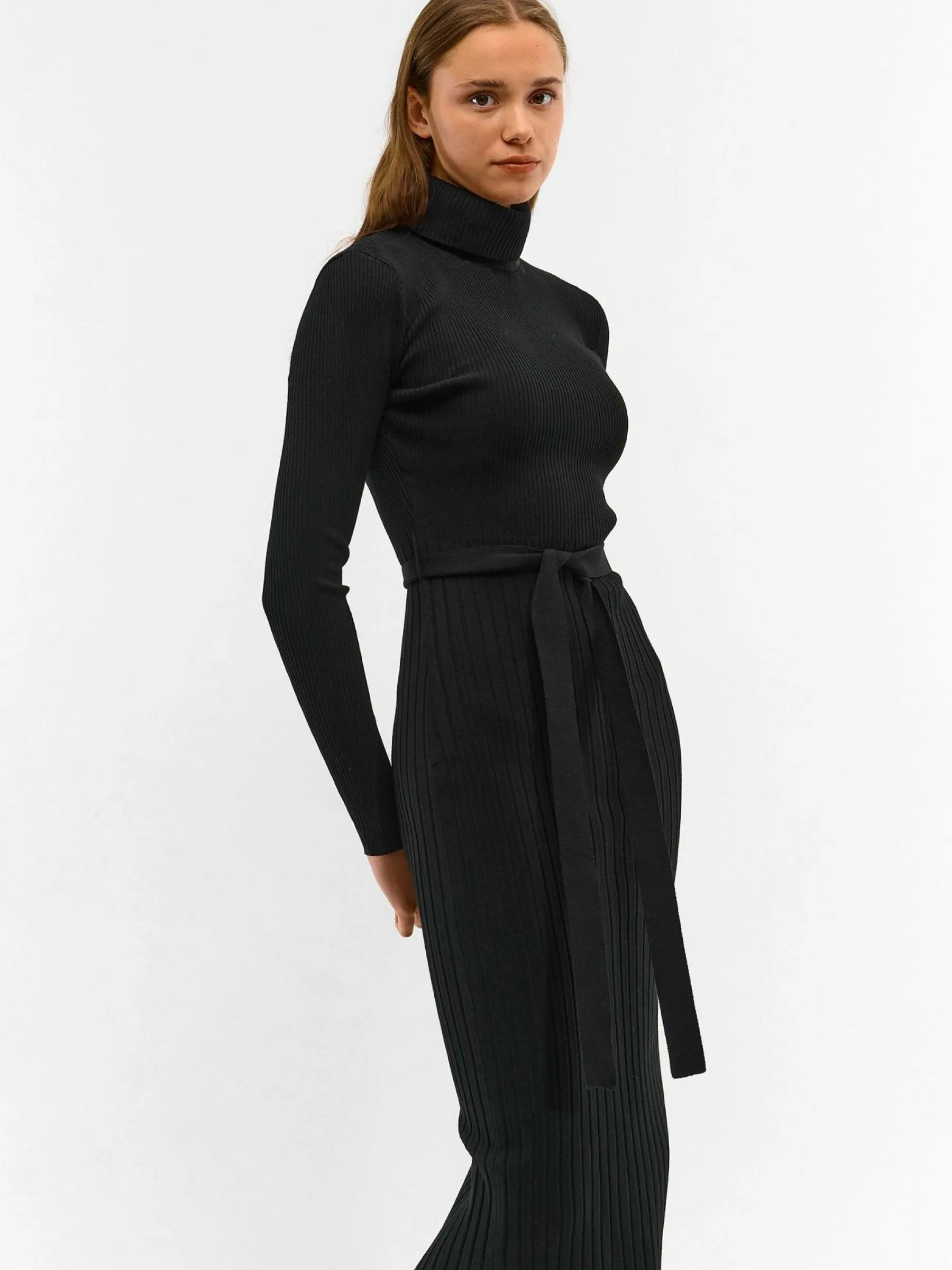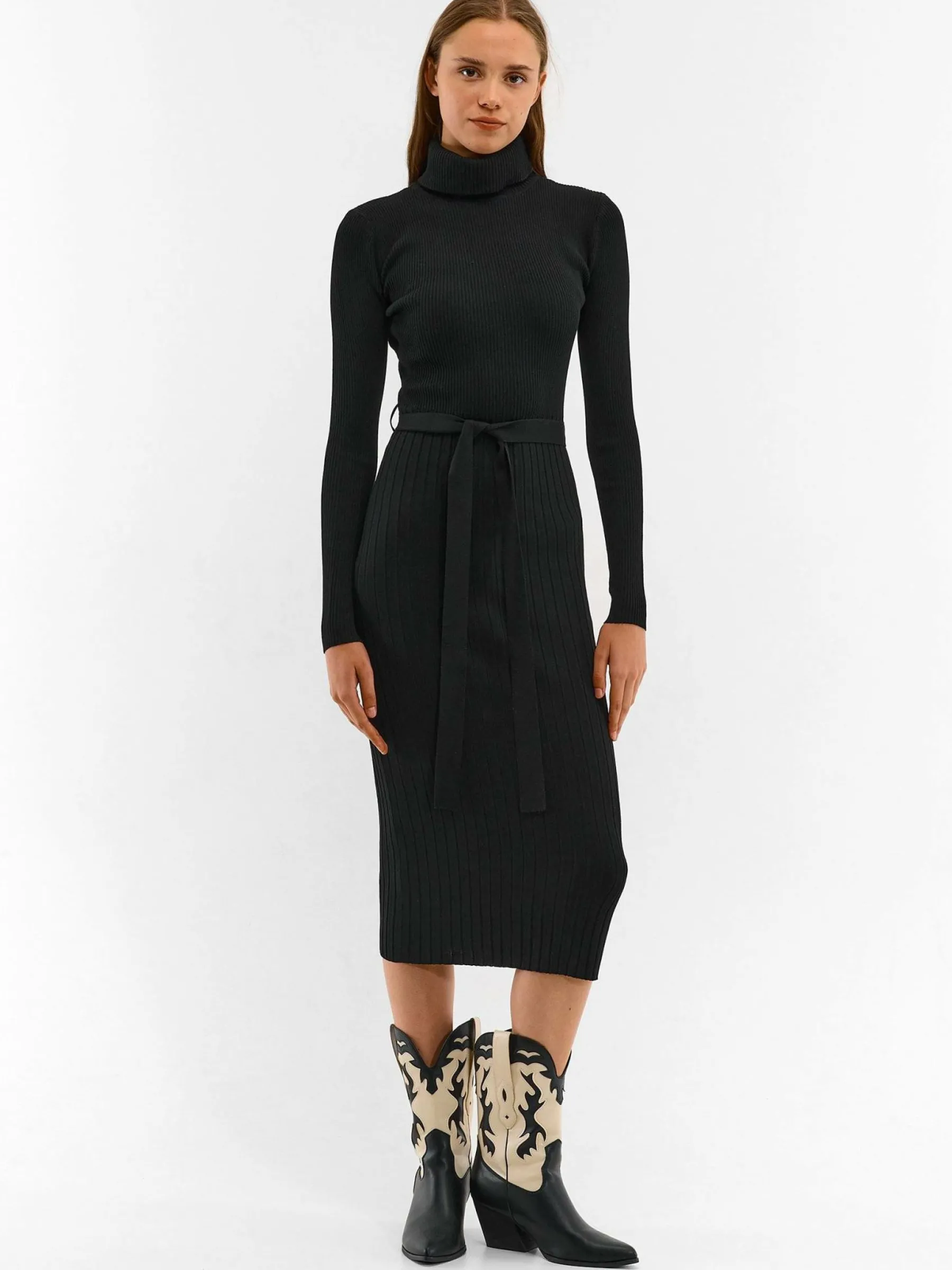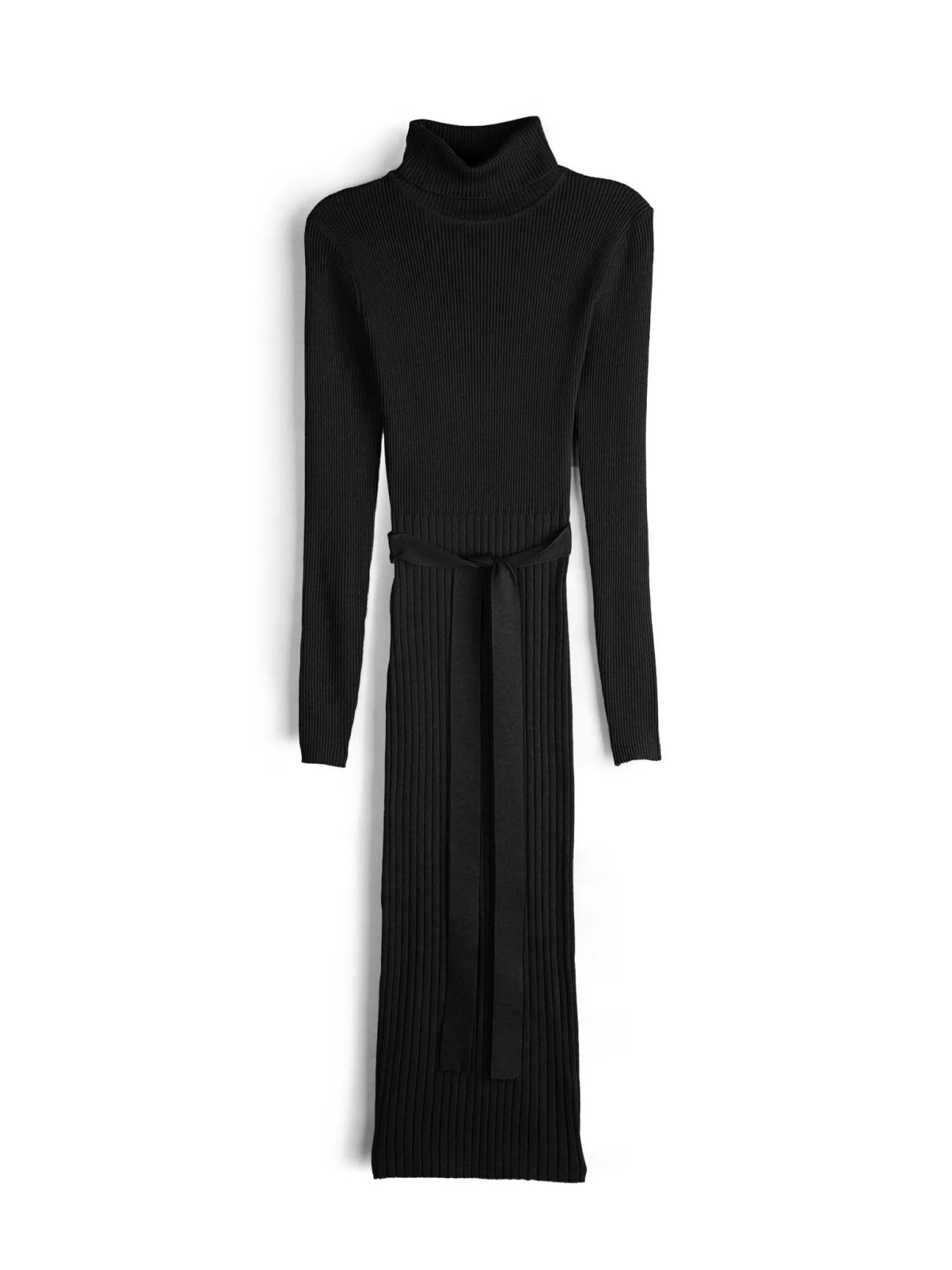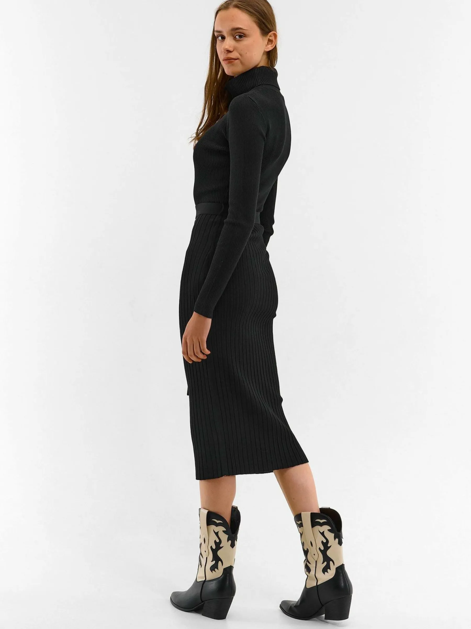 Kolor: czarnyKrój: ołówkoweTyp: sukienkaRekaw: długi rękawDługość: midiPattern style: pojedynczy kolor, żebrowa…