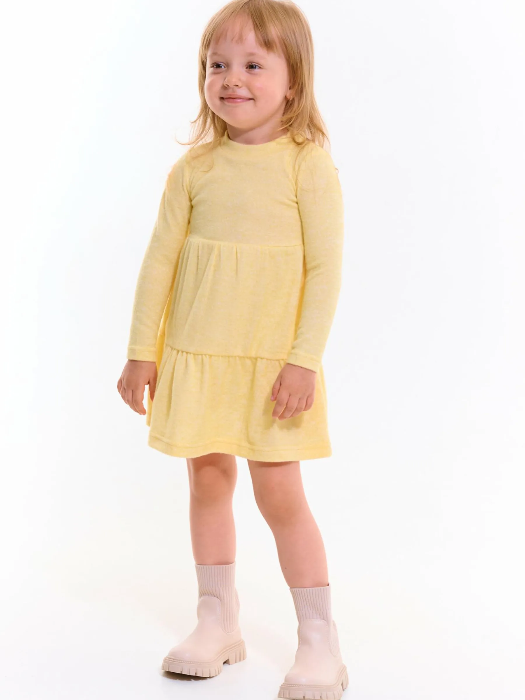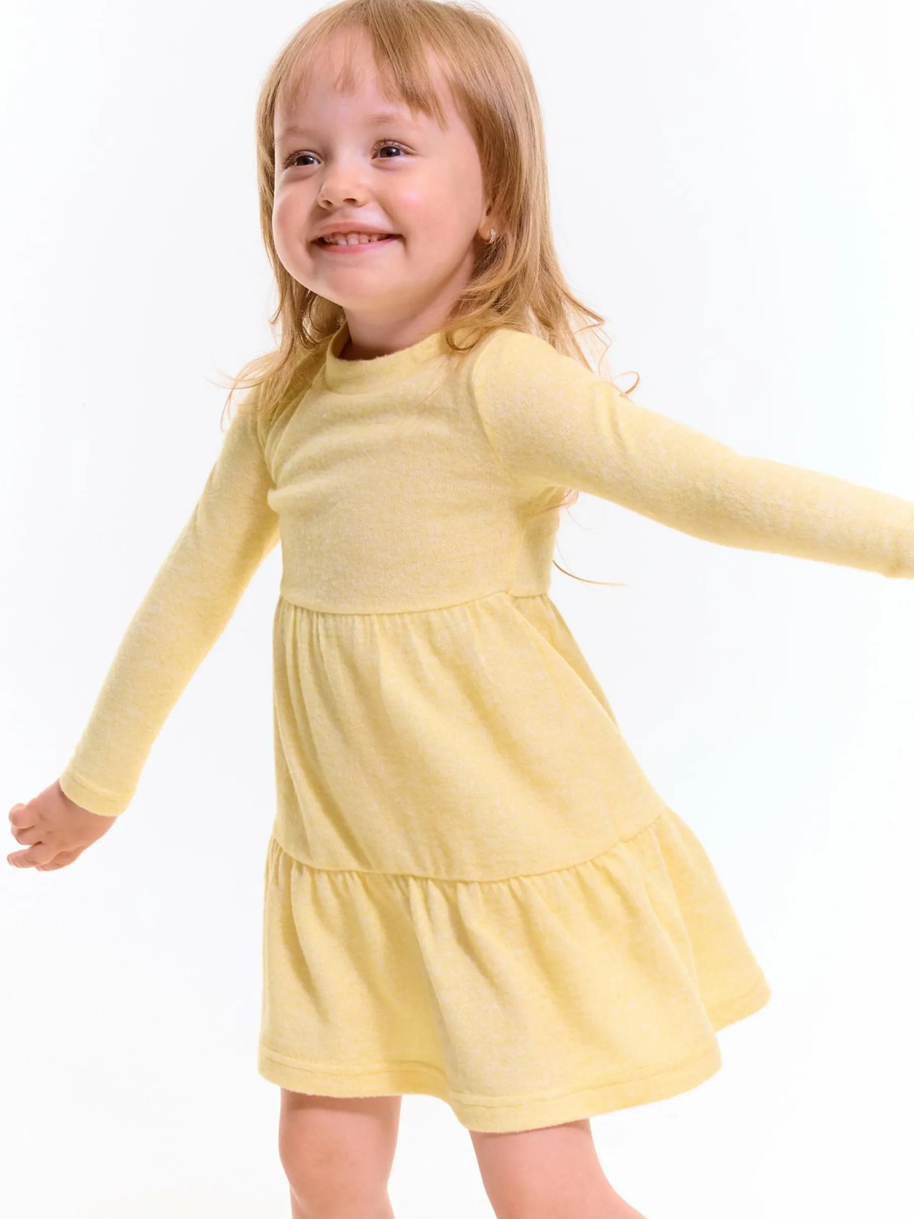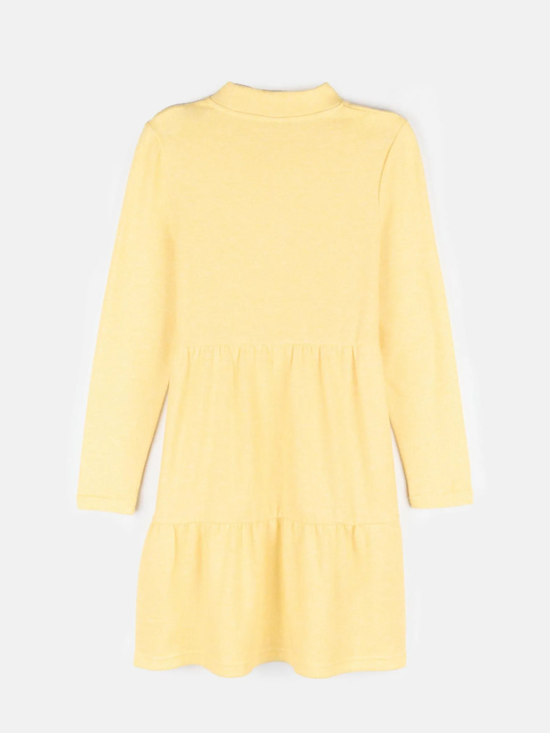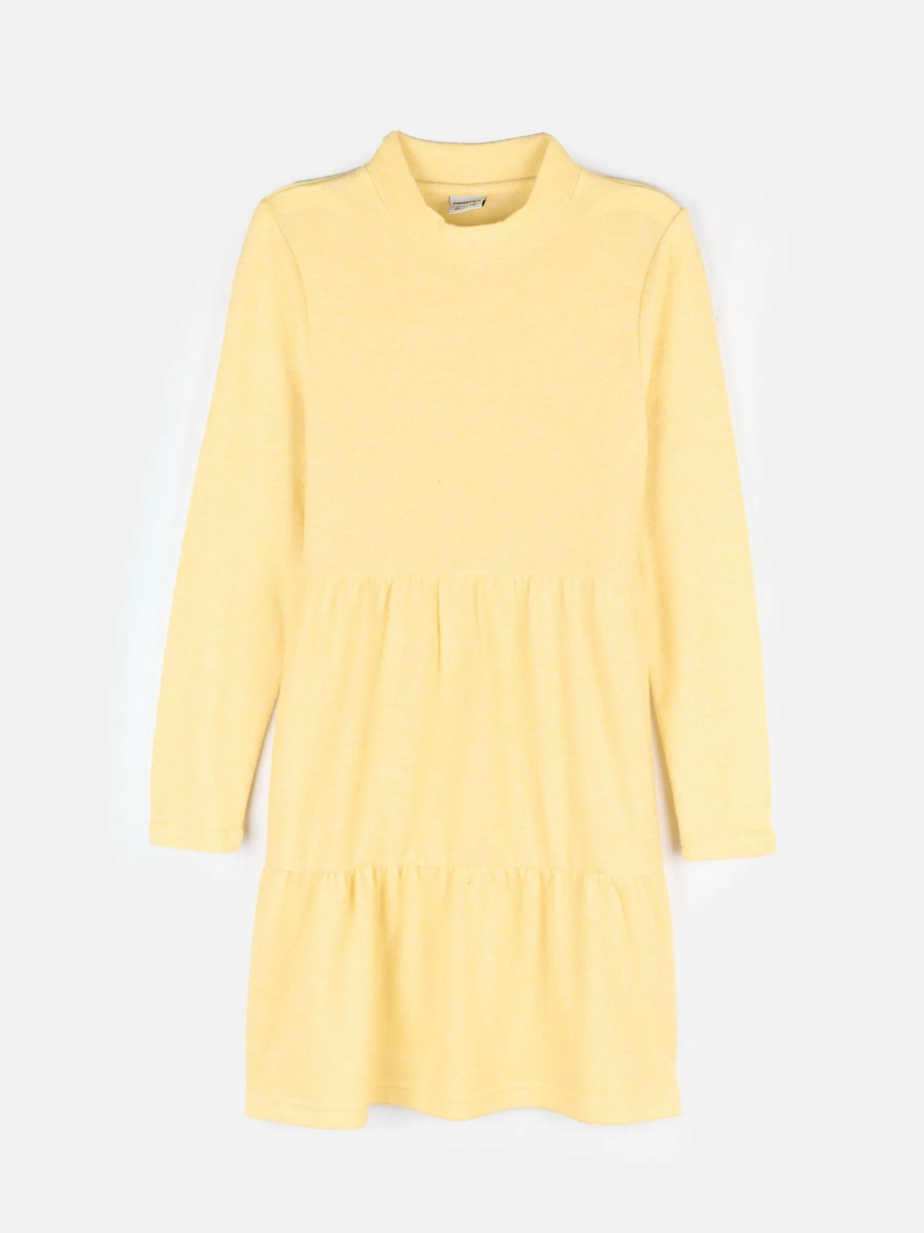 Kolor: żółtyKrój: z falbanąTyp: sukienkaRekaw: długi rękawDługość: miniPattern style: podświetlonyDetal: nad …