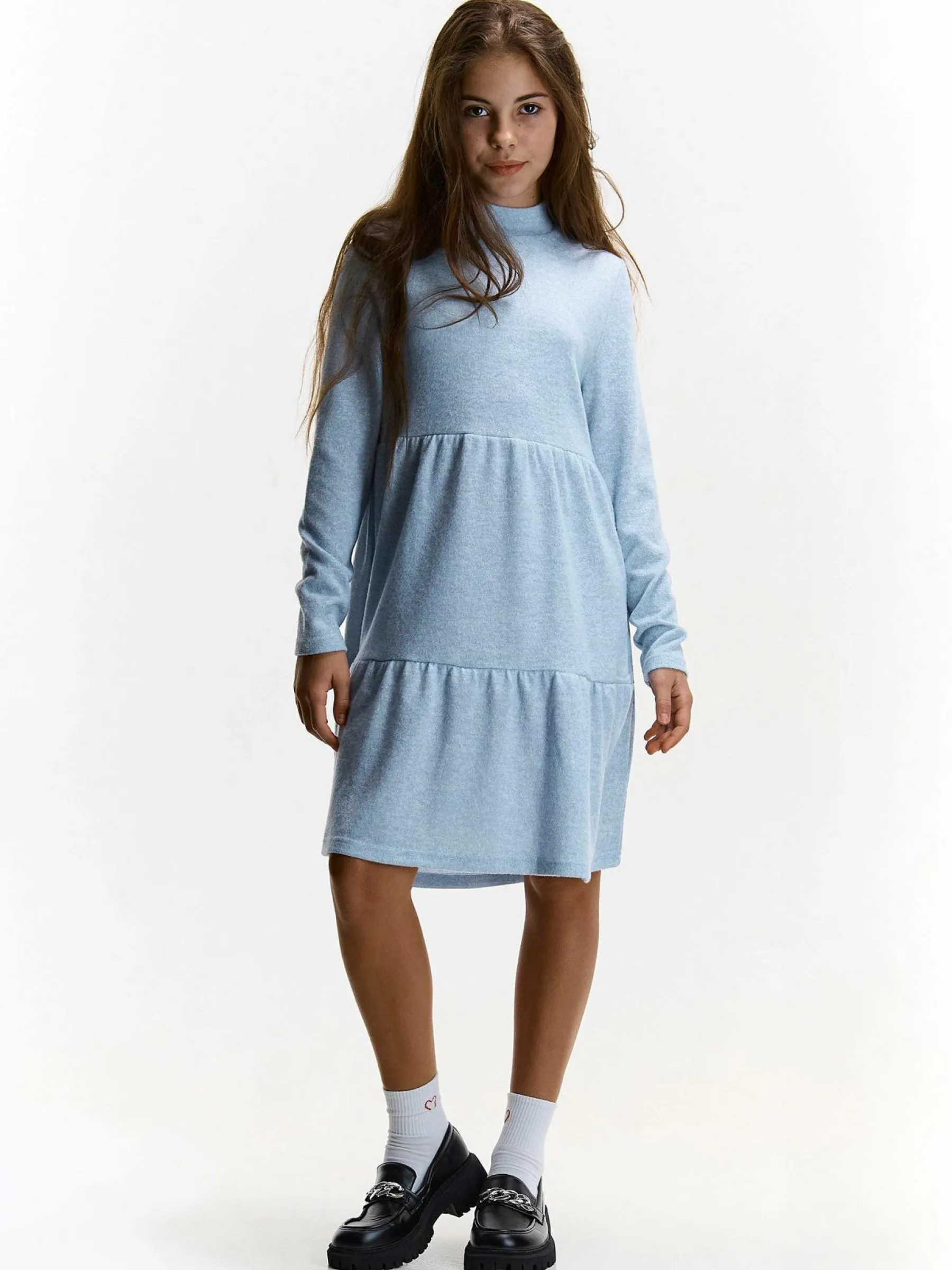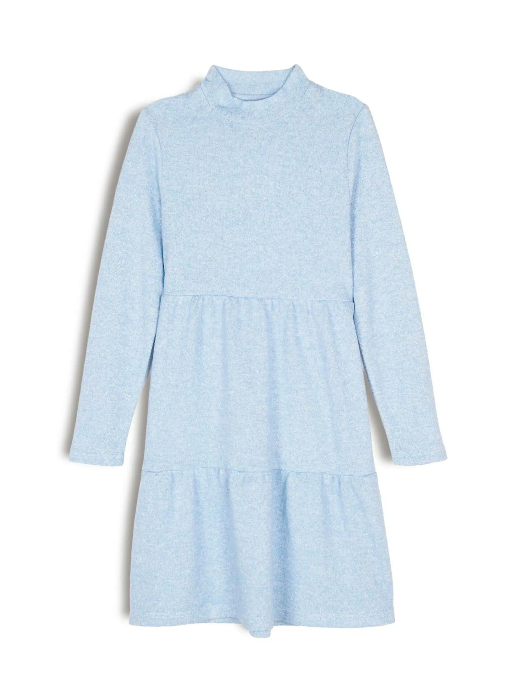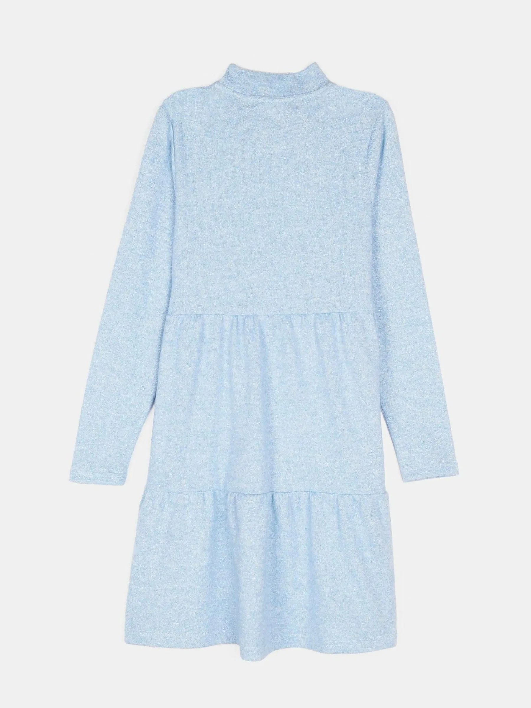 Kolor: niebieskiKrój: z falbanąTyp: sukienkaRekaw: długi rękawDługość: miniPattern style: podświetlonyDetal: nad…