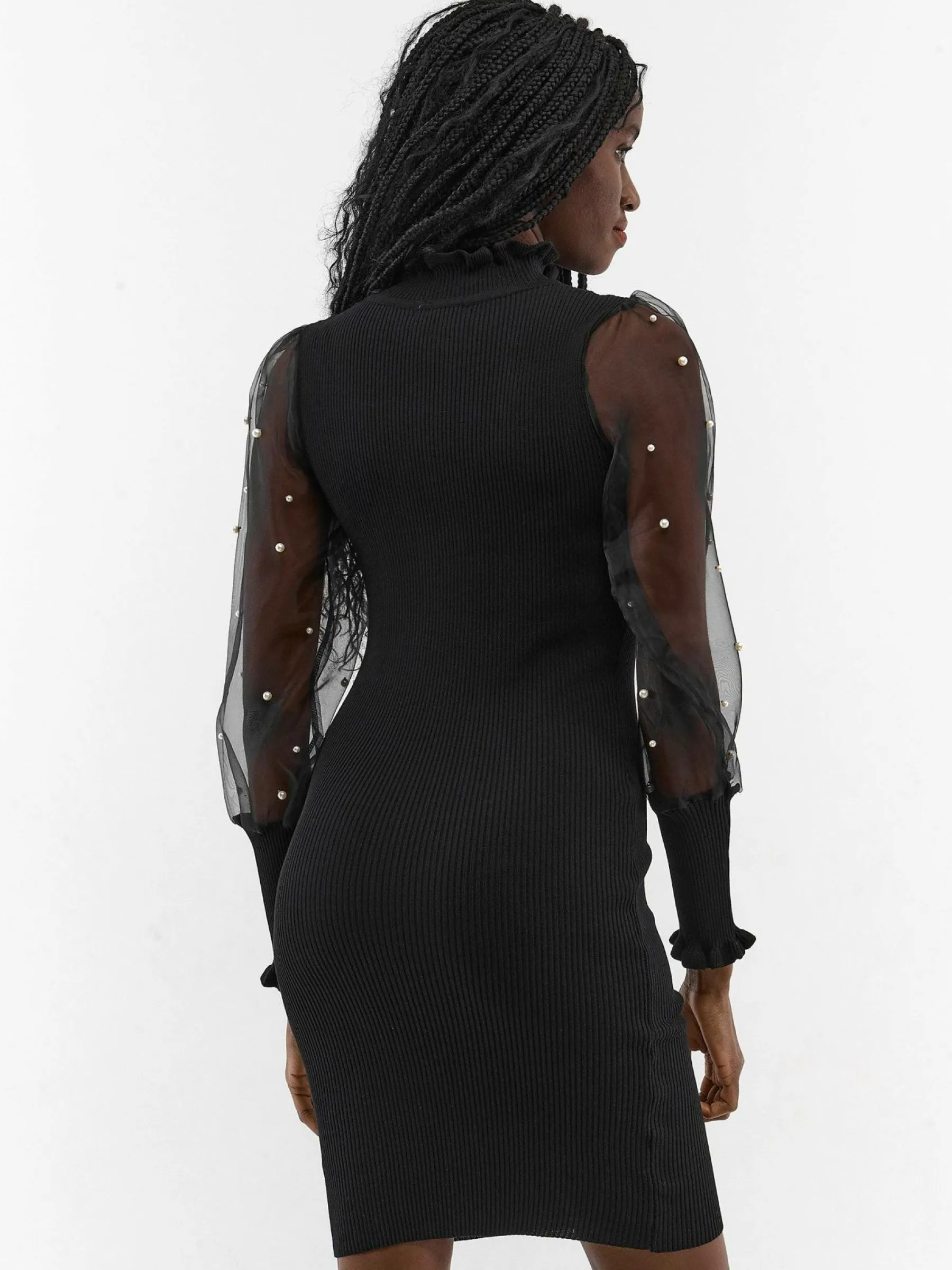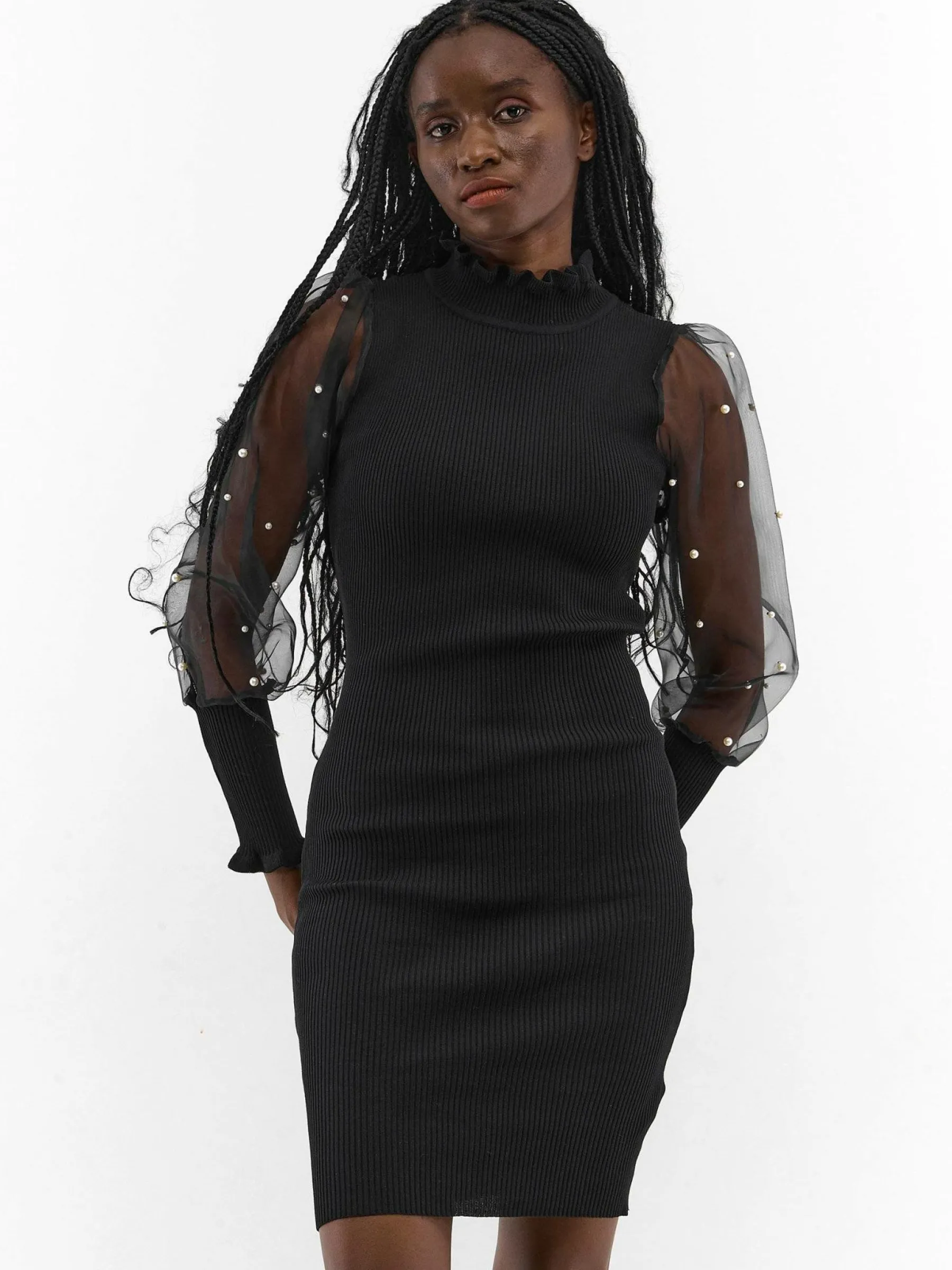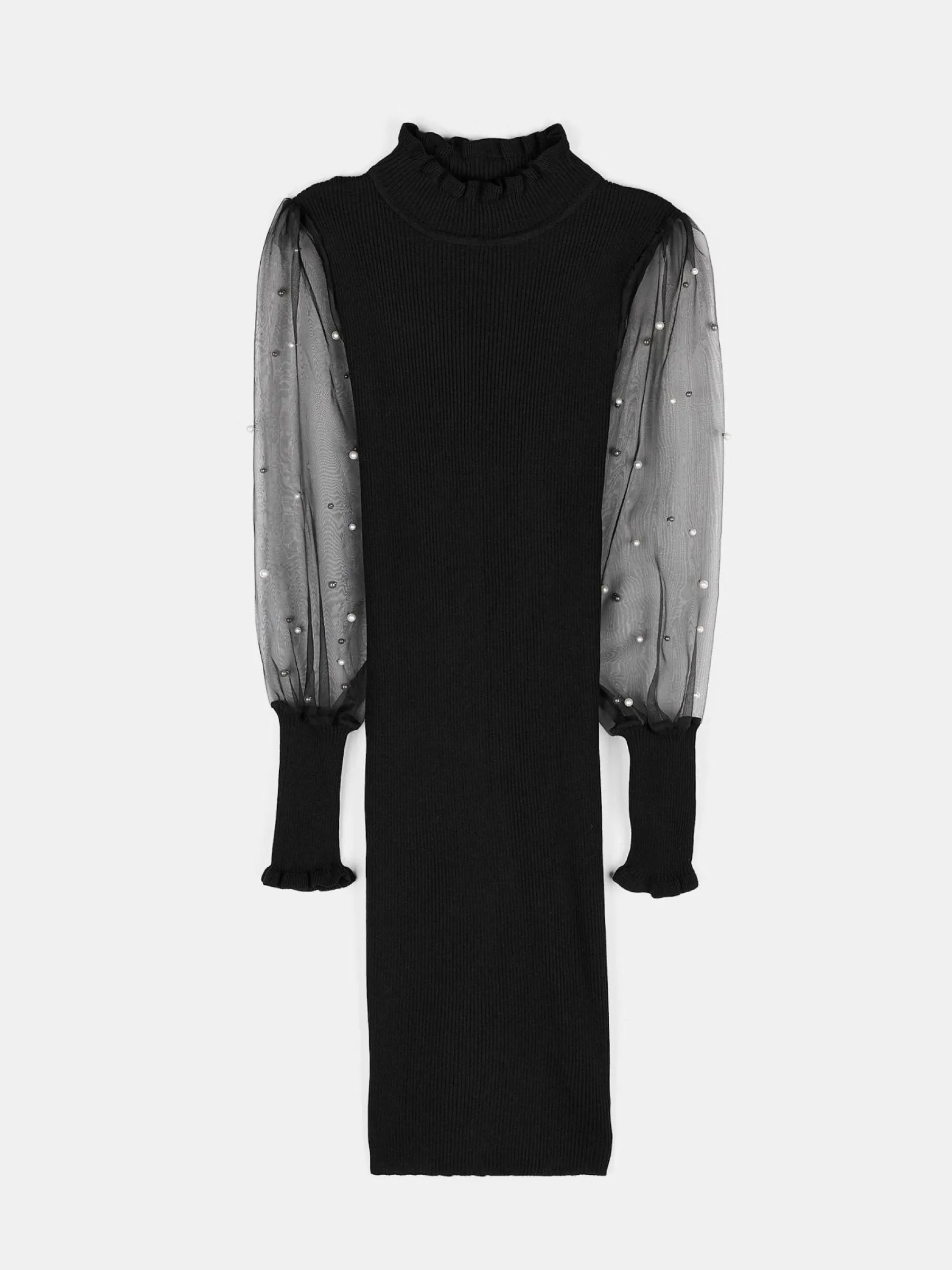 Kolor: czarnyKrój: slimTyp: sukienkaRekaw: długi rękawDługość: midiPattern style: pojedynczy kolor, żebrowanyDeta…