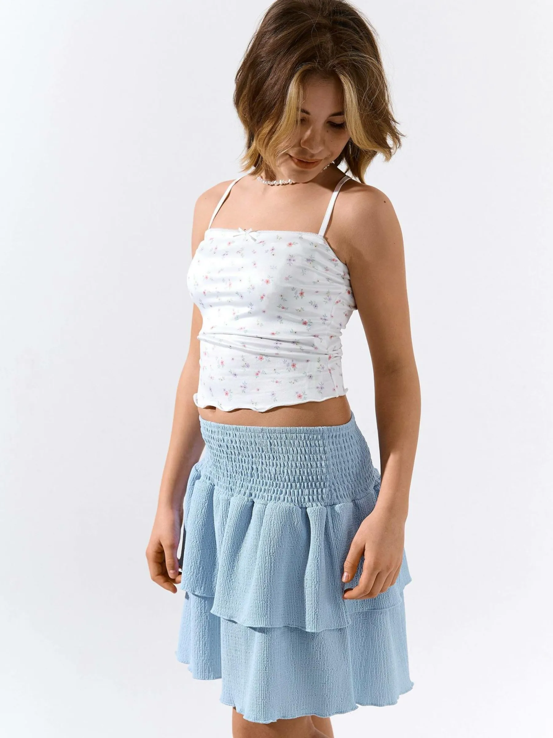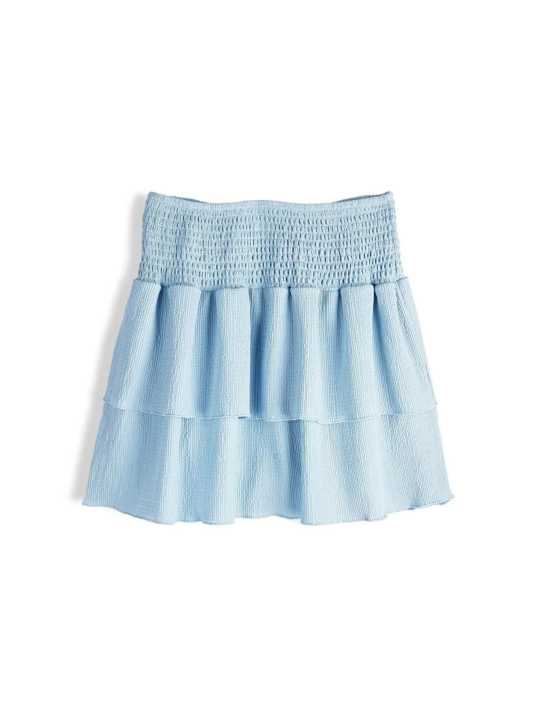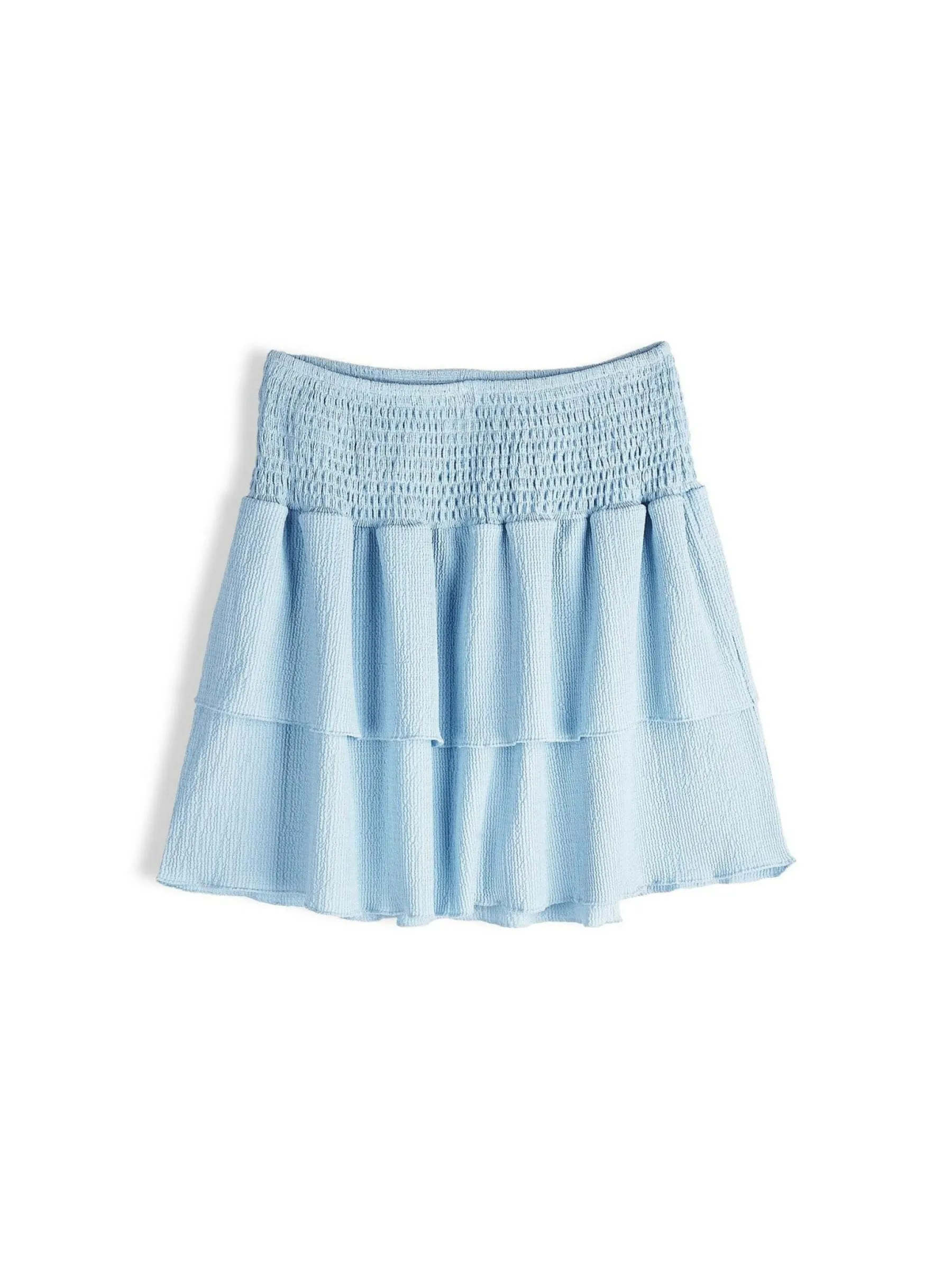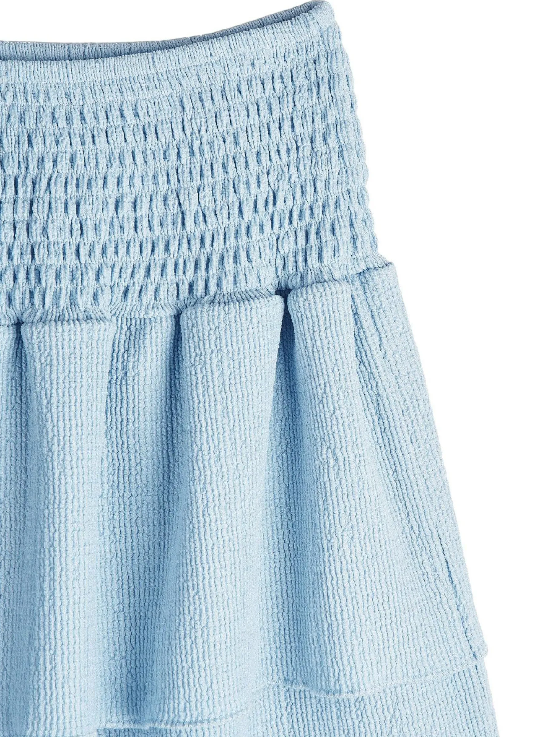 Kolor: niebieskiKrój: z falbanąTyp: spódnicaDługość: miniPattern style: pojedynczy kolorDetal: z elastyczną opask…