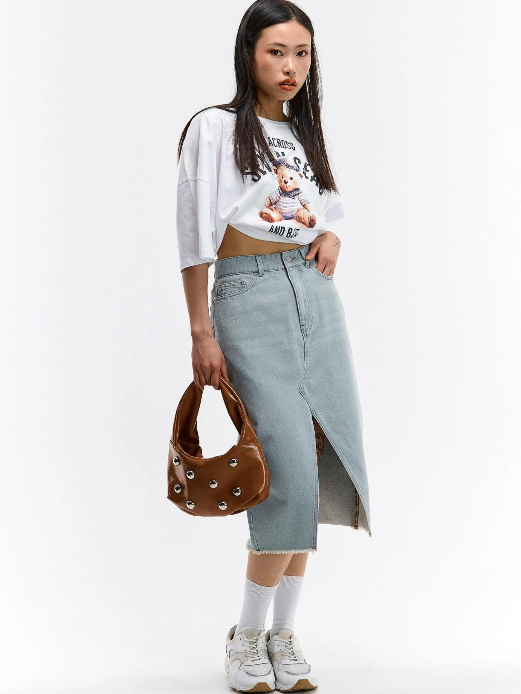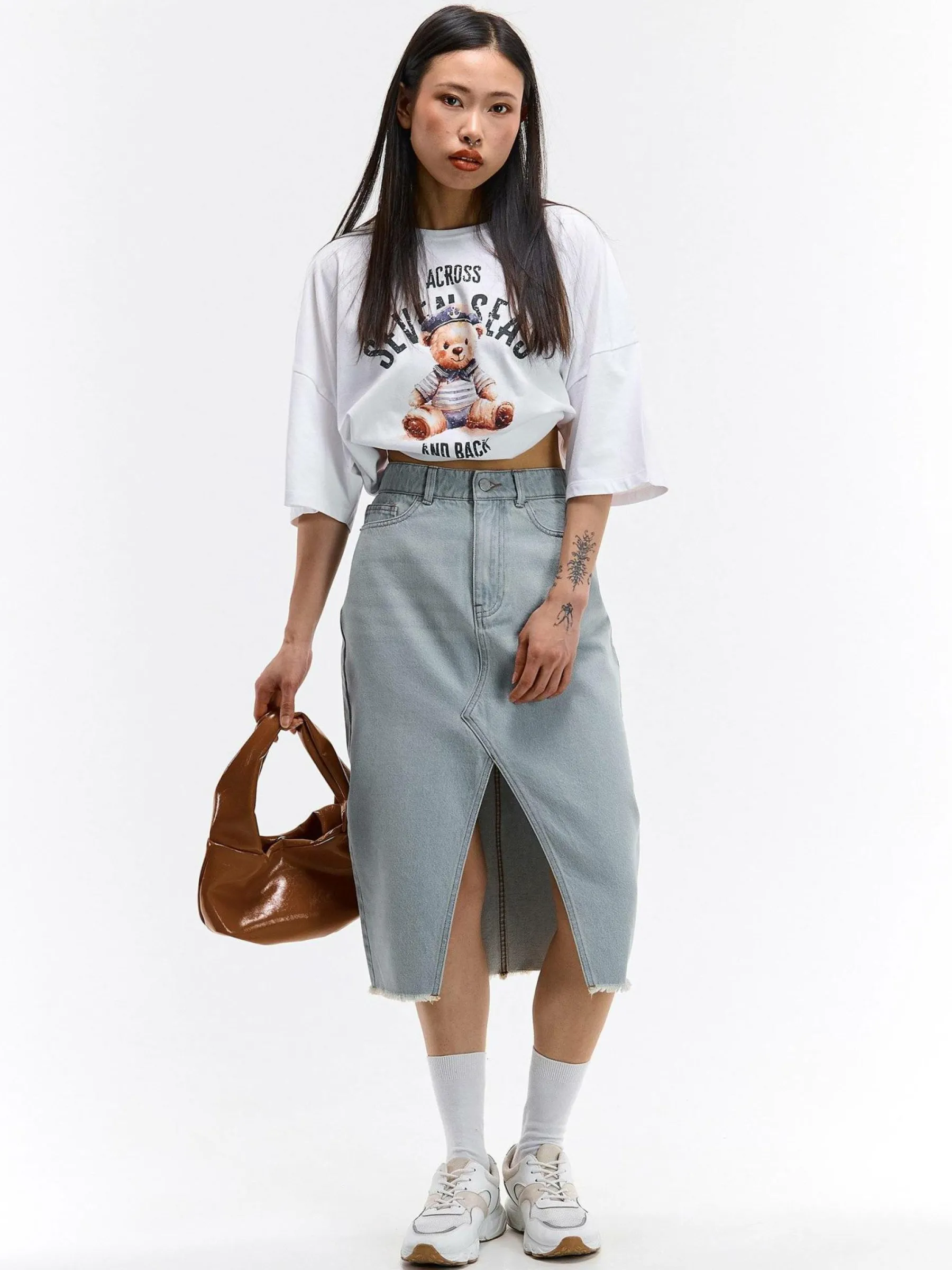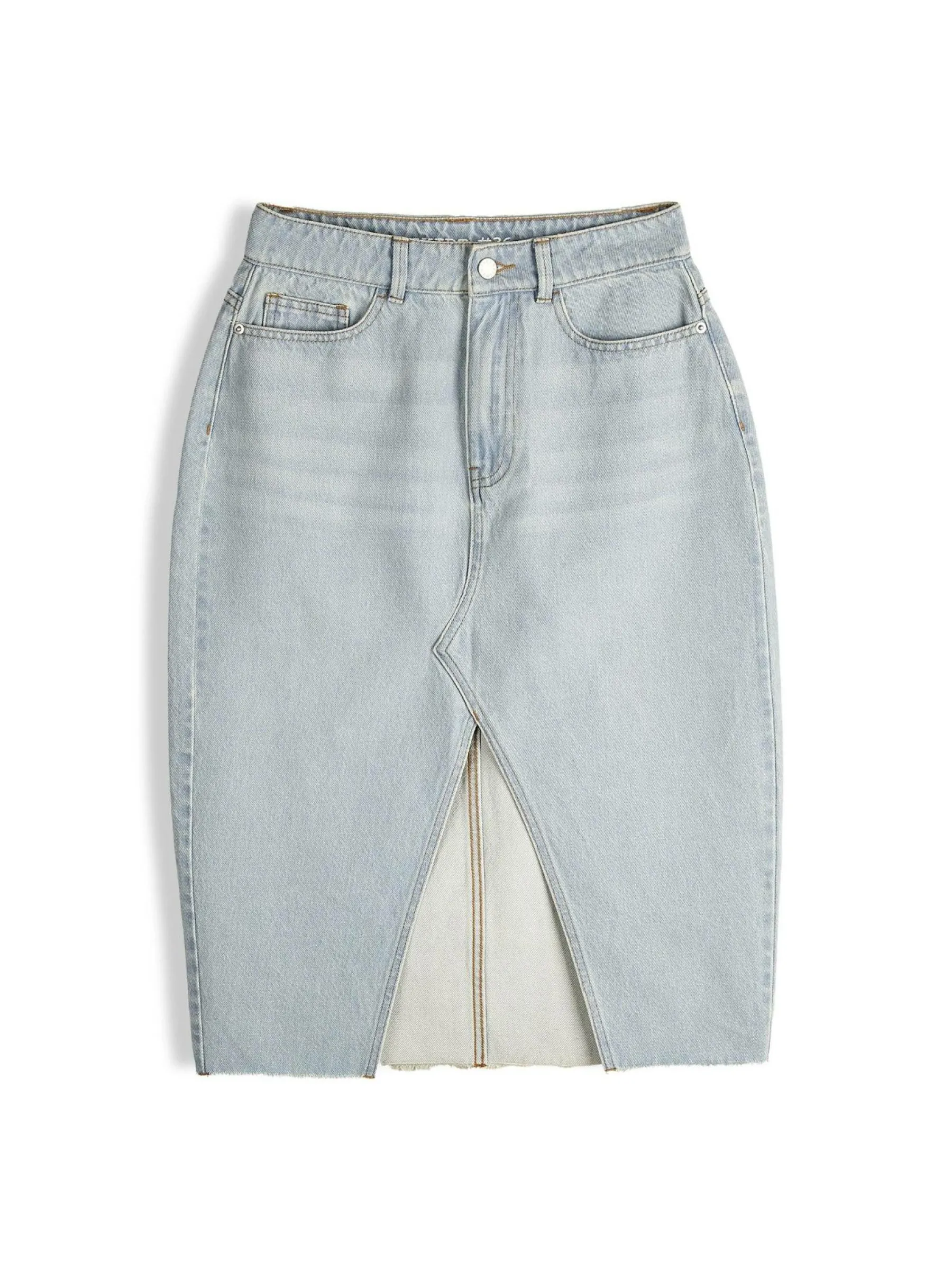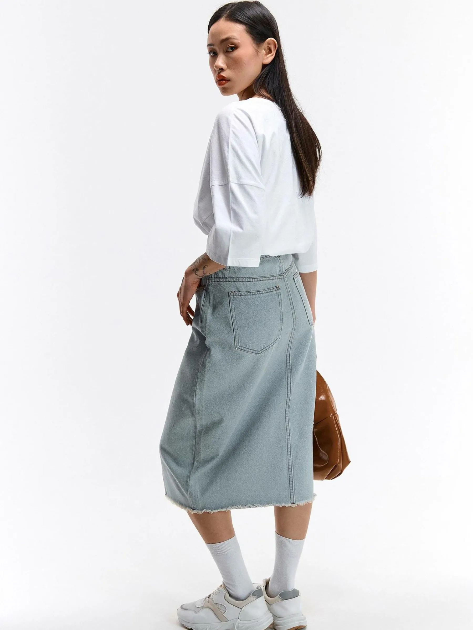 Kolor: niebieskiKrój: ołówkoweTyp: spódnicaDługość: midiPattern style: pojedynczy kolorDetal: na zamek, z rozcię…