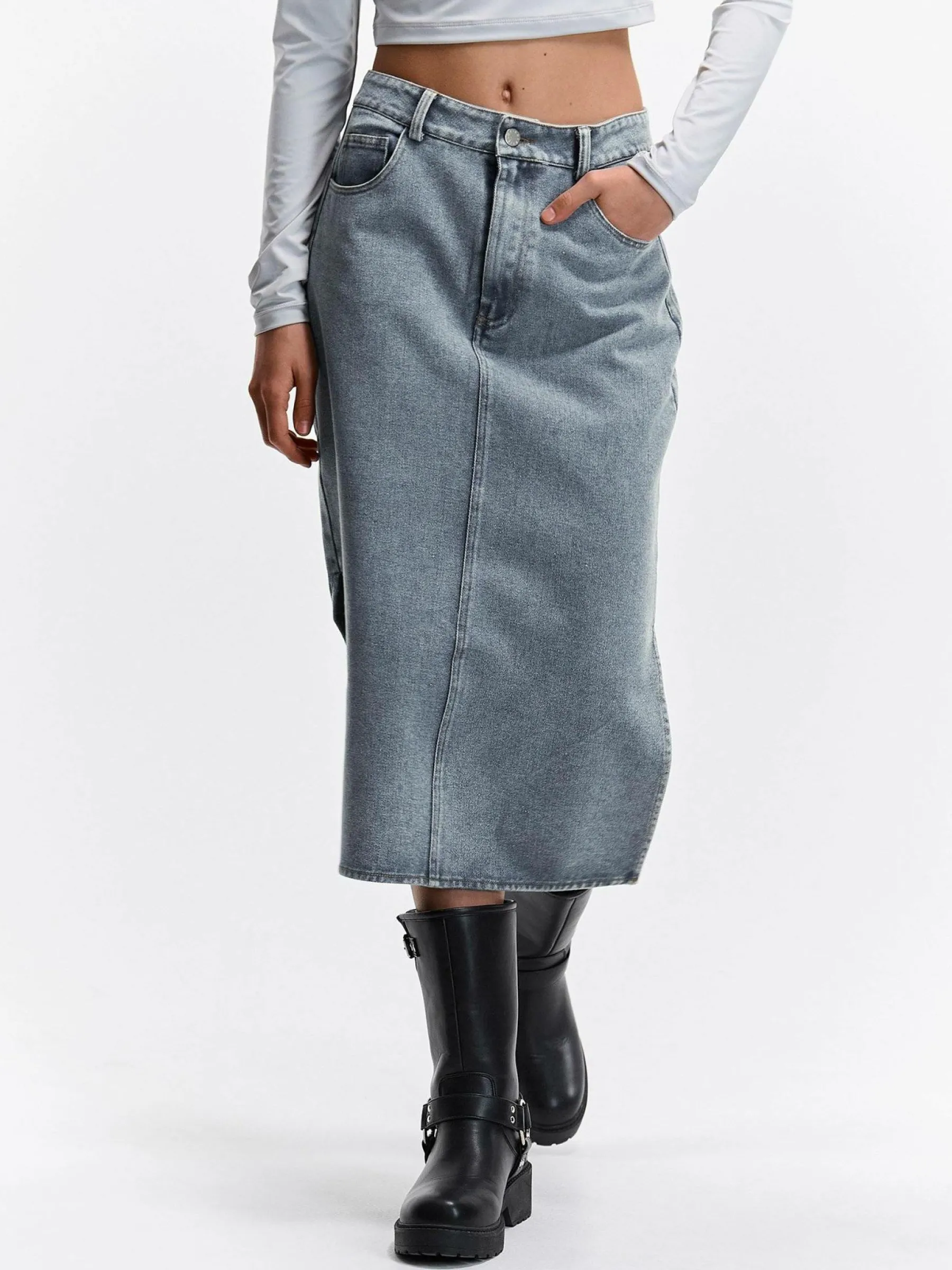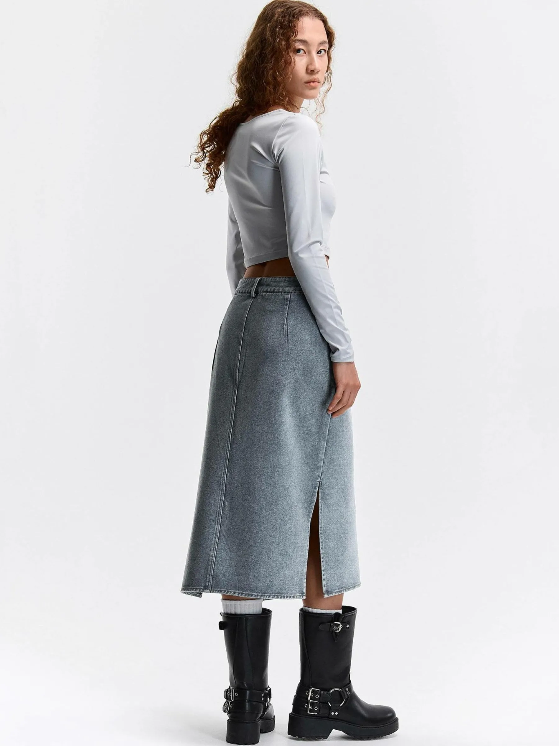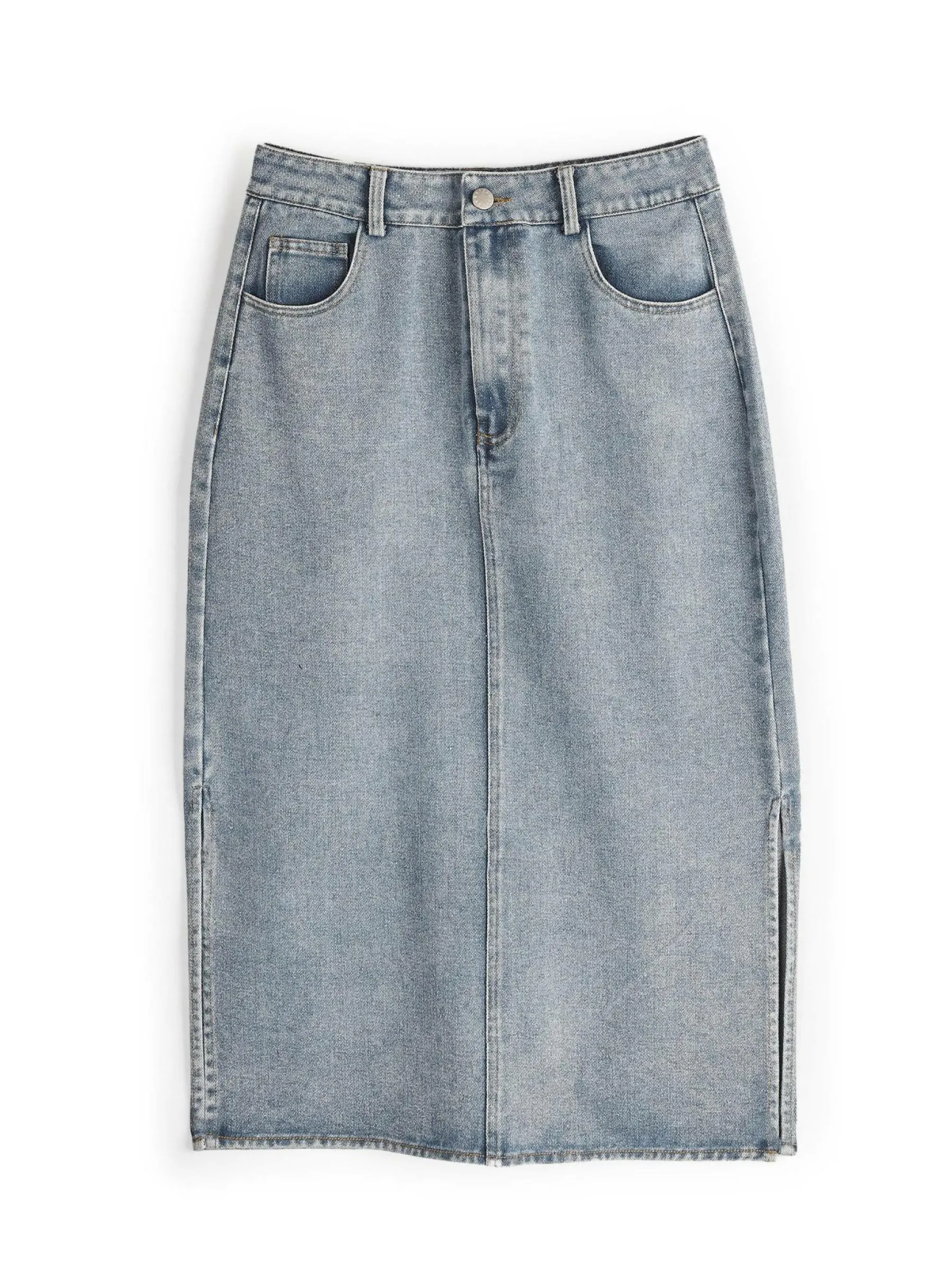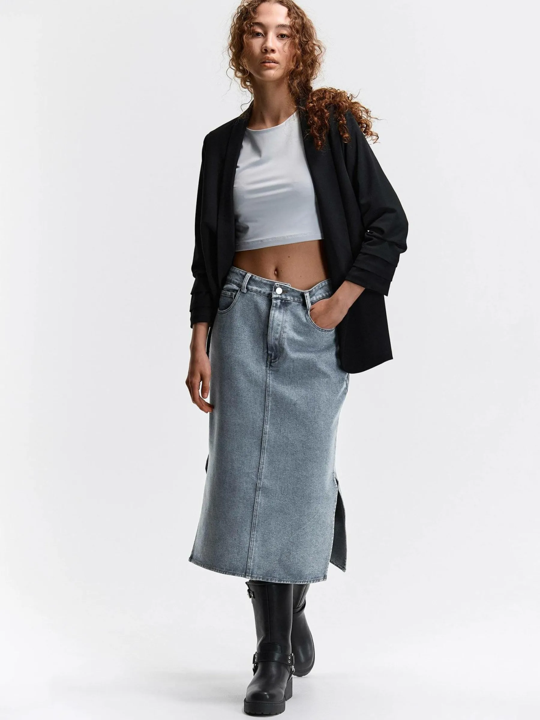 Kolor: niebieskiKrój: podstawowyTyp: spódnicaDługość: midiPattern style: pojedynczy kolorDetal: z rozcięciemMateri…