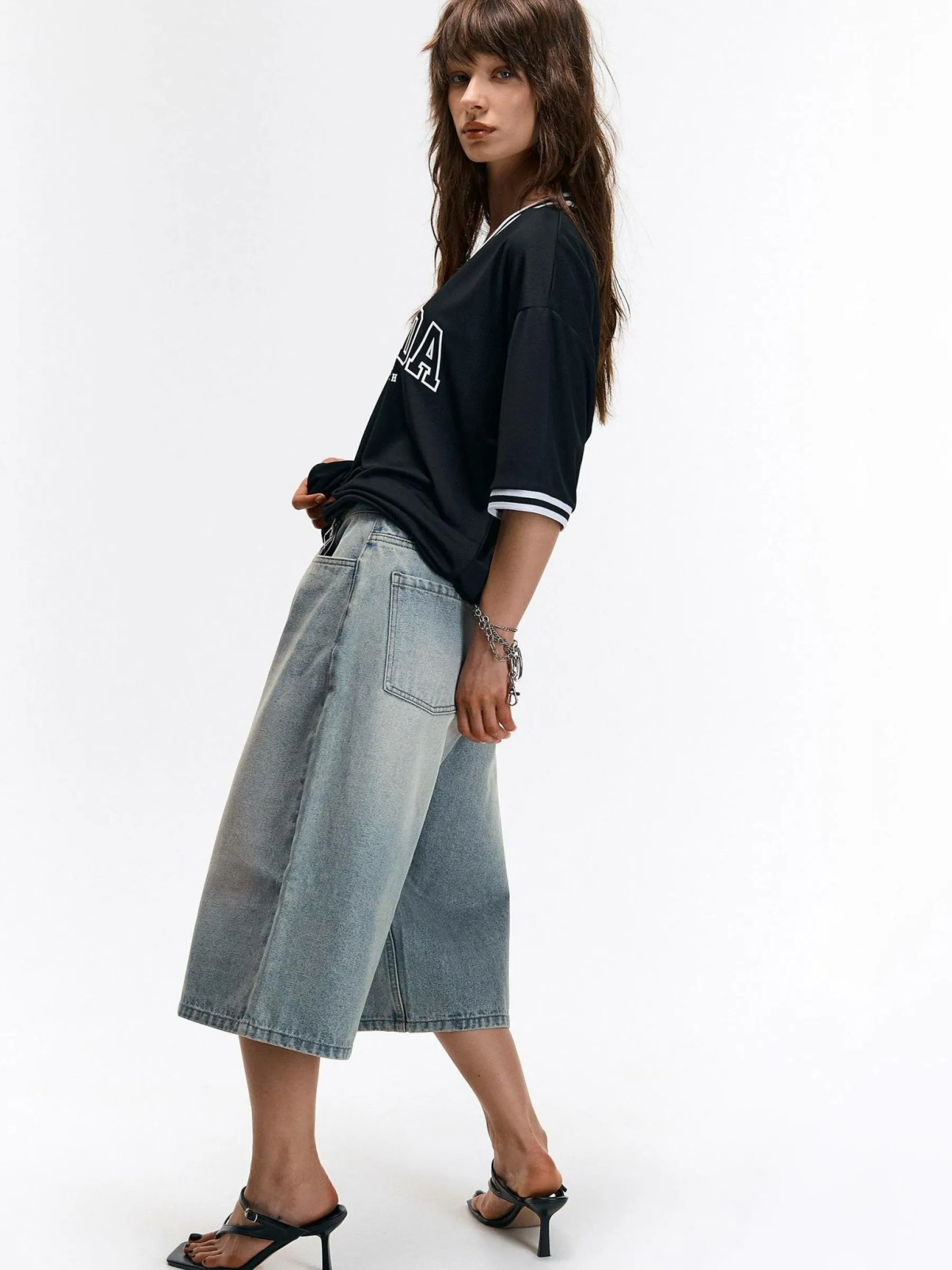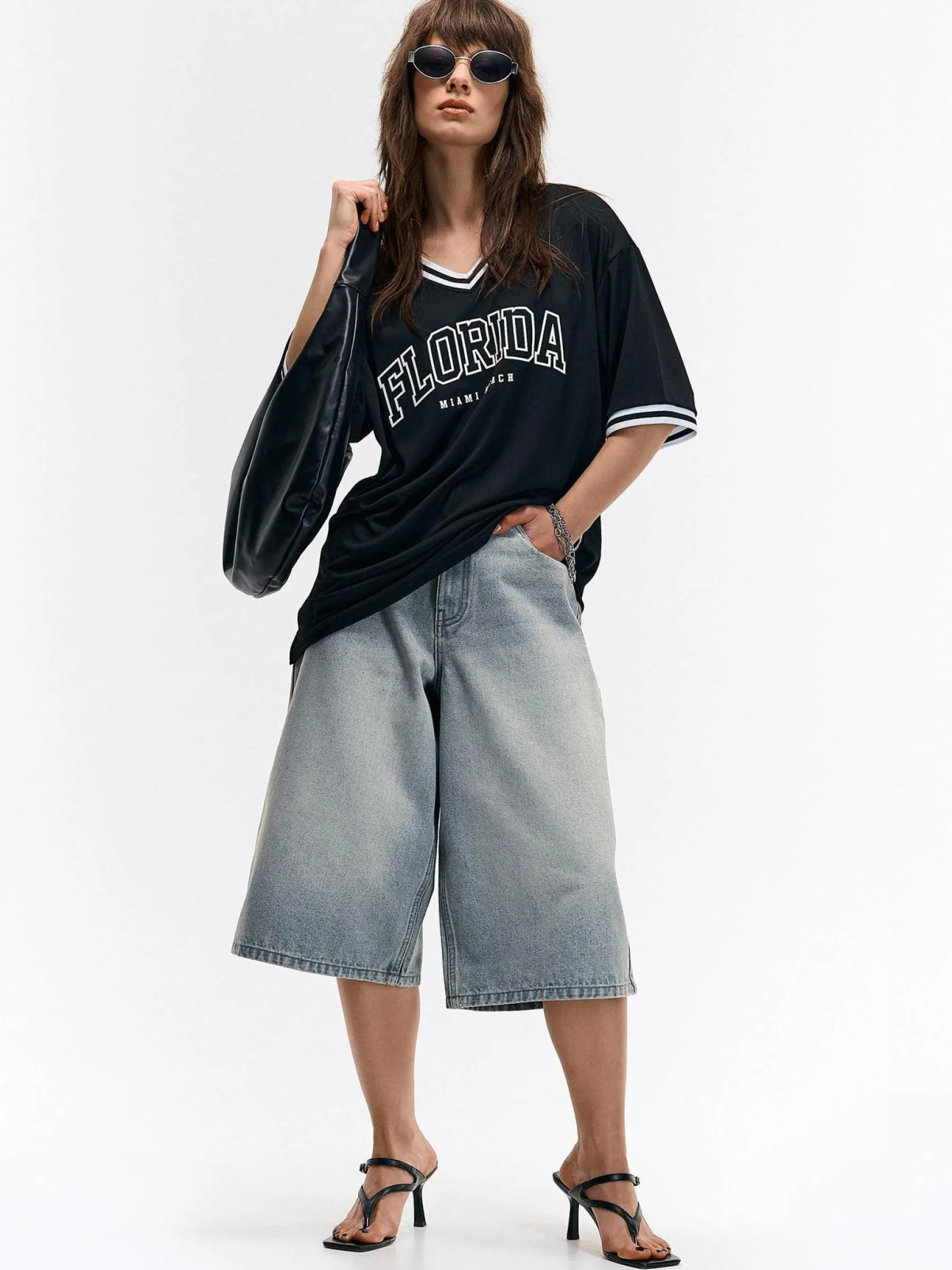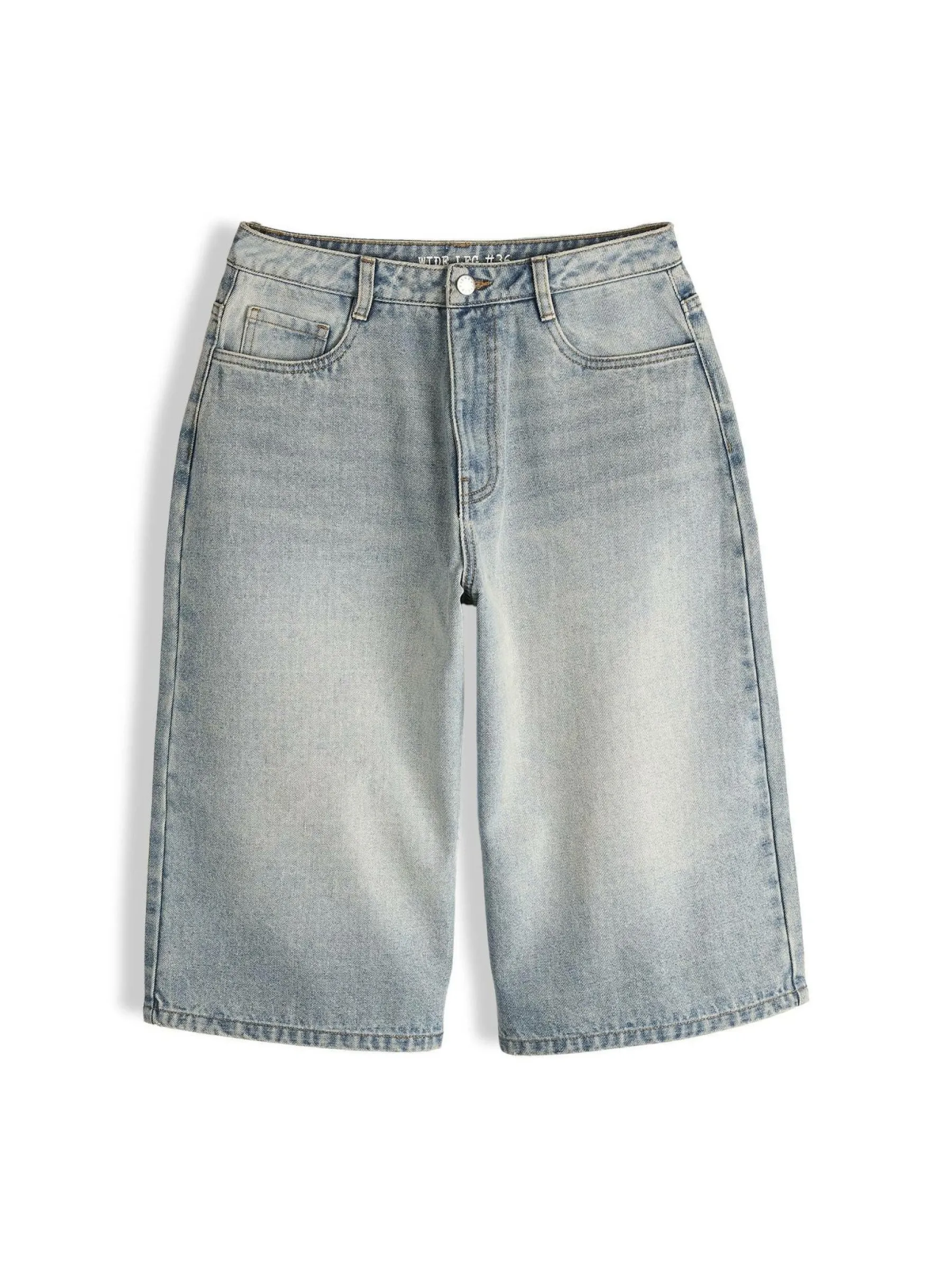 Kolor: niebieskiKrój: szerokie, z wysokim stanemTyp: spodenkiDługość: krótkiPattern style: pojedynczy kolorDetal: n…