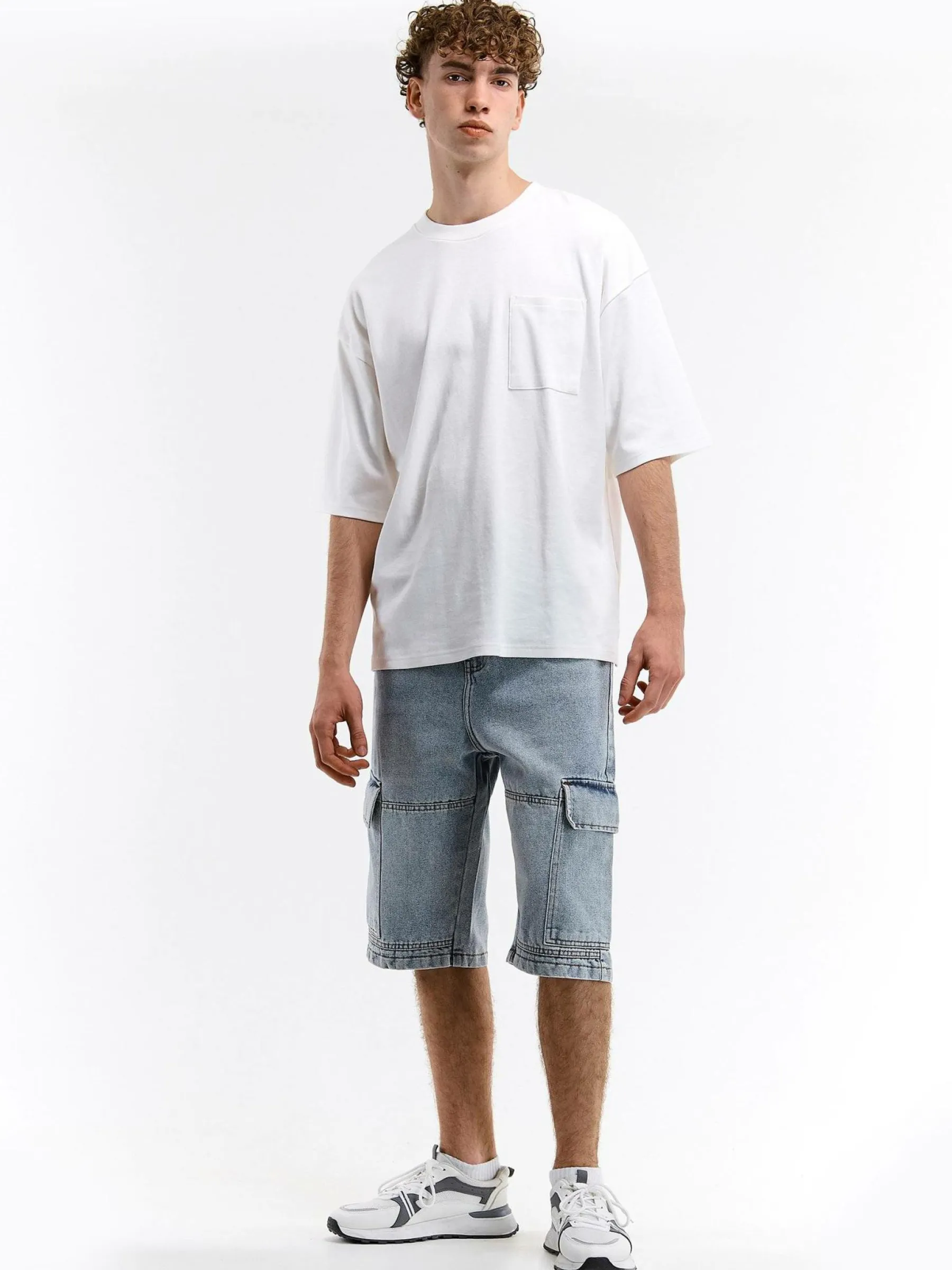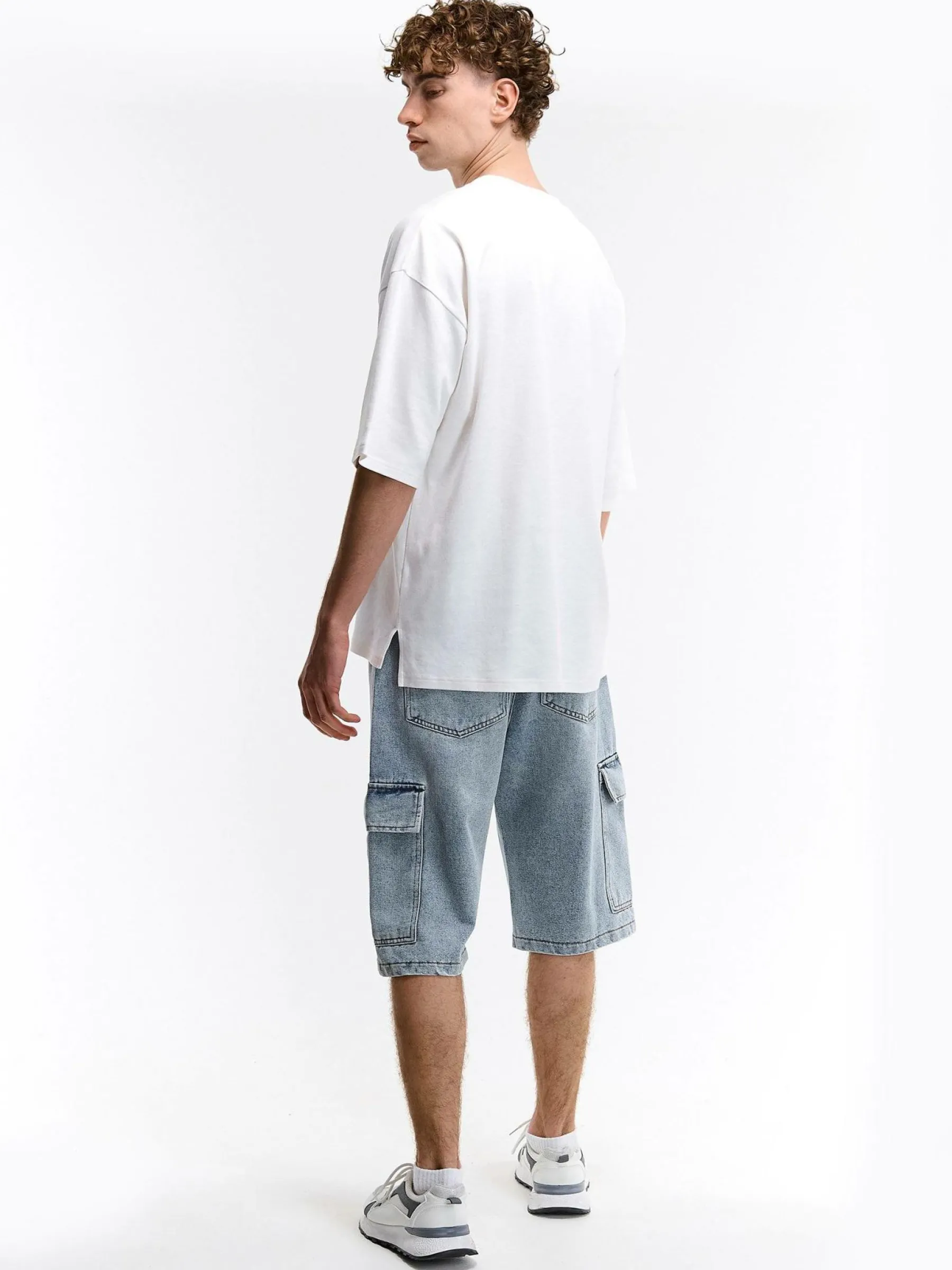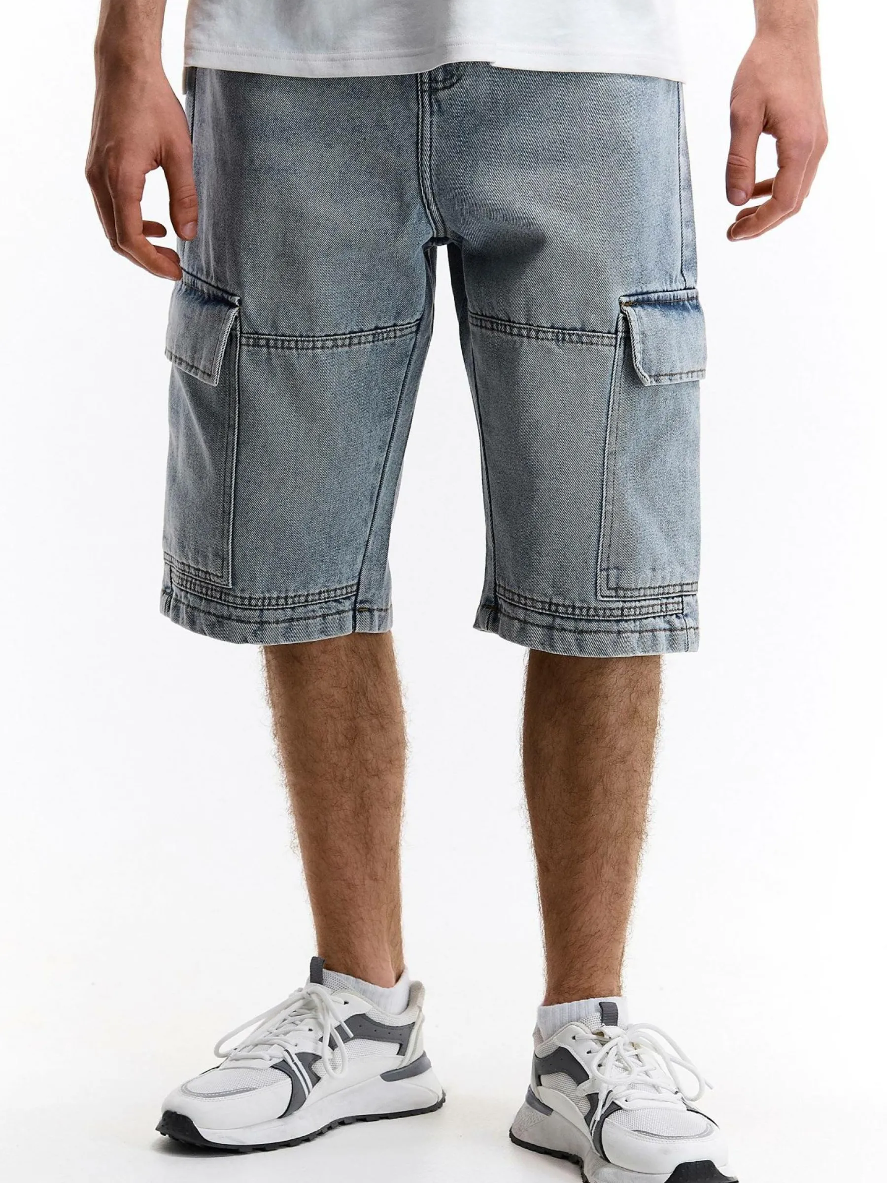 Kolor: niebieskiKrój: cargoTyp: spodenkiDługość: krótkiPattern style: pojedynczy kolorDetal: na zamek, z kieszeniam…