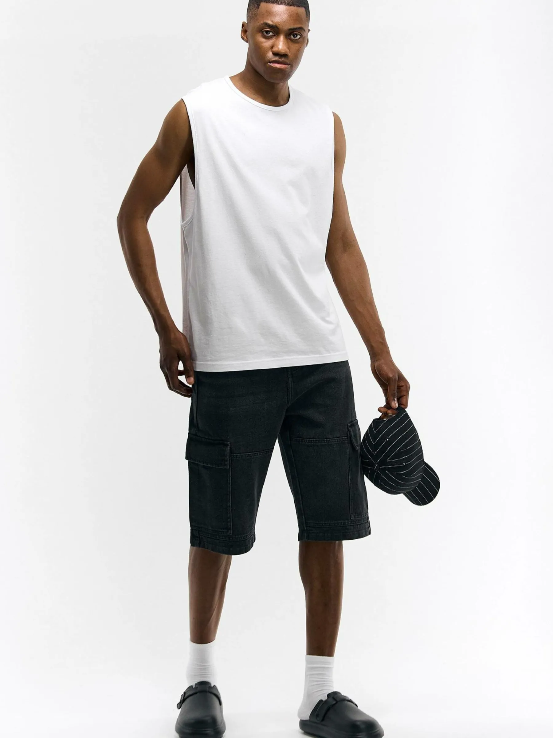 Kolor: czarnyKrój: cargoTyp: spodenkiDługość: krótkiPattern style: pojedynczy kolorDetal: na zamek, z kieszeniamiMa…