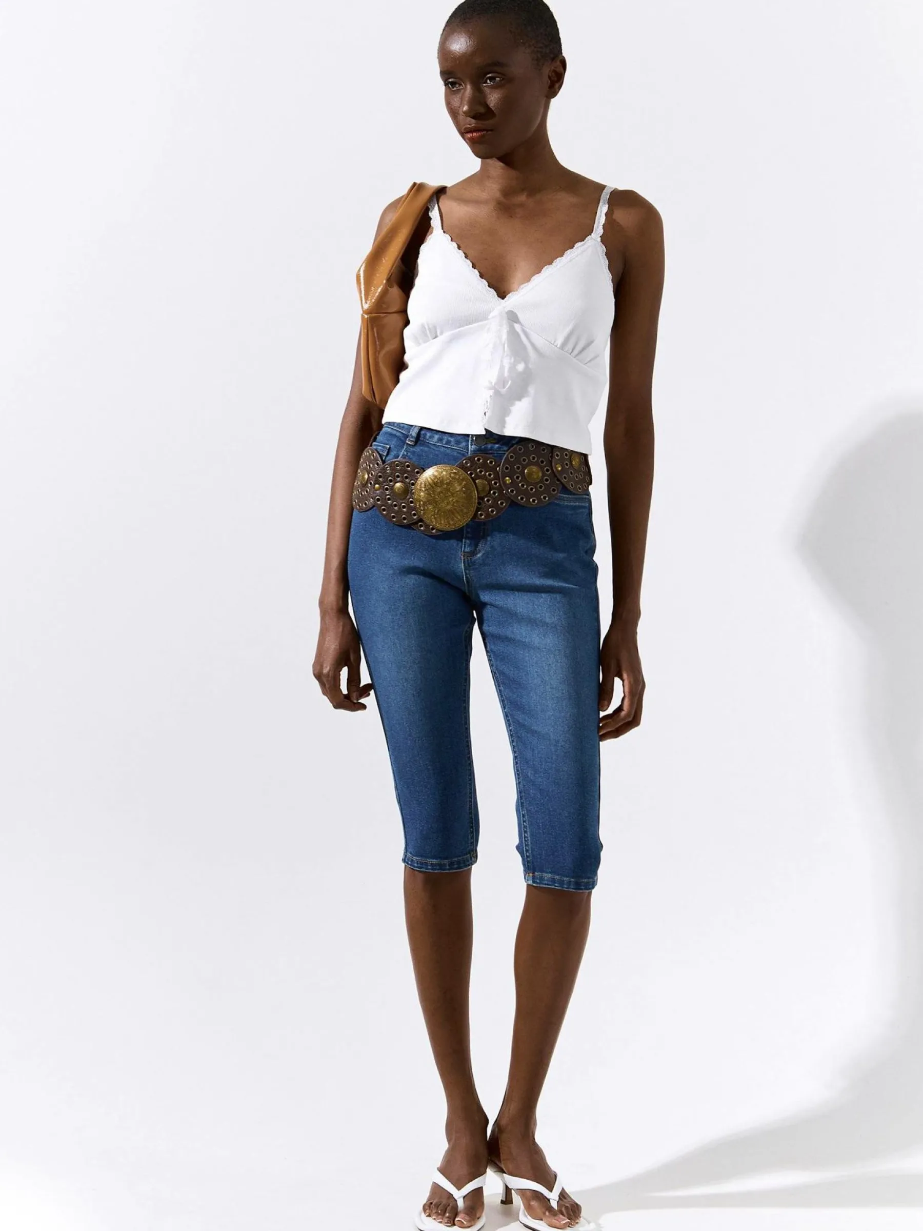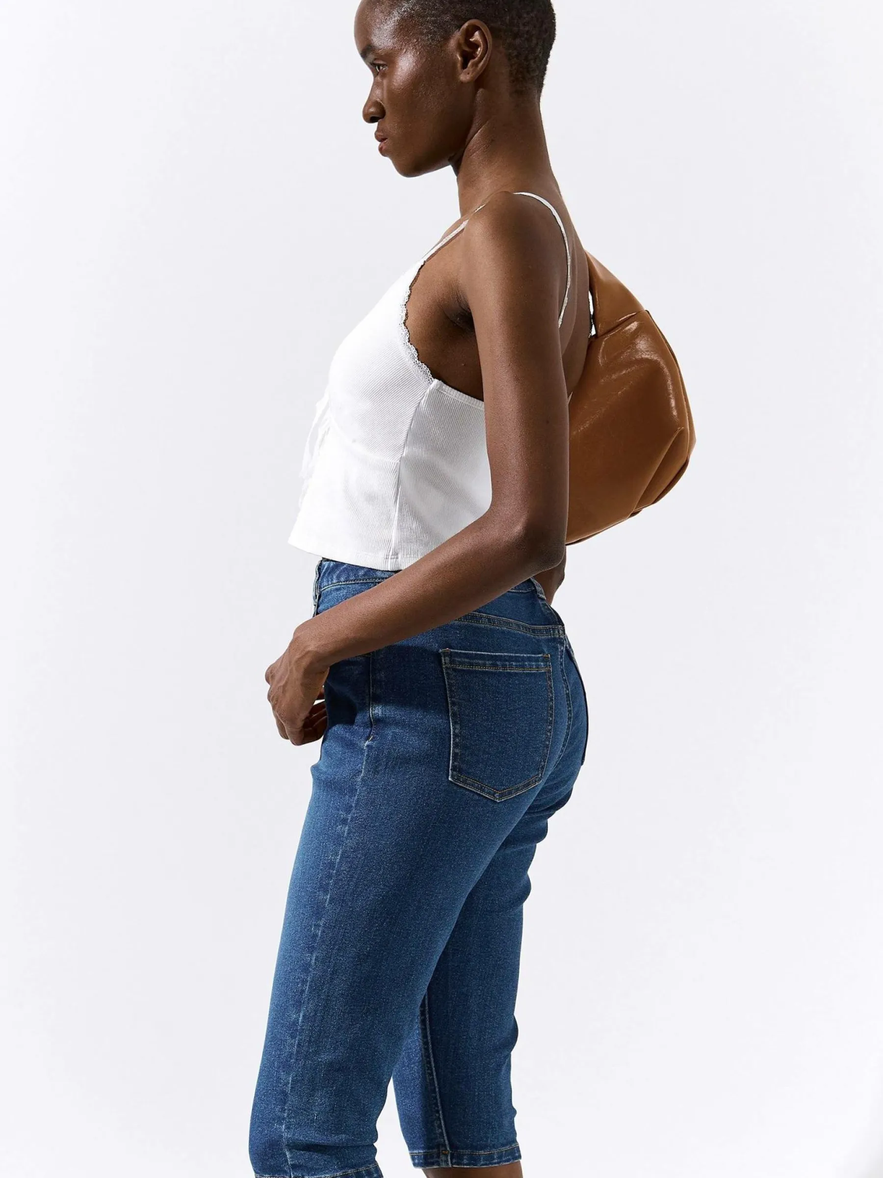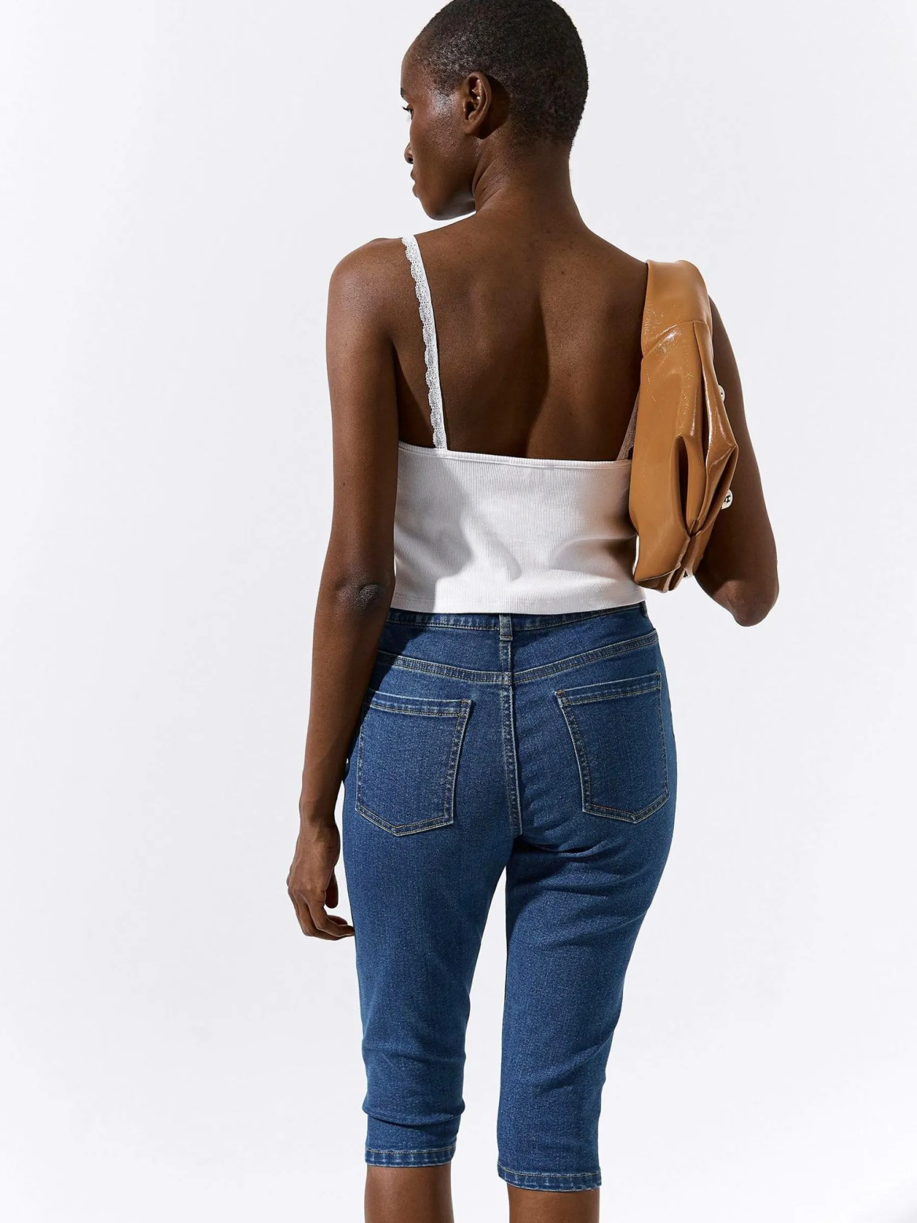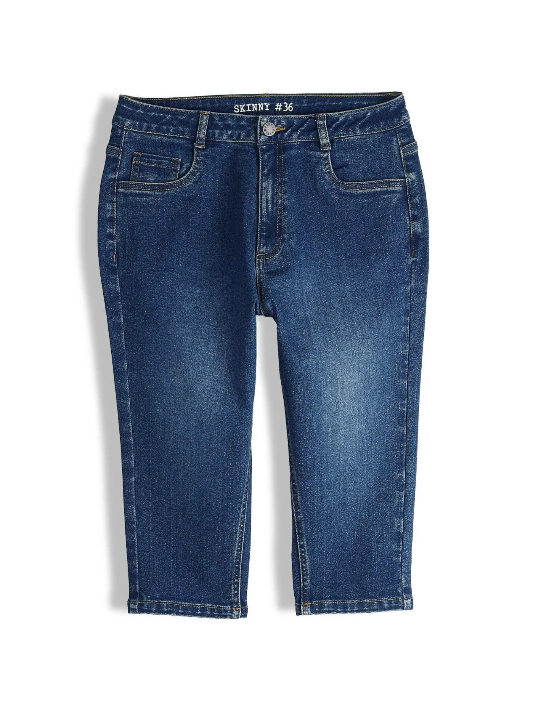 Kolor: niebieskiKrój: skinnyTyp: jeansDługość: trzy czwartePattern style: pojedynczy kolorDetal: na zamekMateriał: …