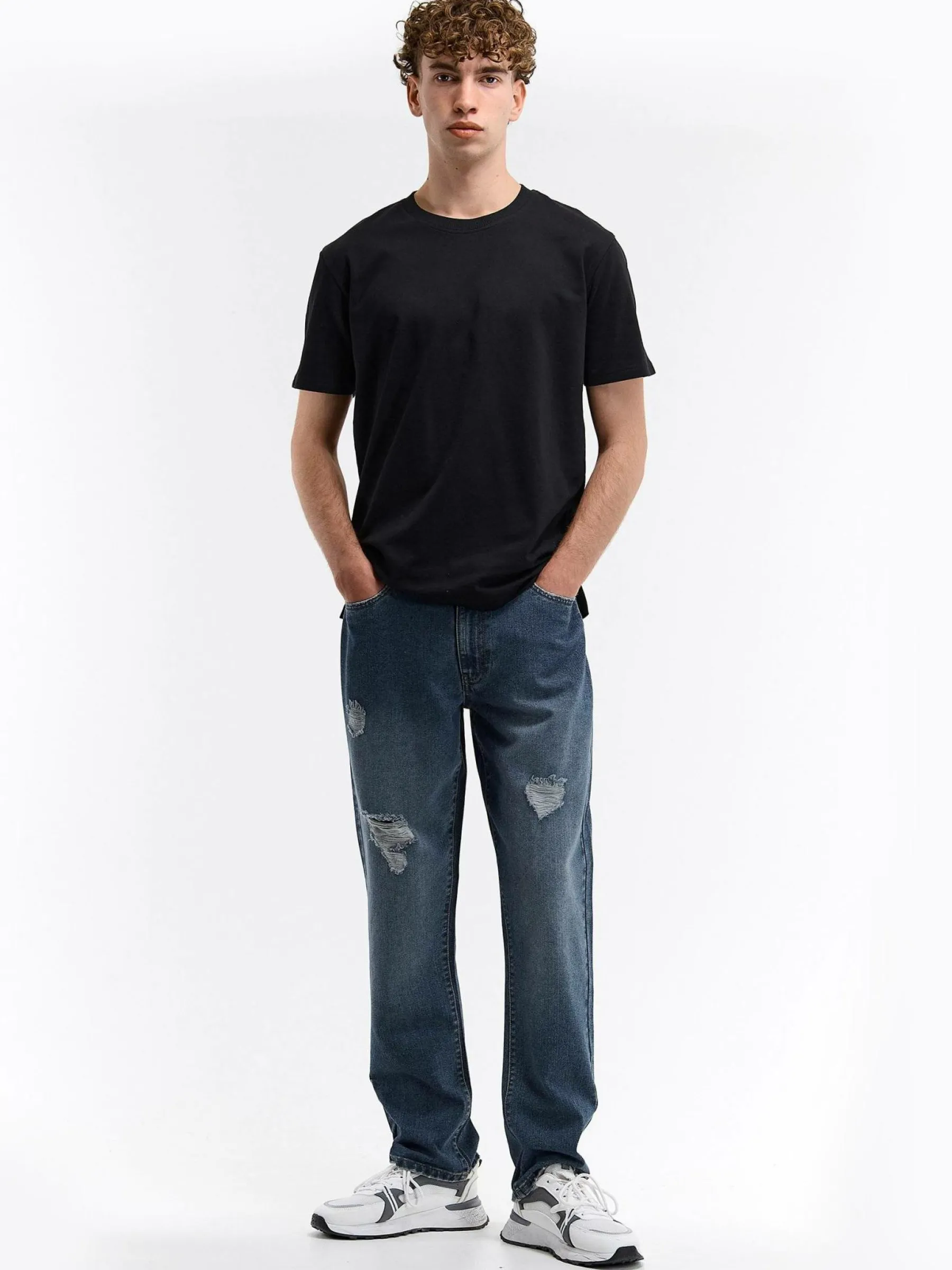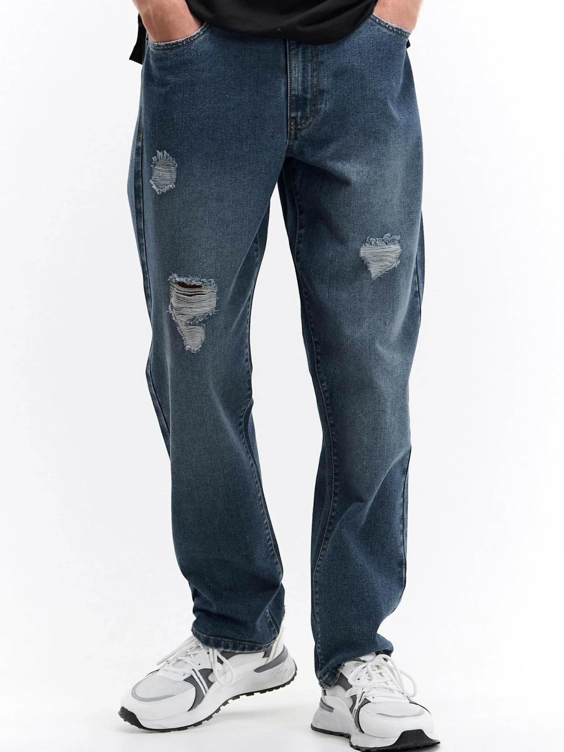 Kolor: granatowyKrój: straightTyp: jeansDługość: dlugiePattern style: pojedynczy kolorDetal: na zamek, z otworami, z…