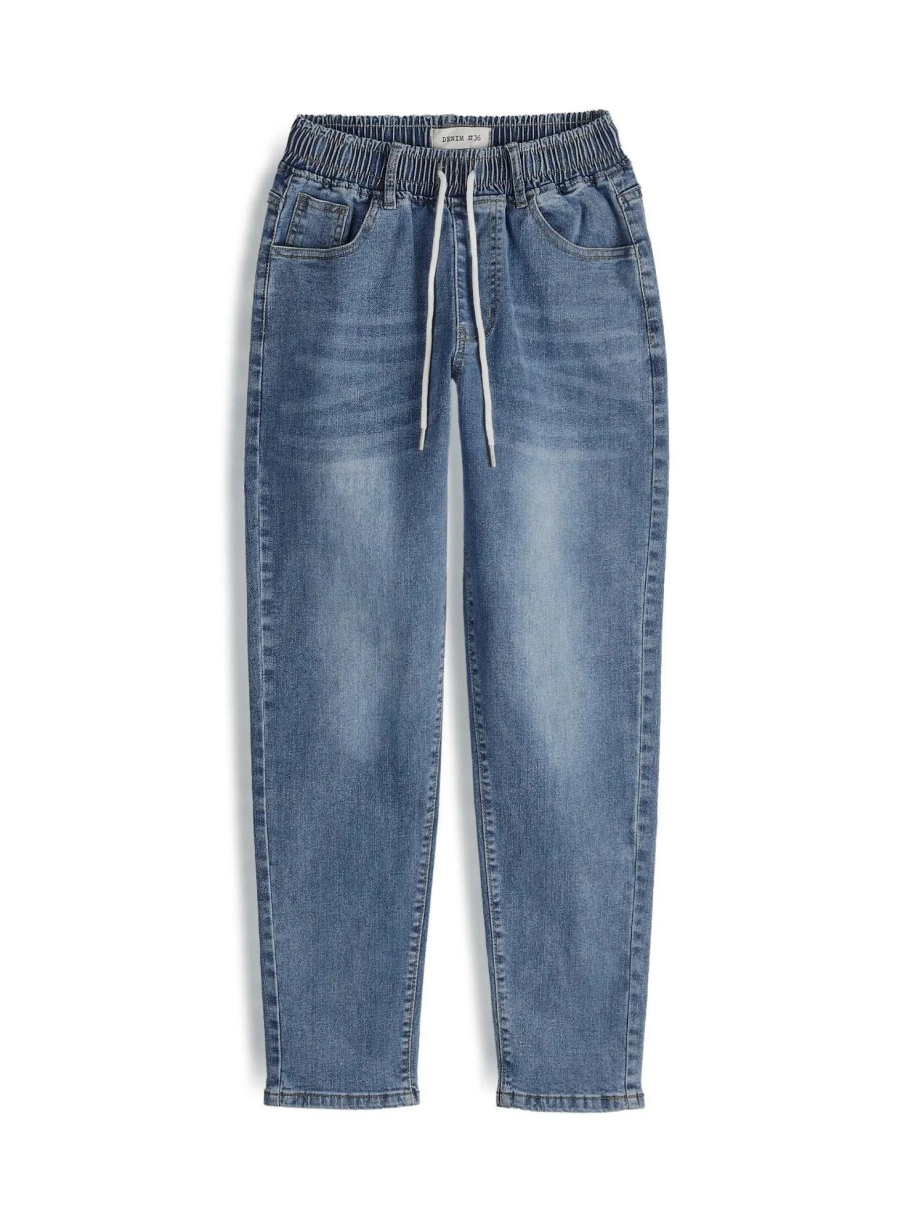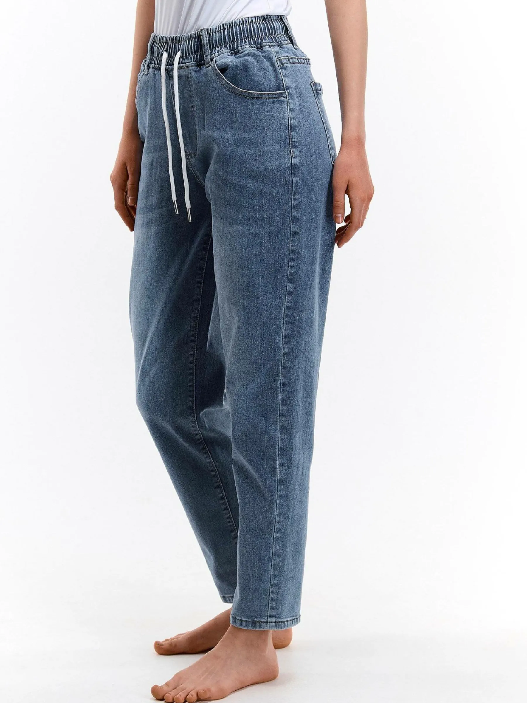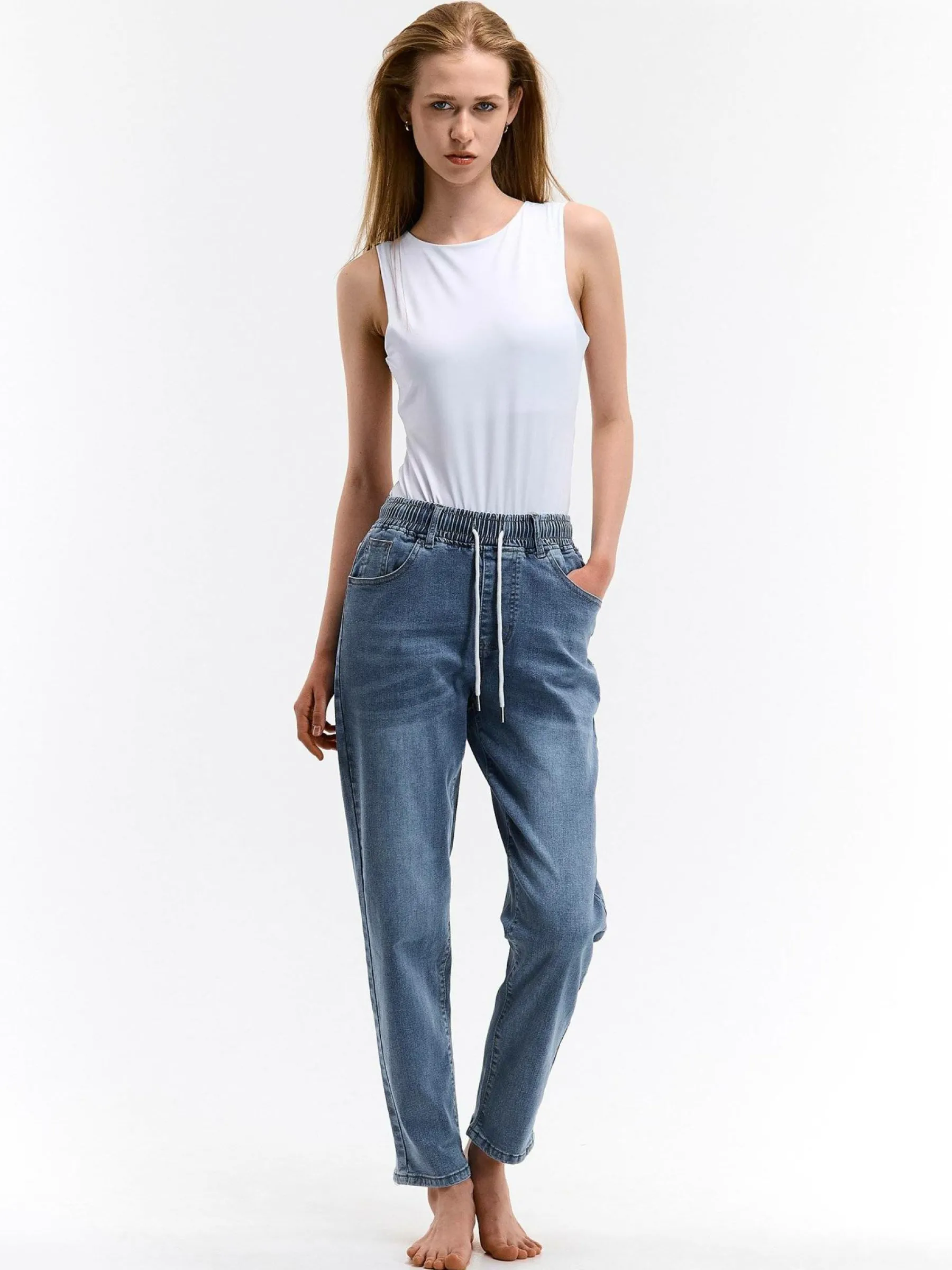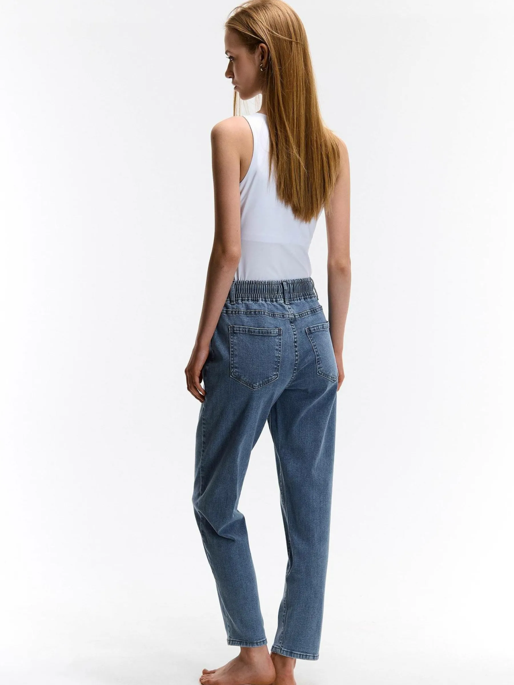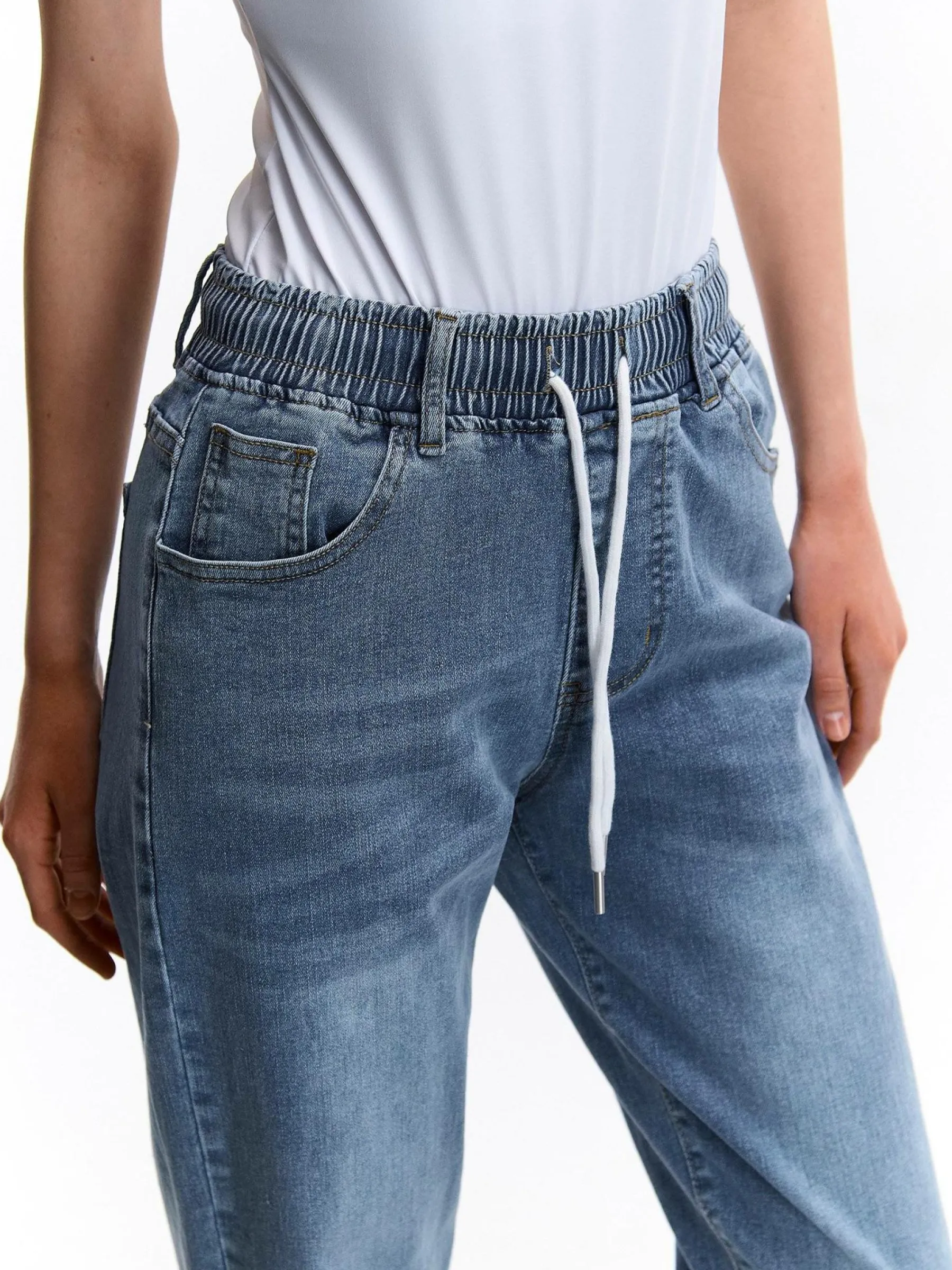 Kolor: niebieskiKrój: mamaTyp: jeansDługość: dlugiePattern style: pojedynczy kolorDetal: z elastyczną opaską, ze s…