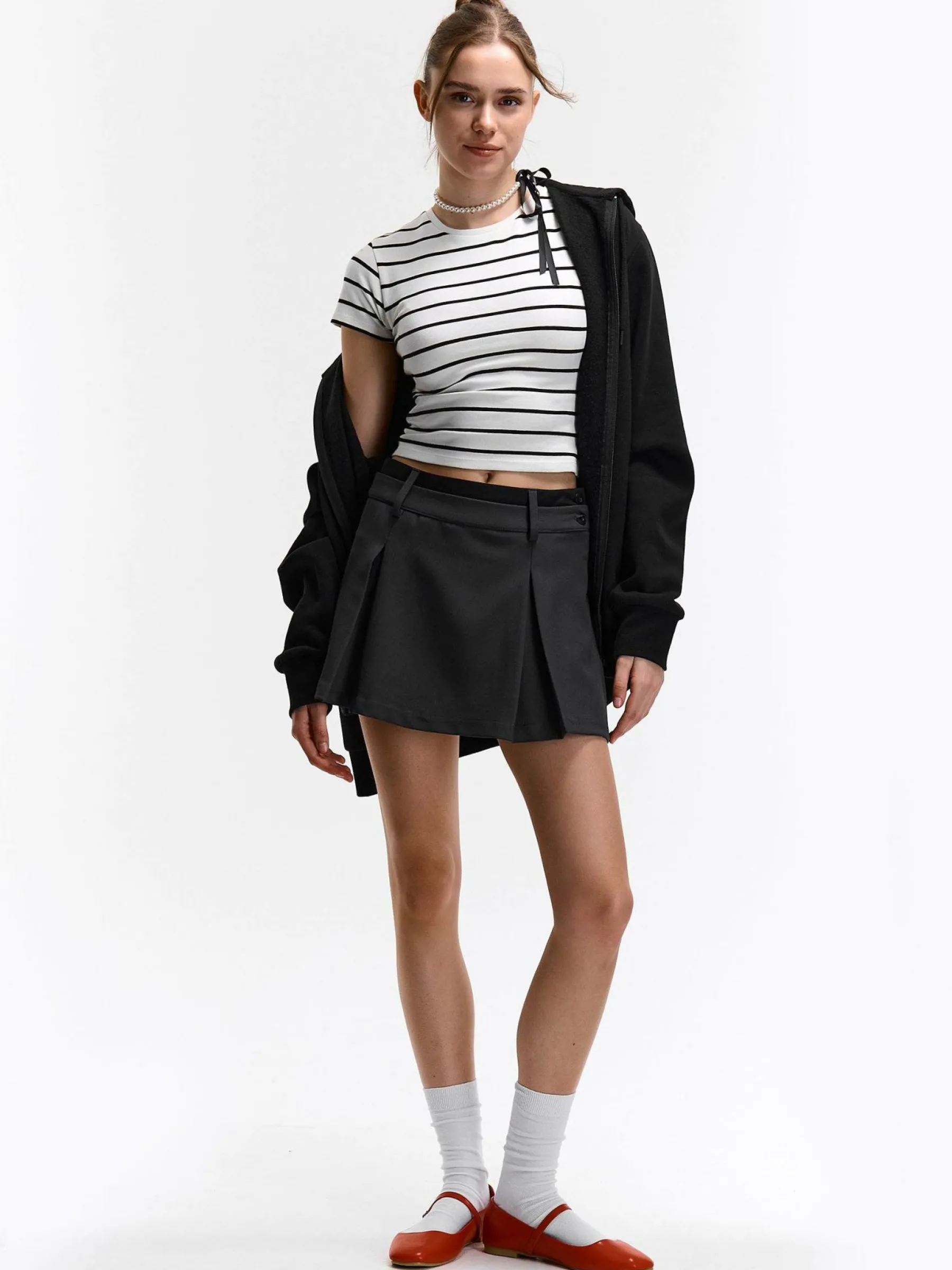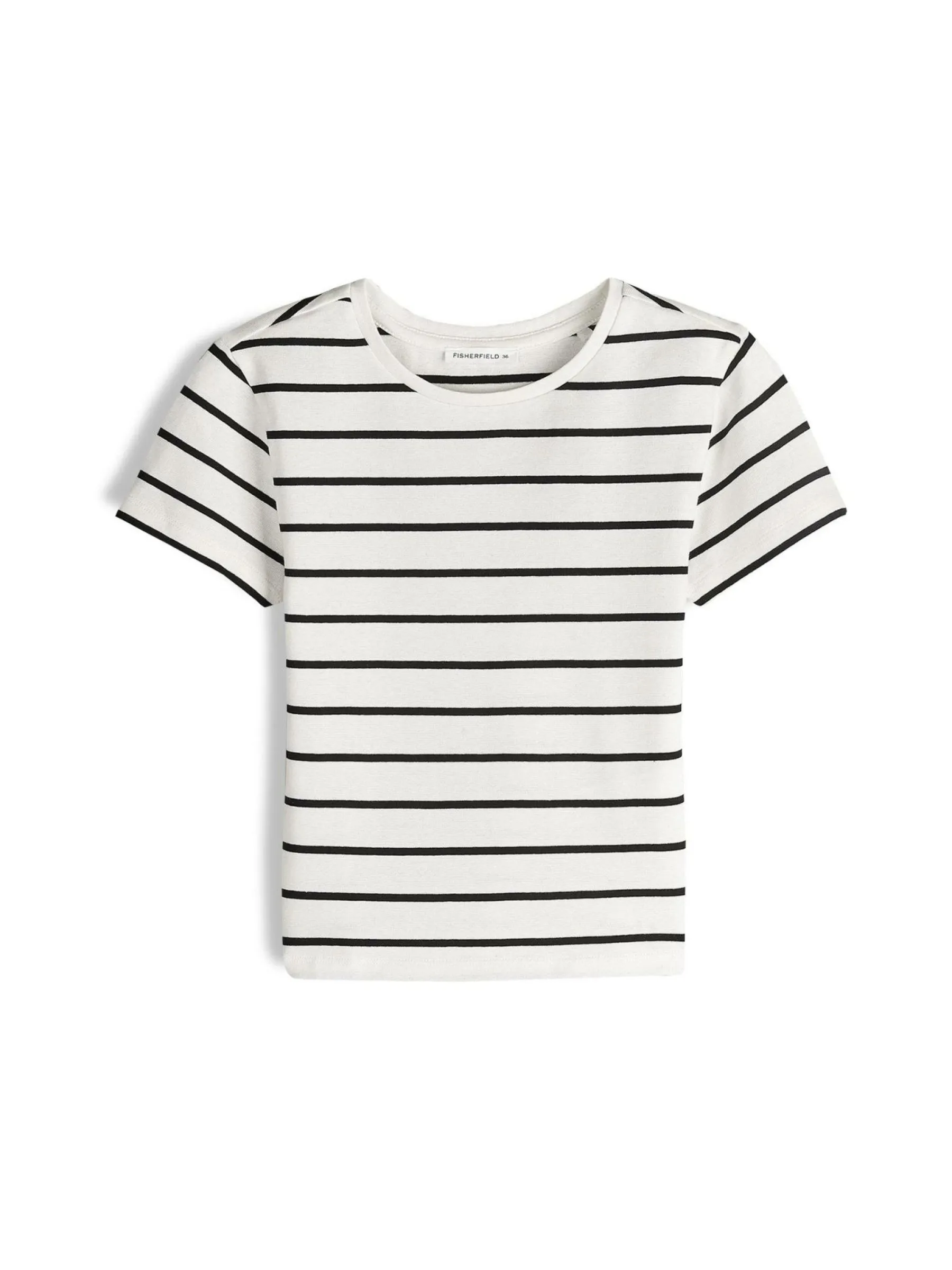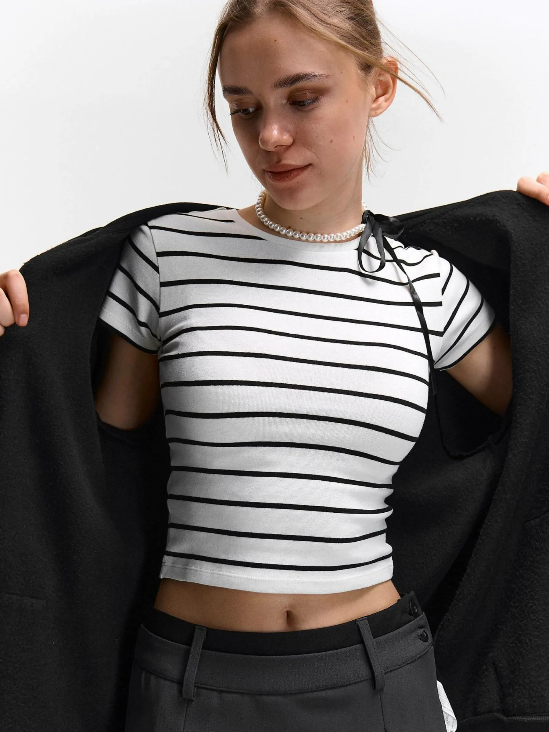 Kolor: białyKrój: regularTyp: koszulkaRekaw: krótki rękawDługość: krótkiPattern style: w prążkiDetal: nad gło…