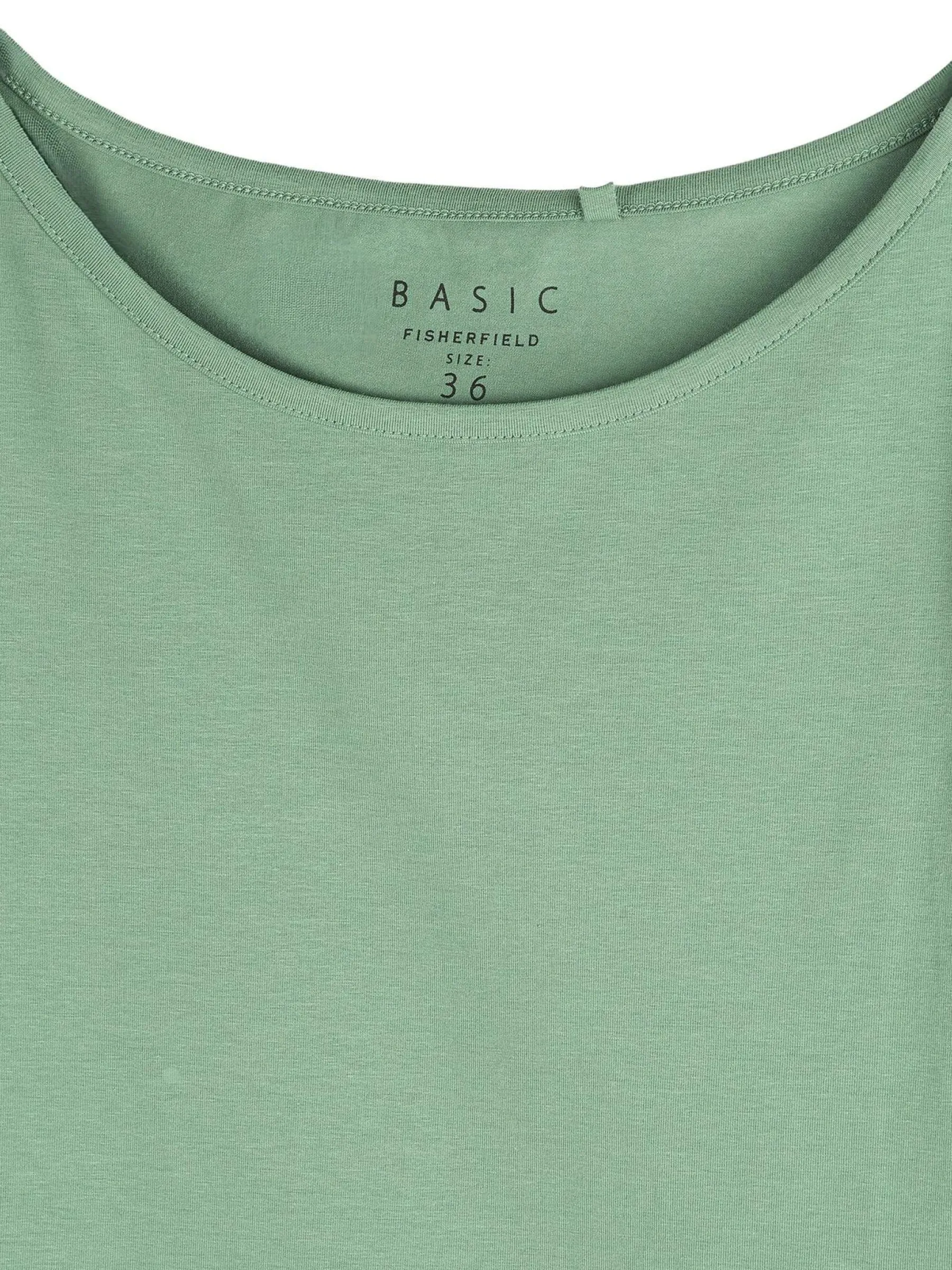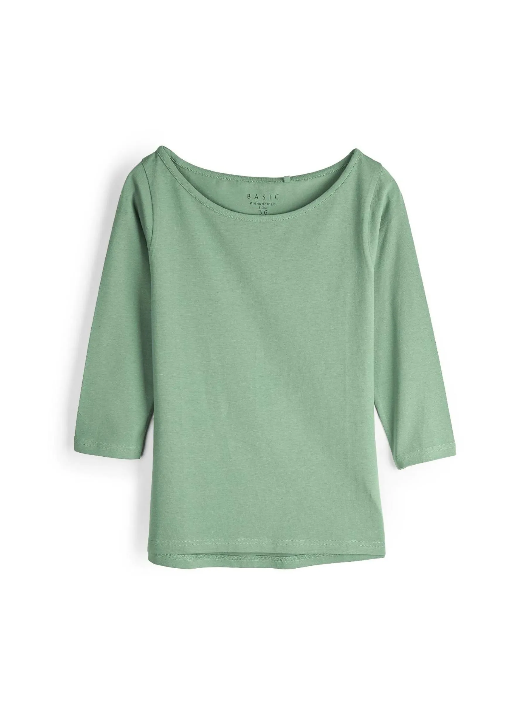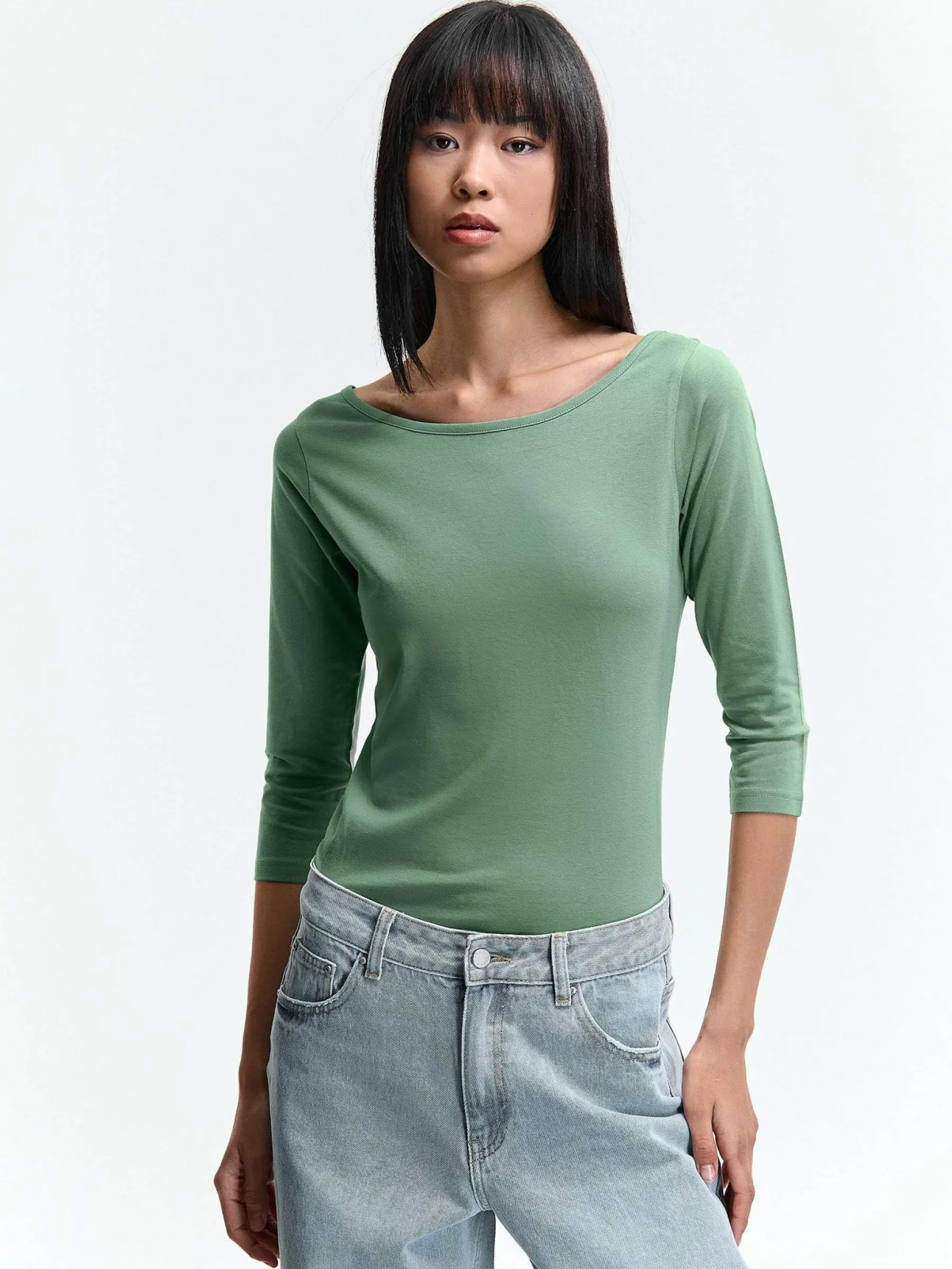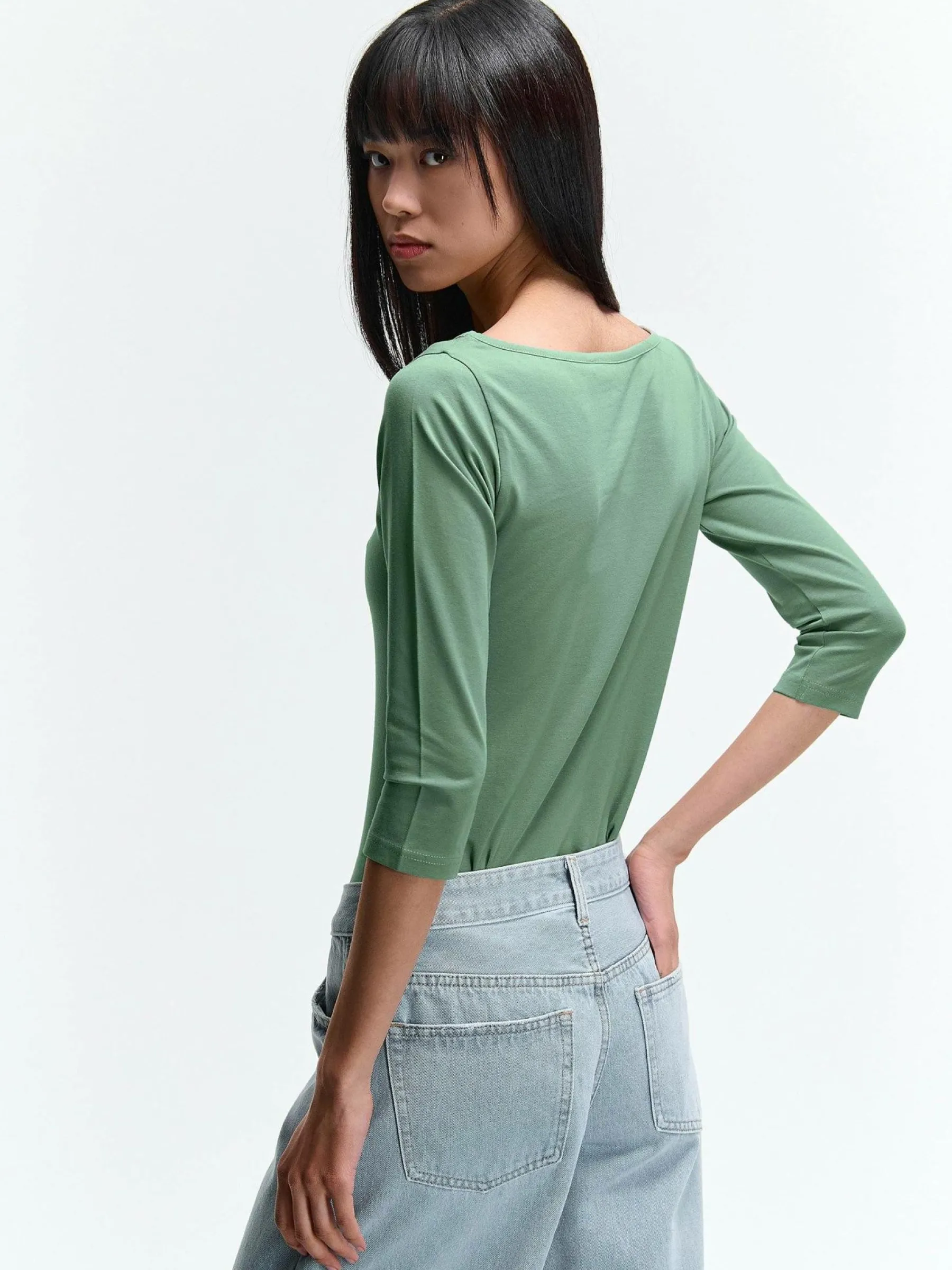 Kolor: zielonyKrój: regularTyp: koszulkaRekaw: rękaw 3/4Długość: krótkiPattern style: pojedynczy kolorDetal: nad g…