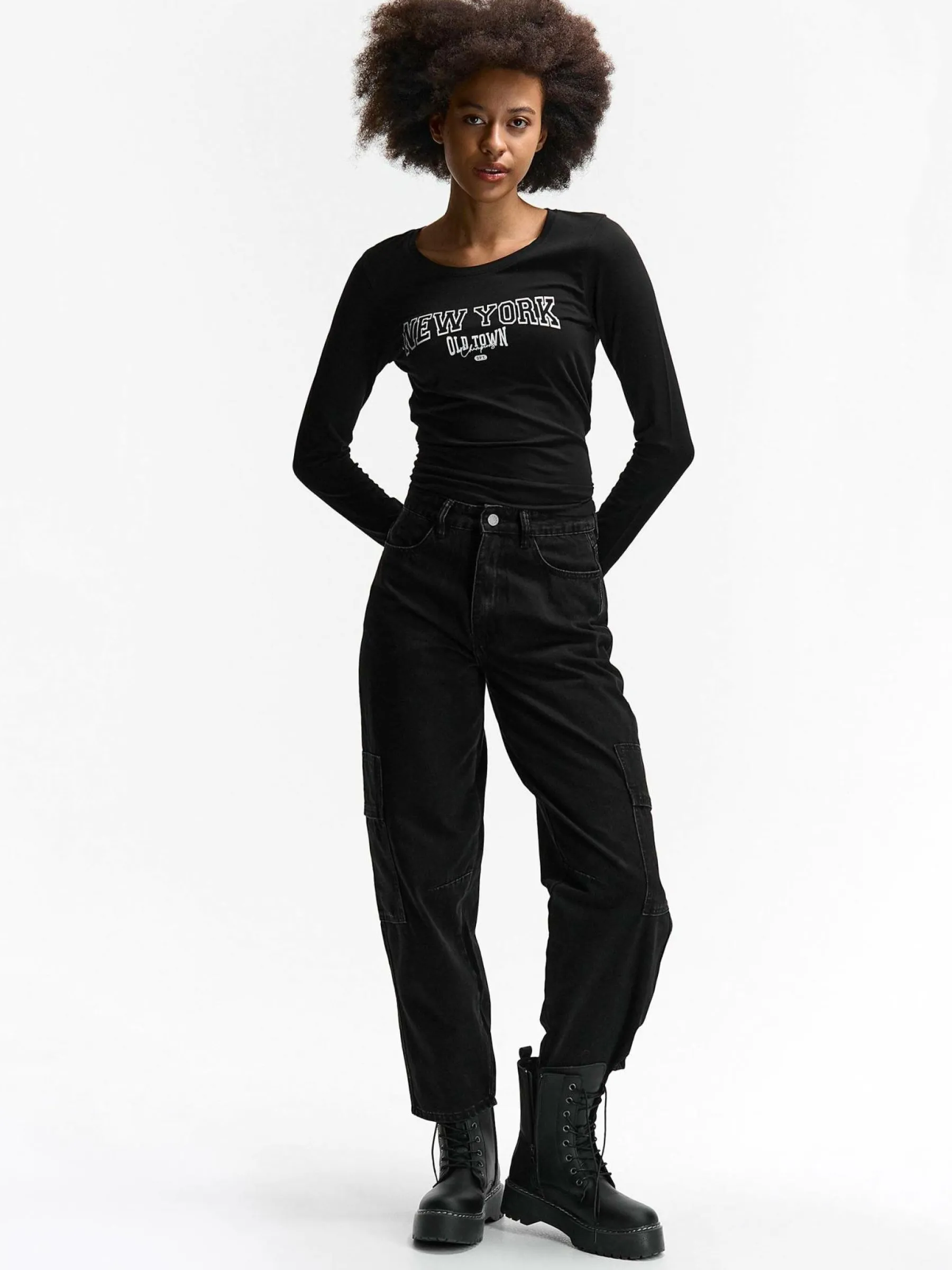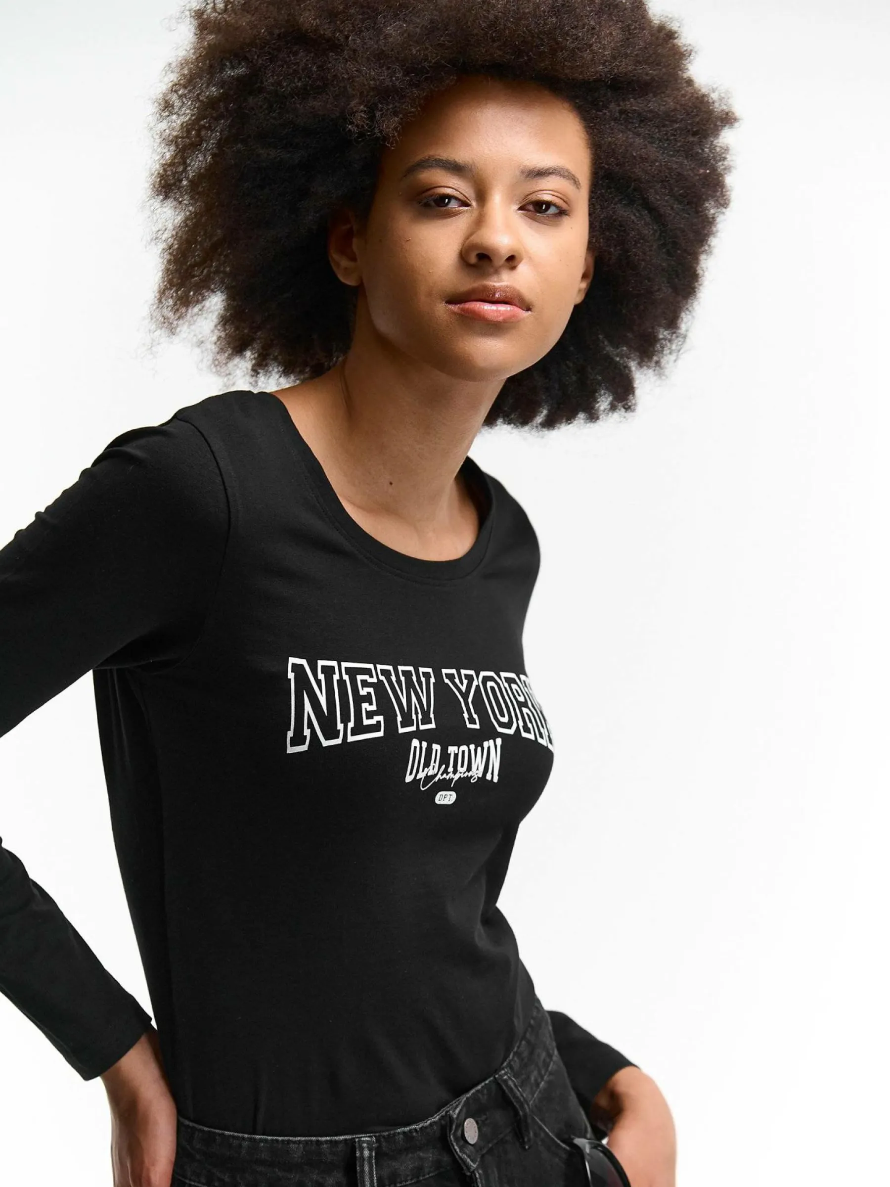 Kolor: czarnyKrój: regularTyp: koszulkaRekaw: długi rękawDługość: krótkiPattern style: z nadrukiem, z napisemDeta…