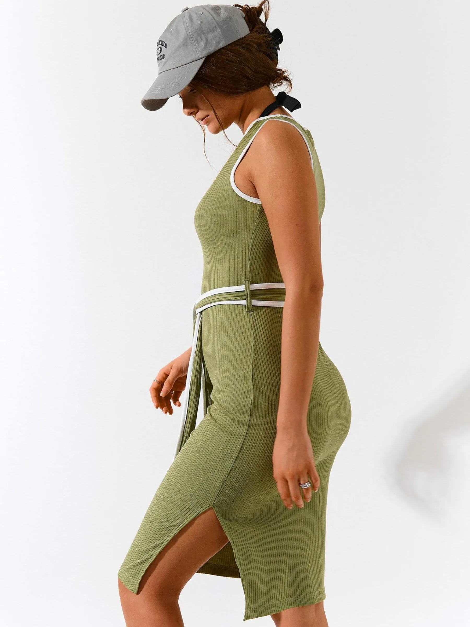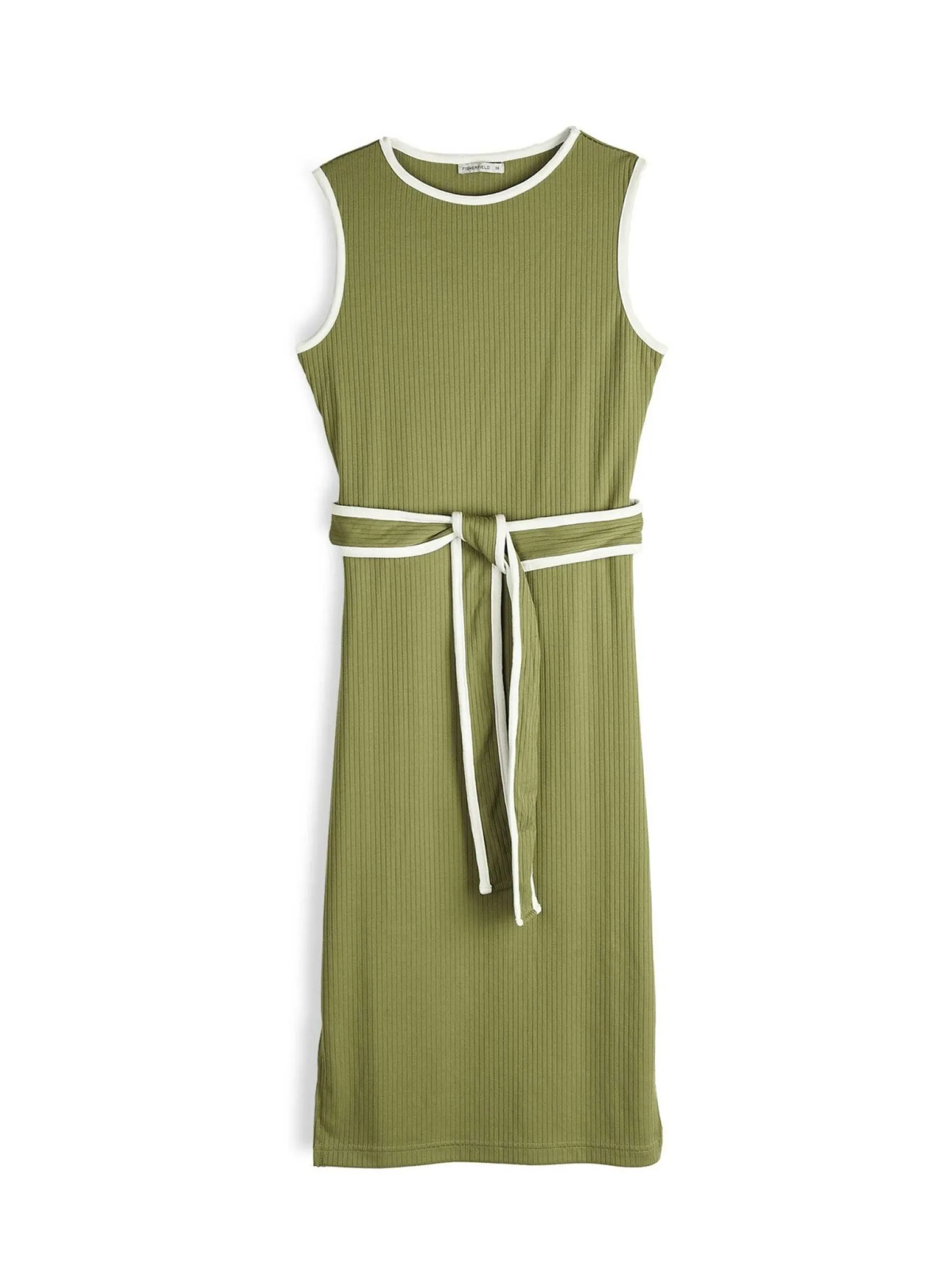 Kolor: zielonyKrój: regularTyp: sukienkaRekaw: bez rękawówDługość: midiPattern style: pojedynczy kolor, żebrowany…