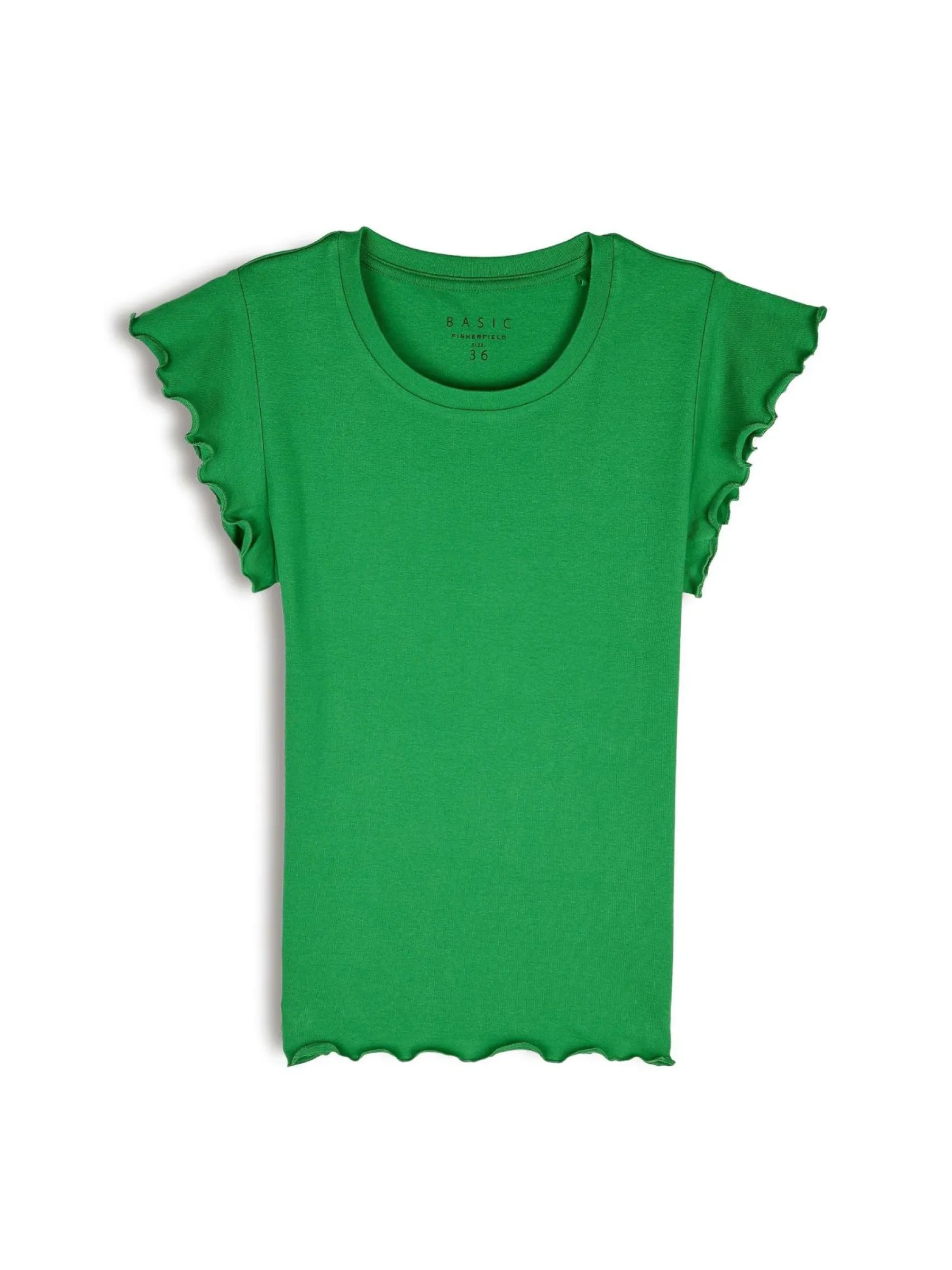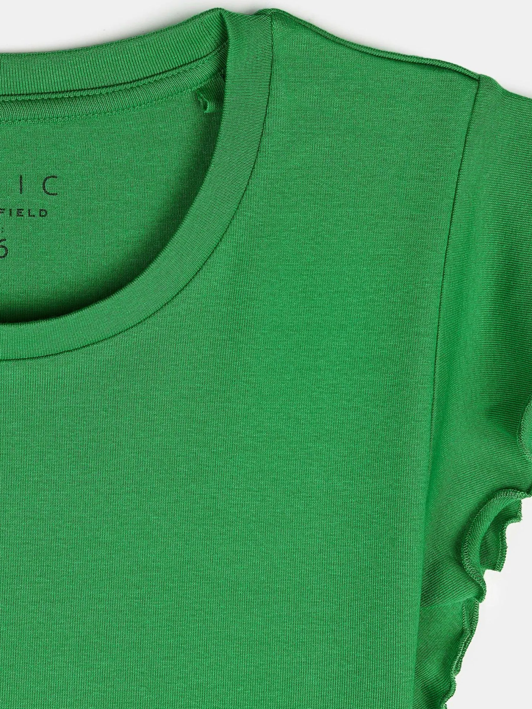 Kolor: zielonyKrój: z falbanąTyp: koszulkaRekaw: krótki rękawDługość: krótkiPattern style: pojedynczy kolorDetal…