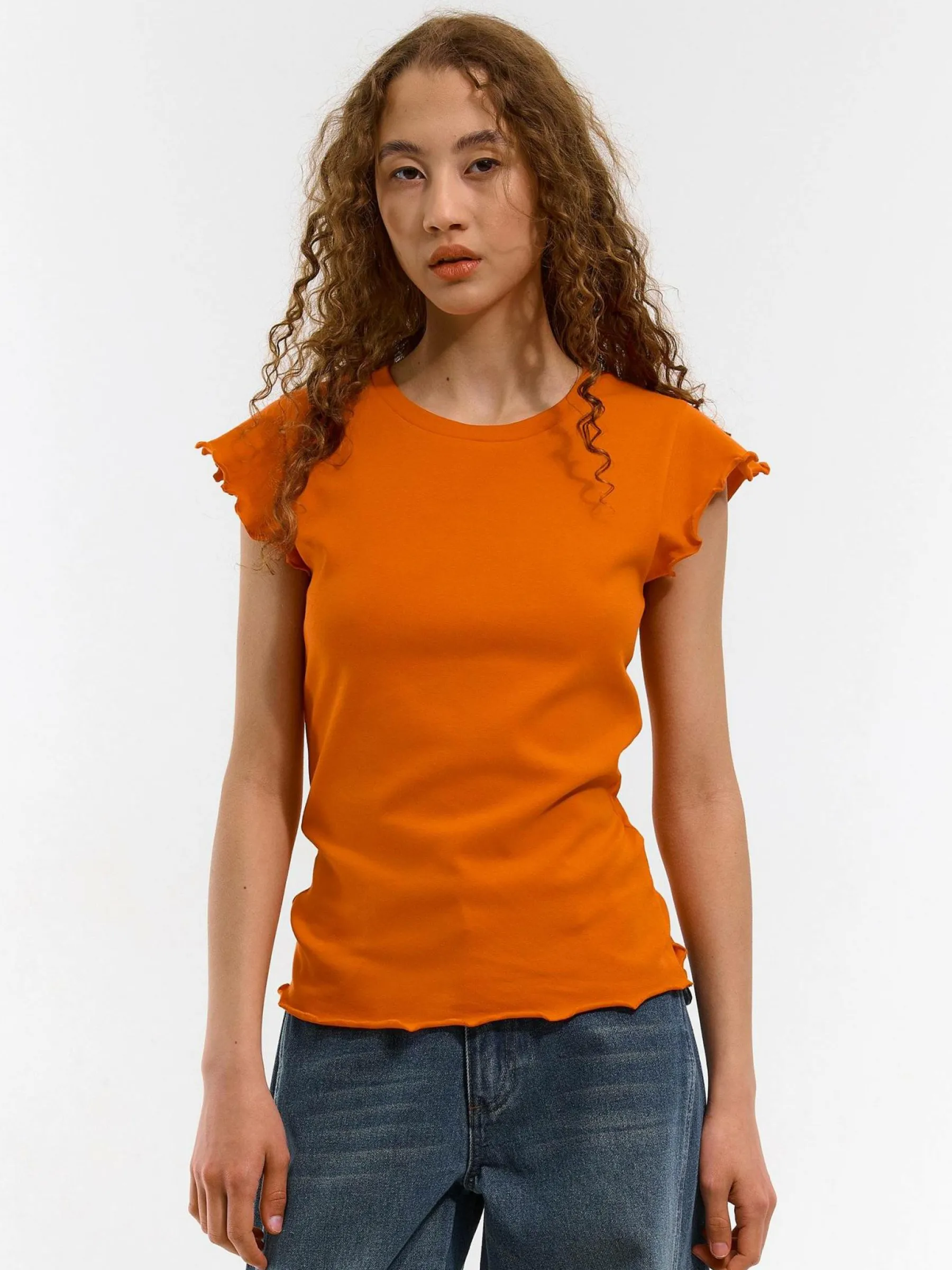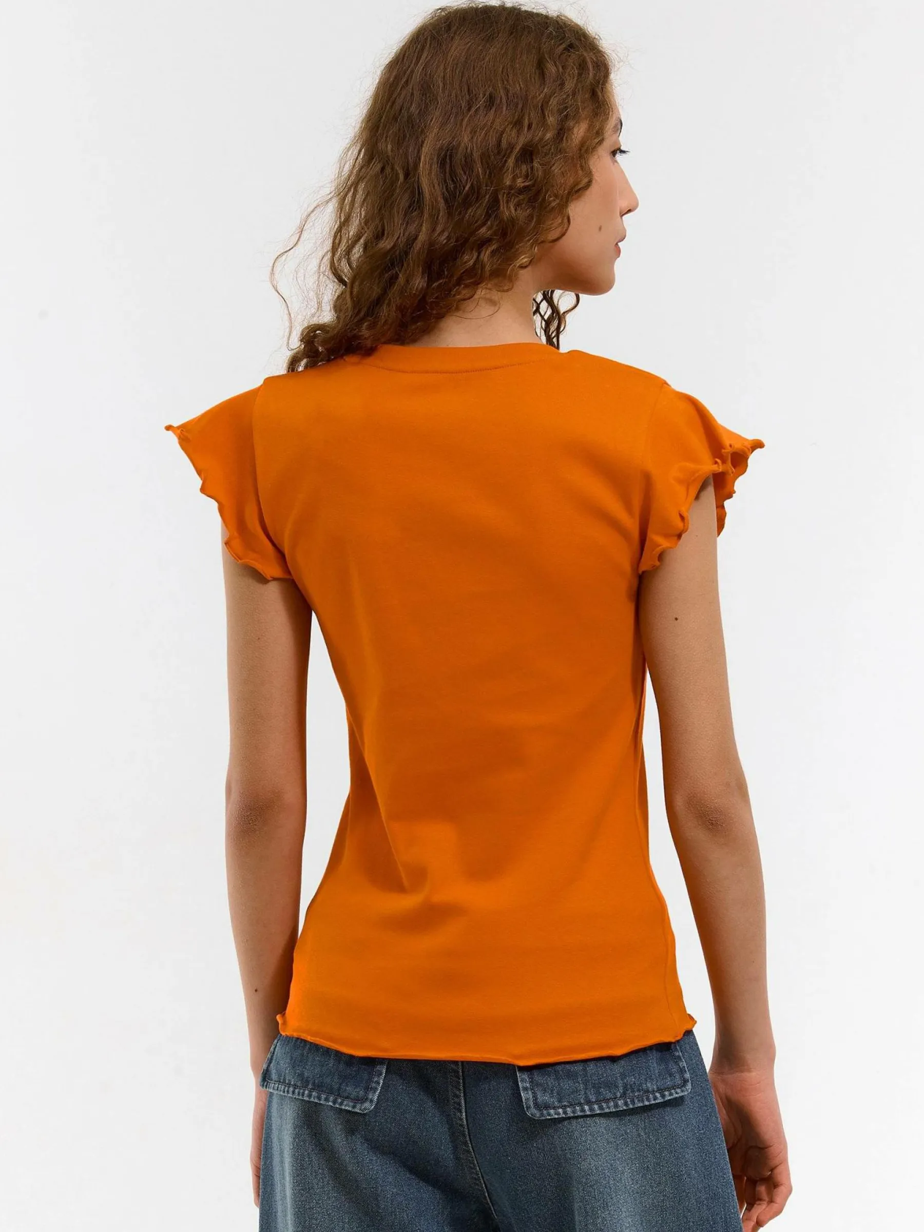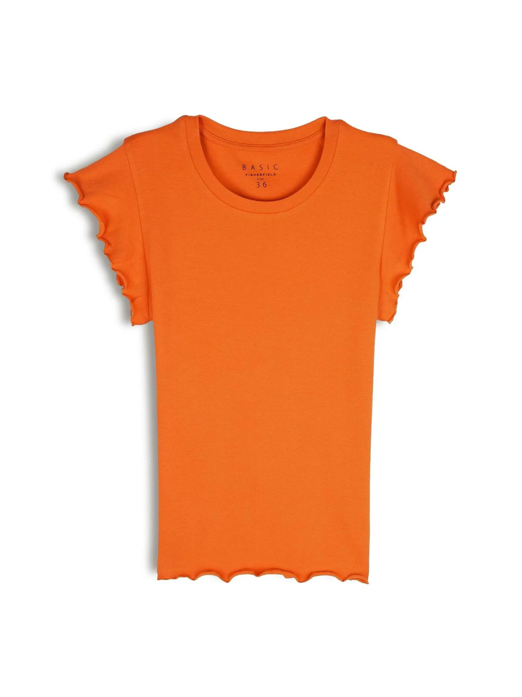 Kolor: pomarańczowyKrój: z falbanąTyp: koszulkaRekaw: krótki rękawDługość: krótkiPattern style: pojedynczy kolo…