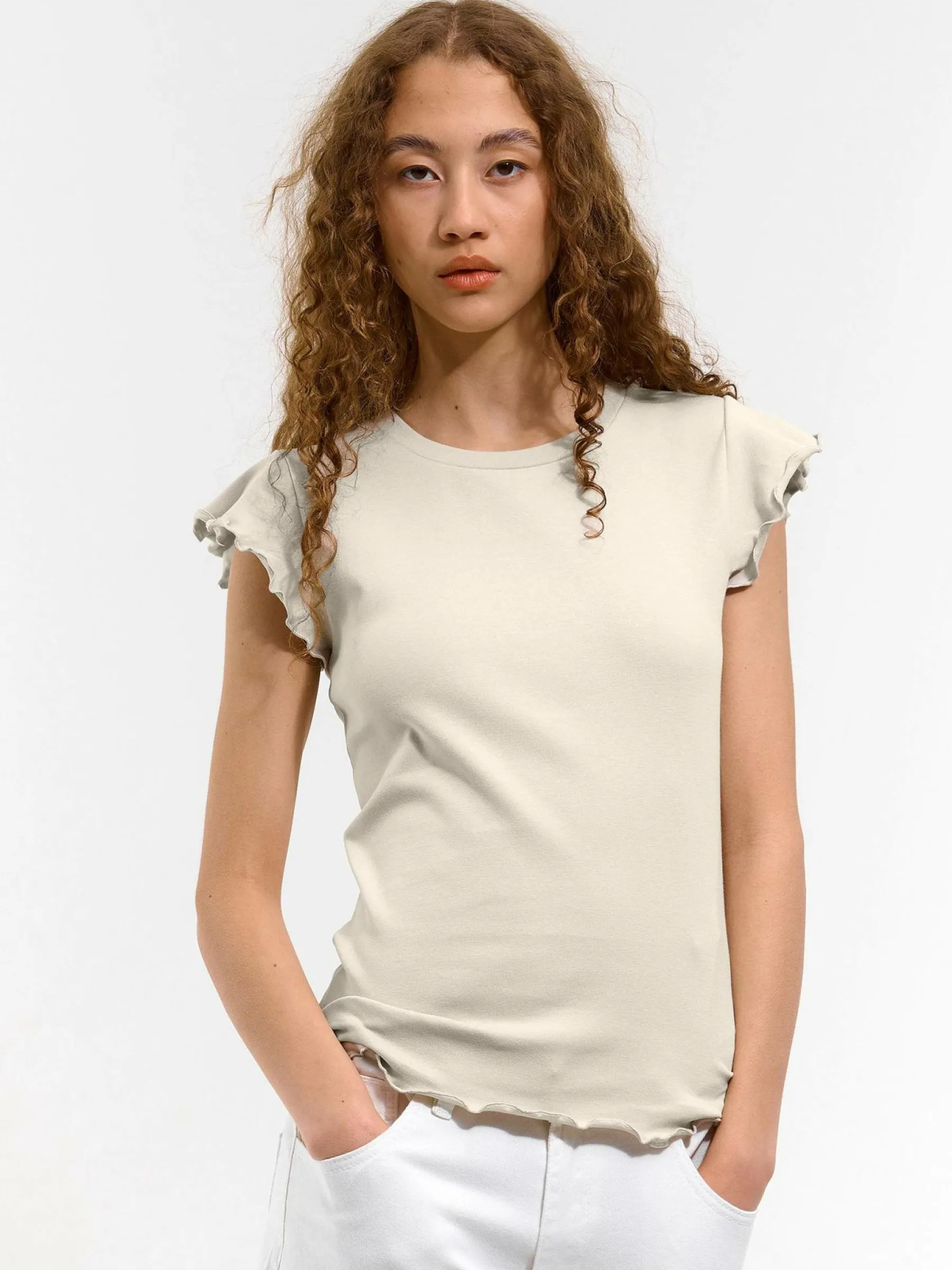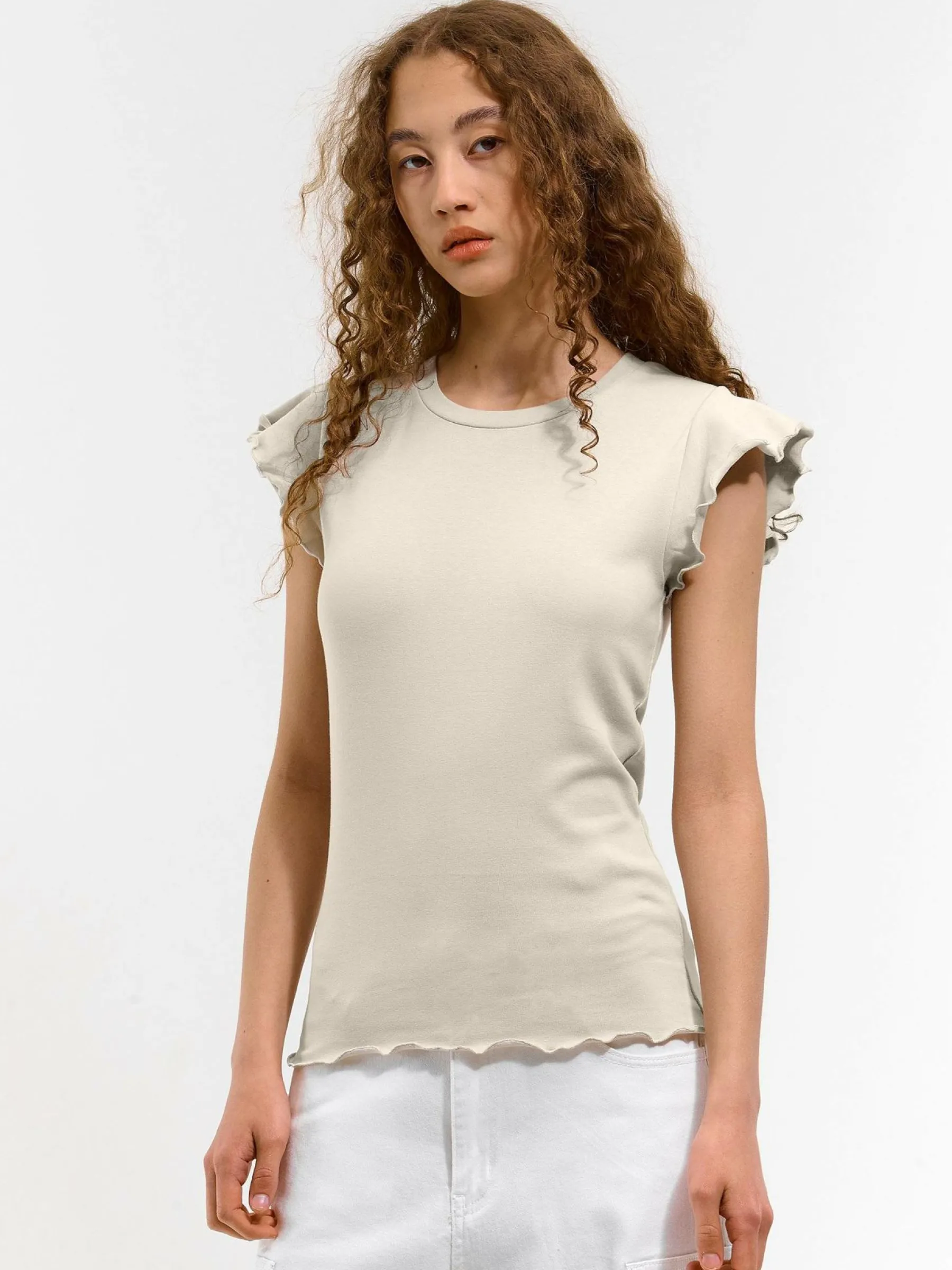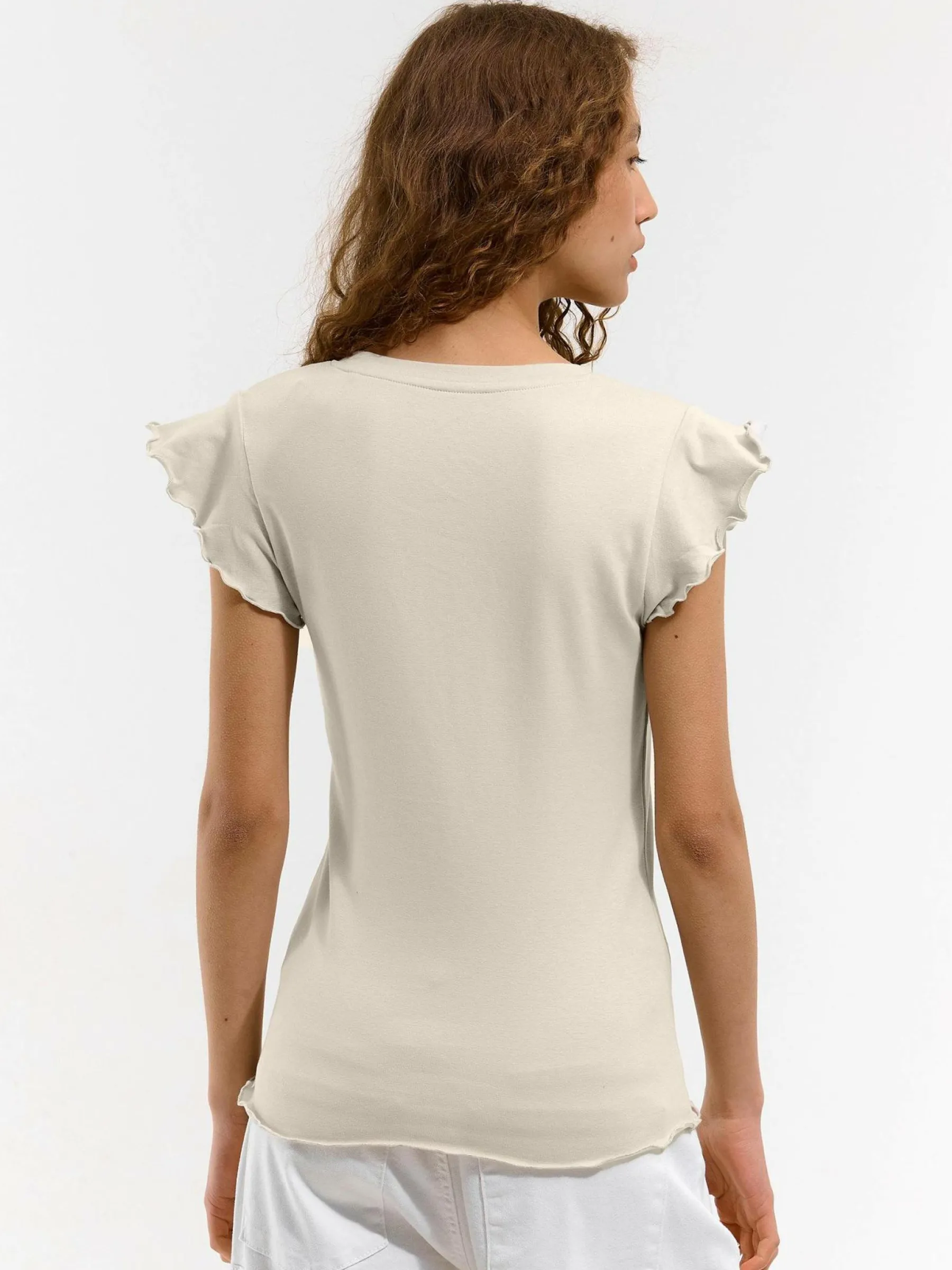Kolor: szaryKrój: z falbanąTyp: koszulkaRekaw: krótki rękawDługość: krótkiPattern style: pojedynczy kolorDetal: …