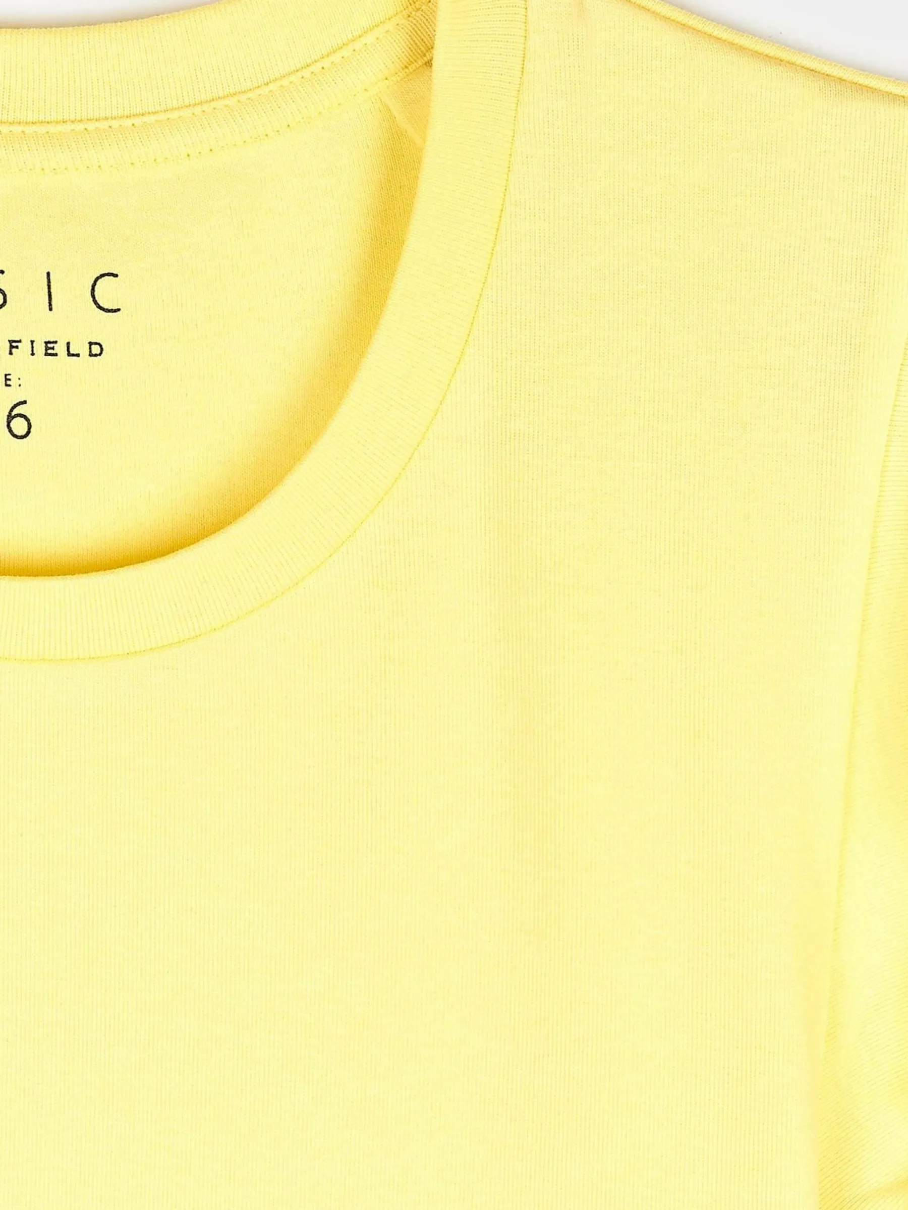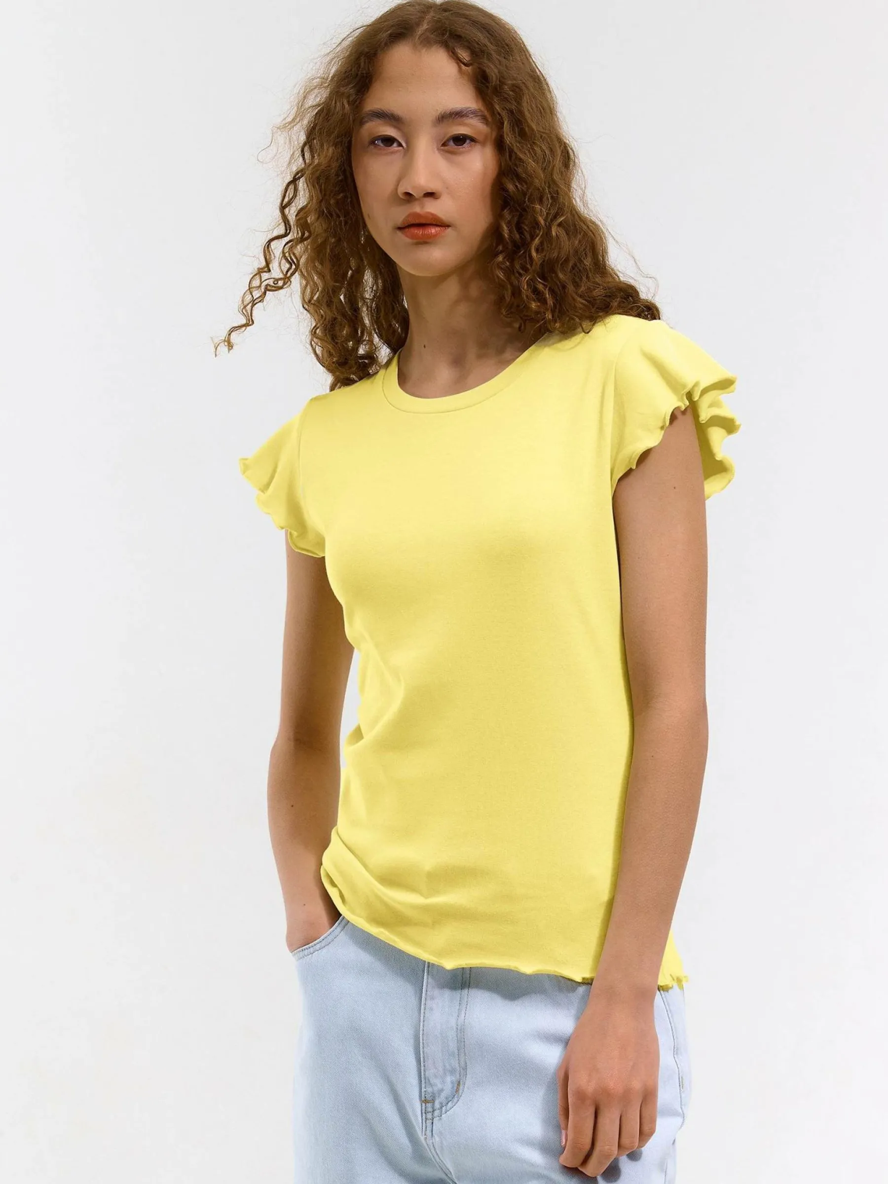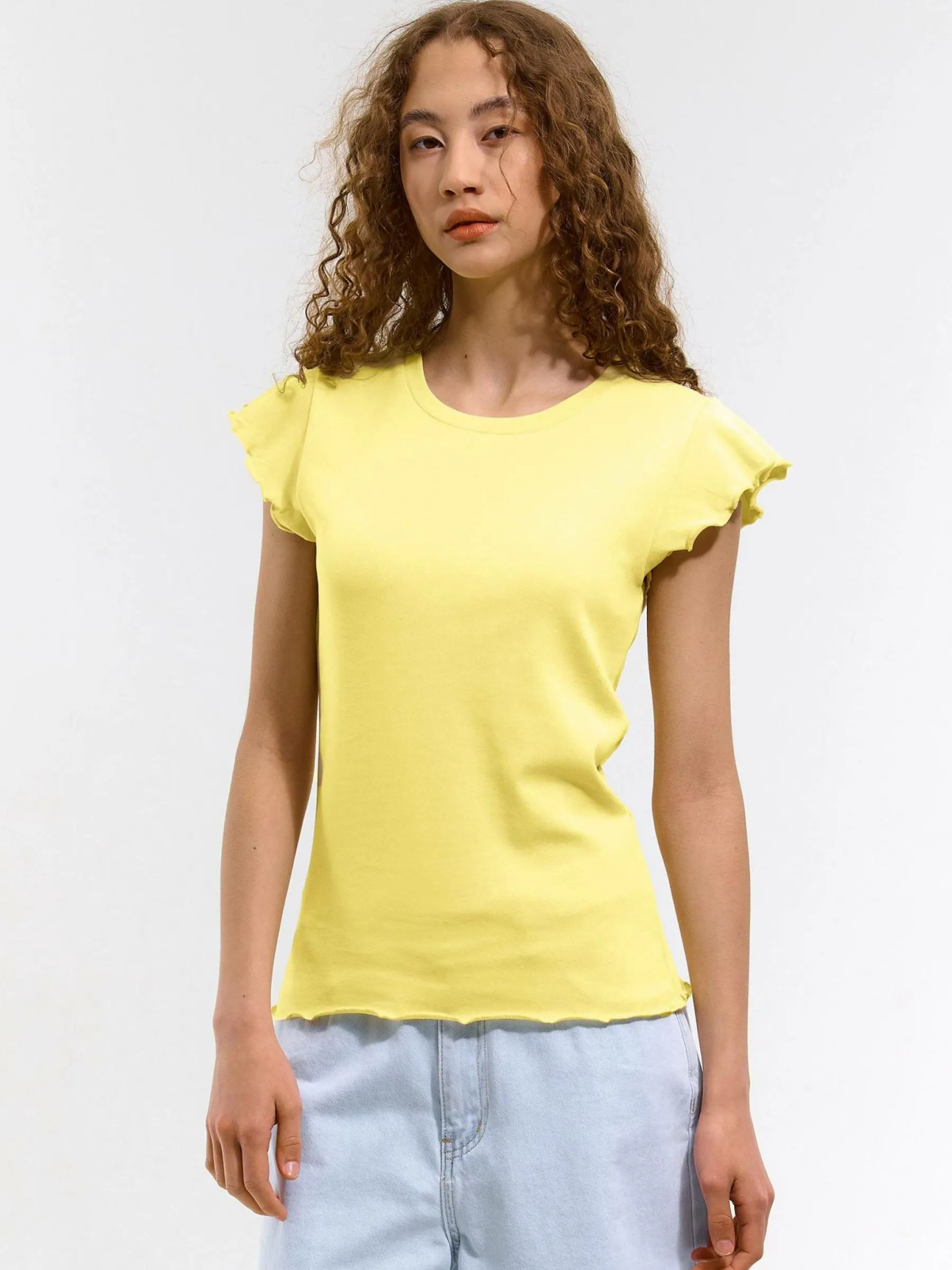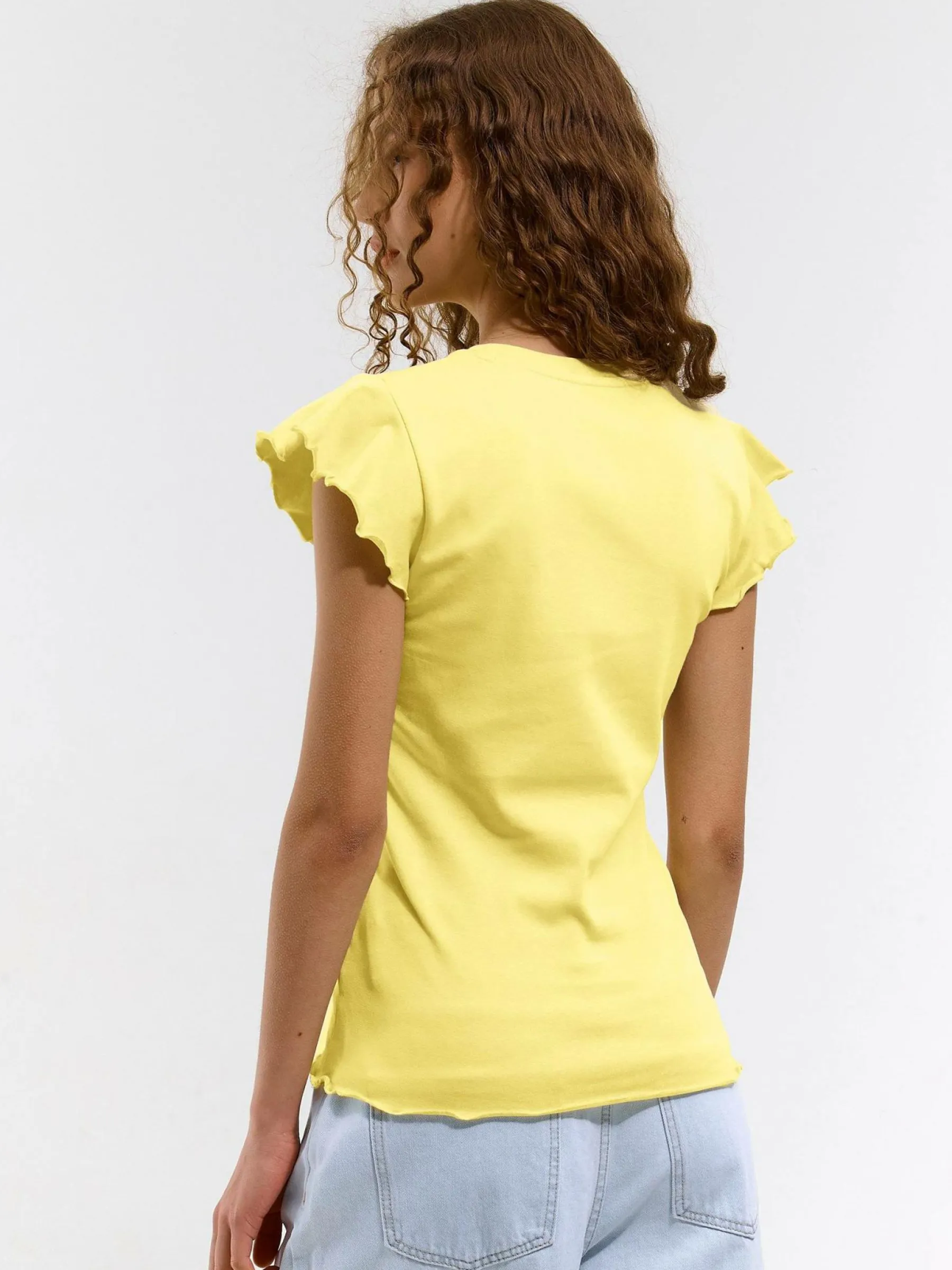 Kolor: żółtyKrój: z falbanąTyp: koszulkaRekaw: krótki rękawDługość: krótkiPattern style: pojedynczy kolorDeta…