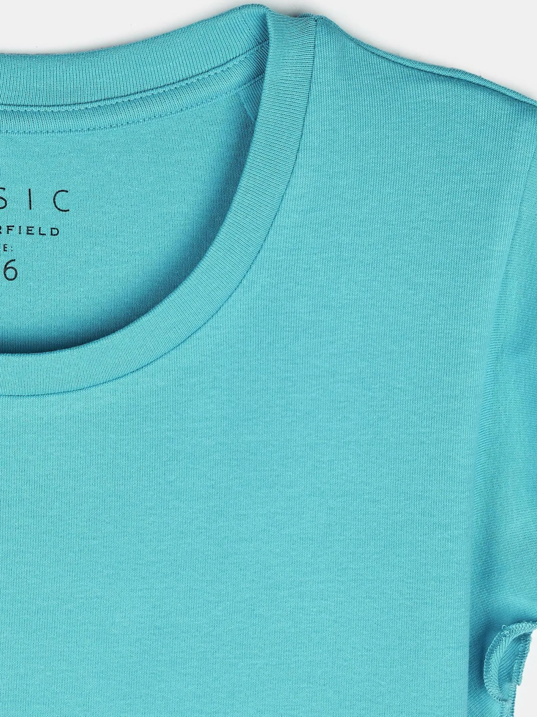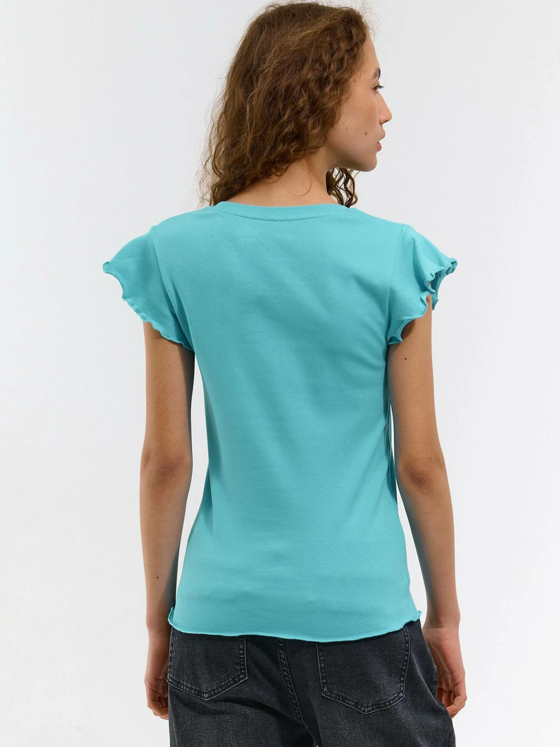 Kolor: niebieskiKrój: z falbanąTyp: koszulkaRekaw: krótki rękawDługość: krótkiPattern style: pojedynczy kolorDet…