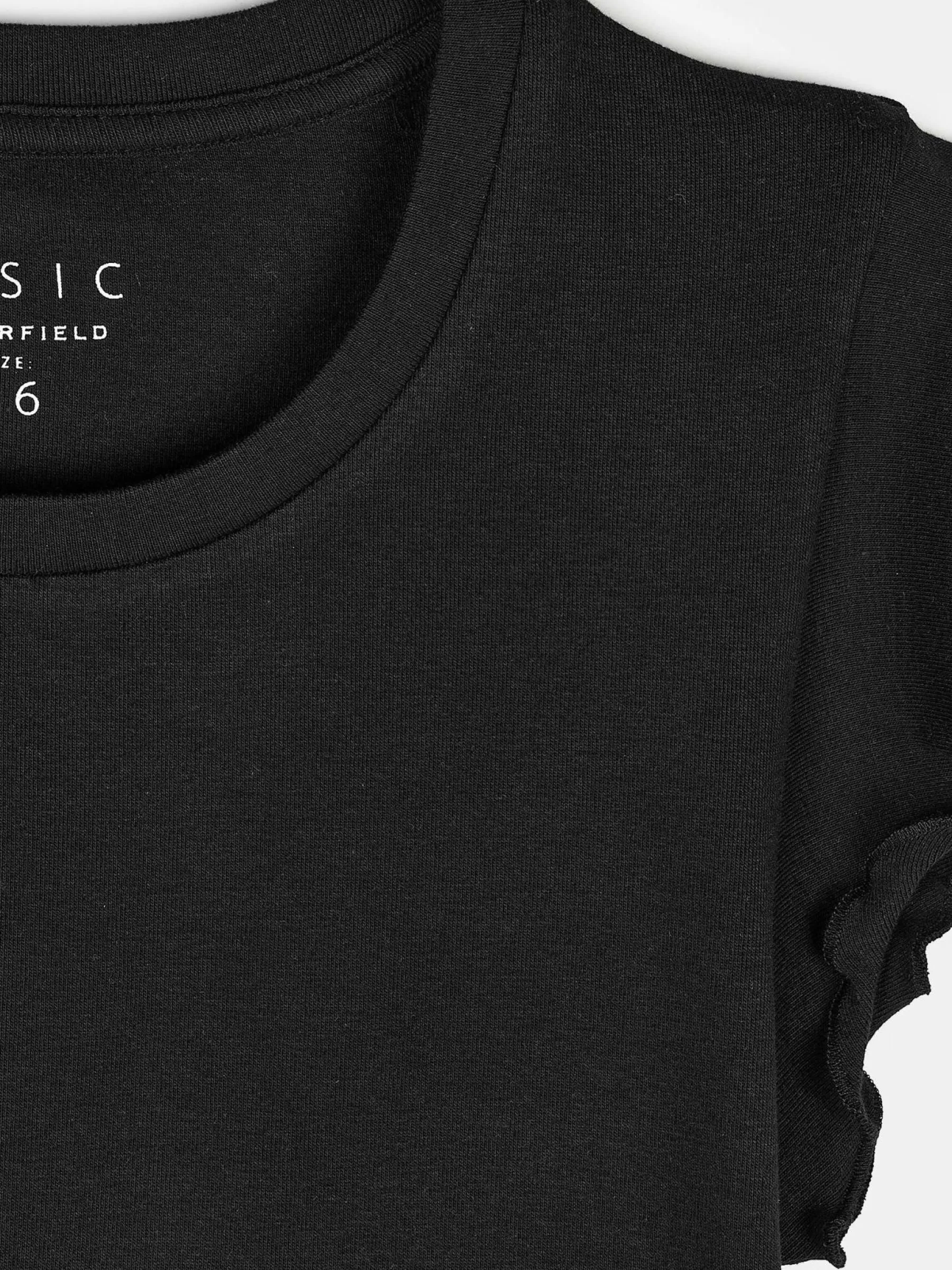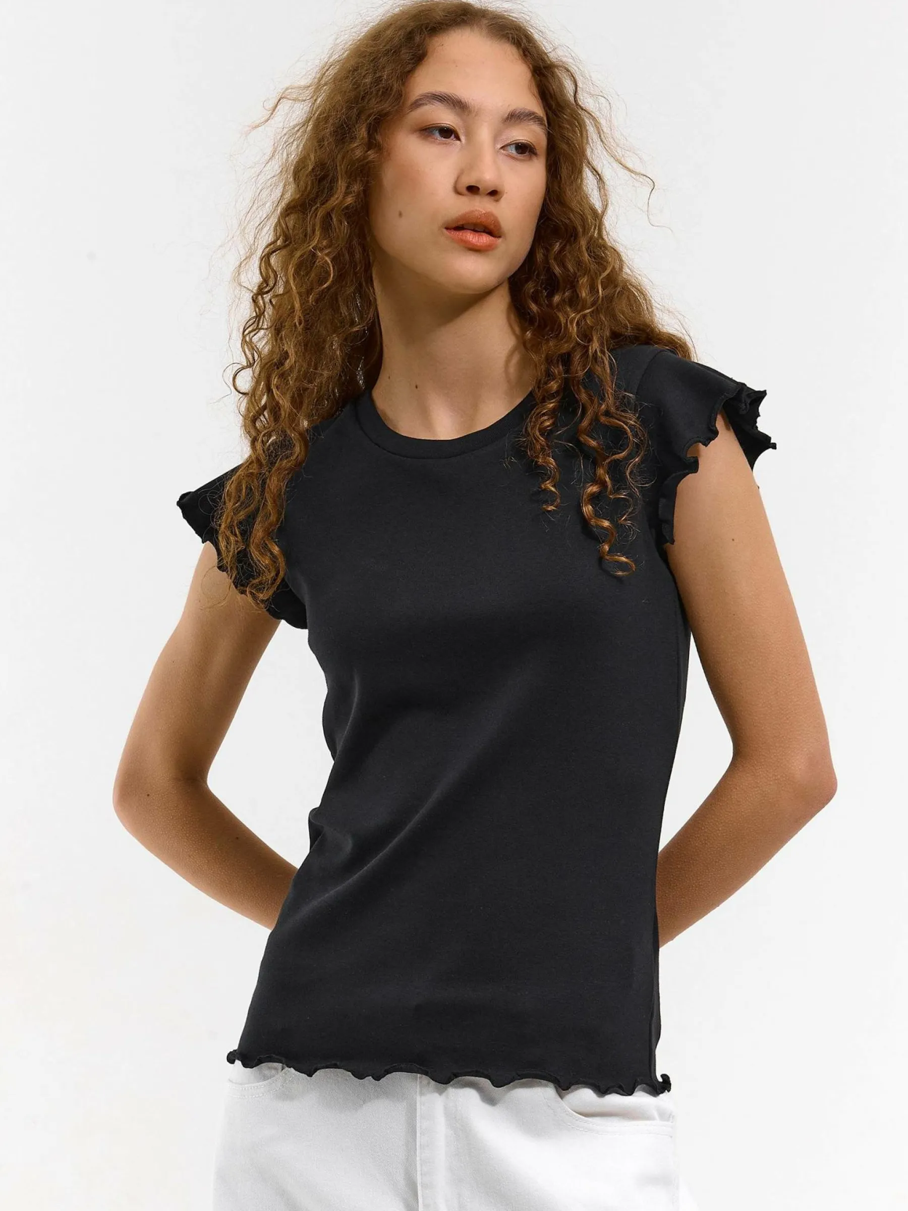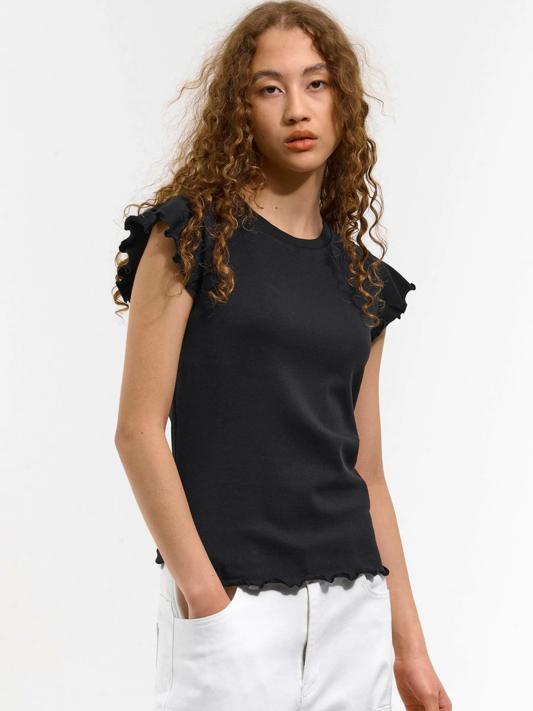 Kolor: czarnyKrój: z falbanąTyp: koszulkaRekaw: krótki rękawDługość: krótkiPattern style: pojedynczy kolorDetal:…