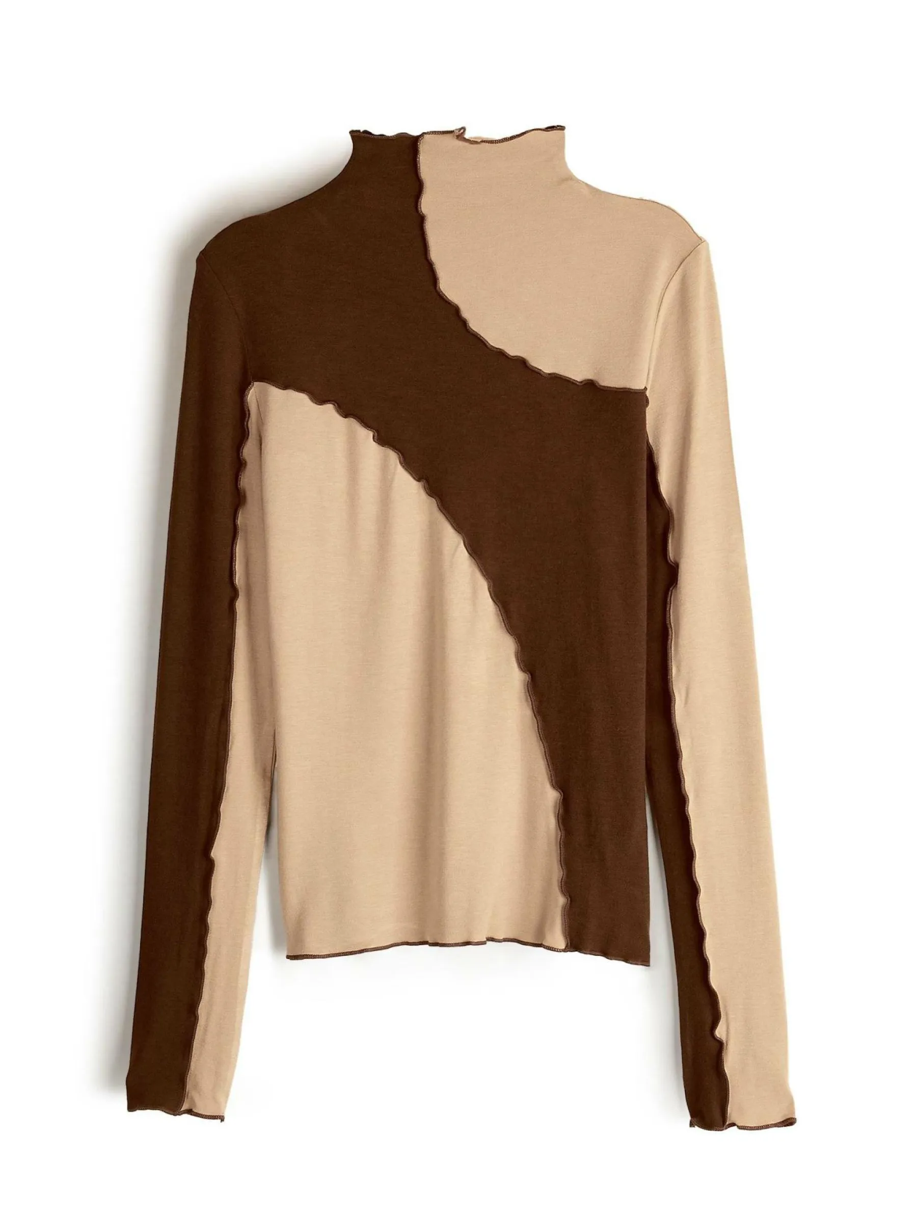 Kolor: brązowyKrój: regularTyp: golf, topRekaw: długi rękawDługość: krótkiPattern style: colour blockDetal: z fa…