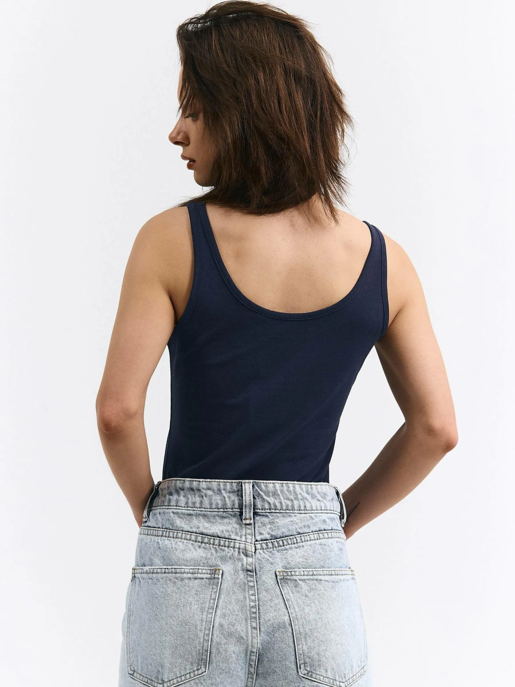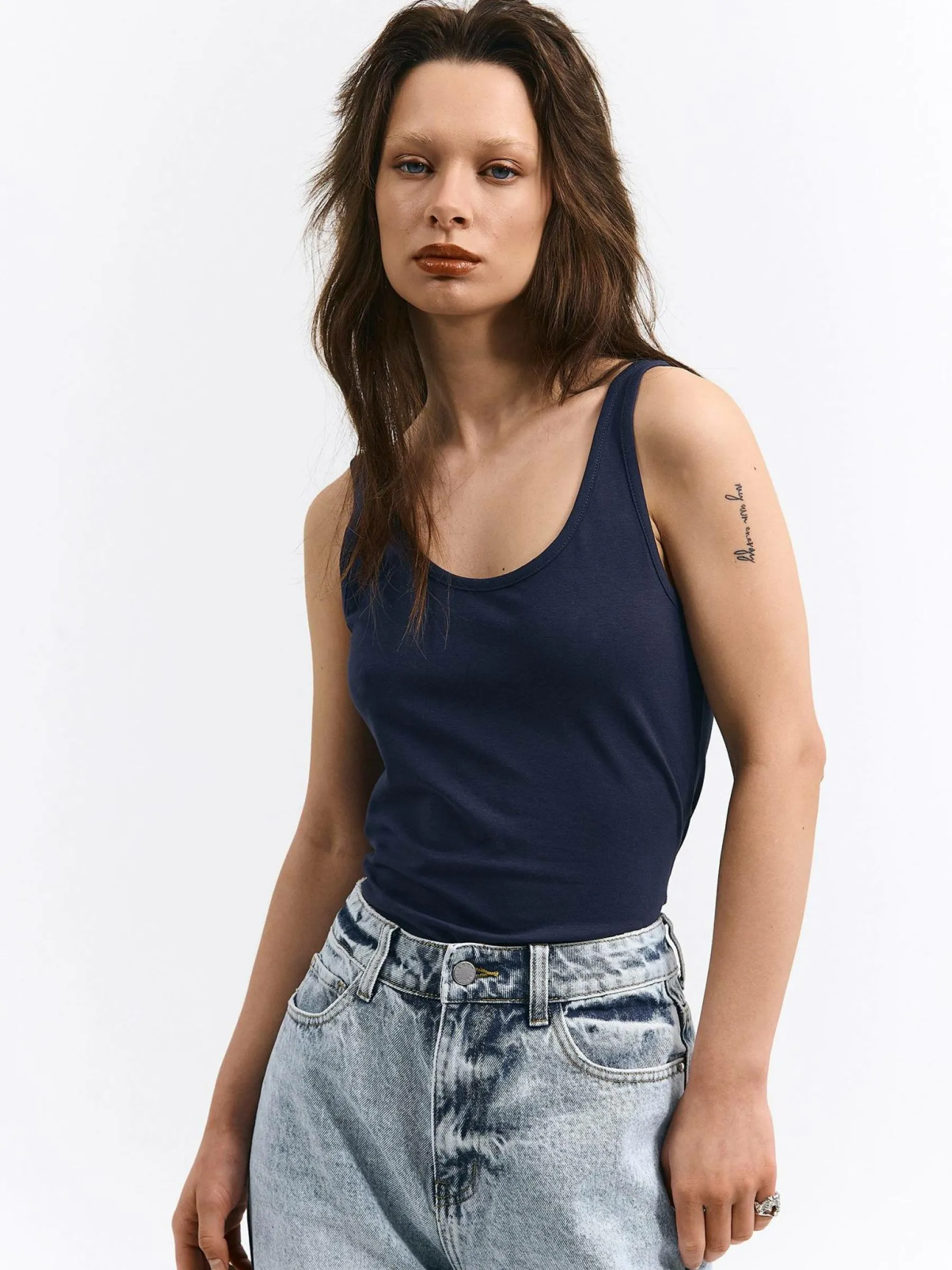 Kolor: granatowyKrój: regularTyp: podkoszulekRekaw: bez rękawówDługość: krótkiPattern style: pojedynczy kolorDeta…