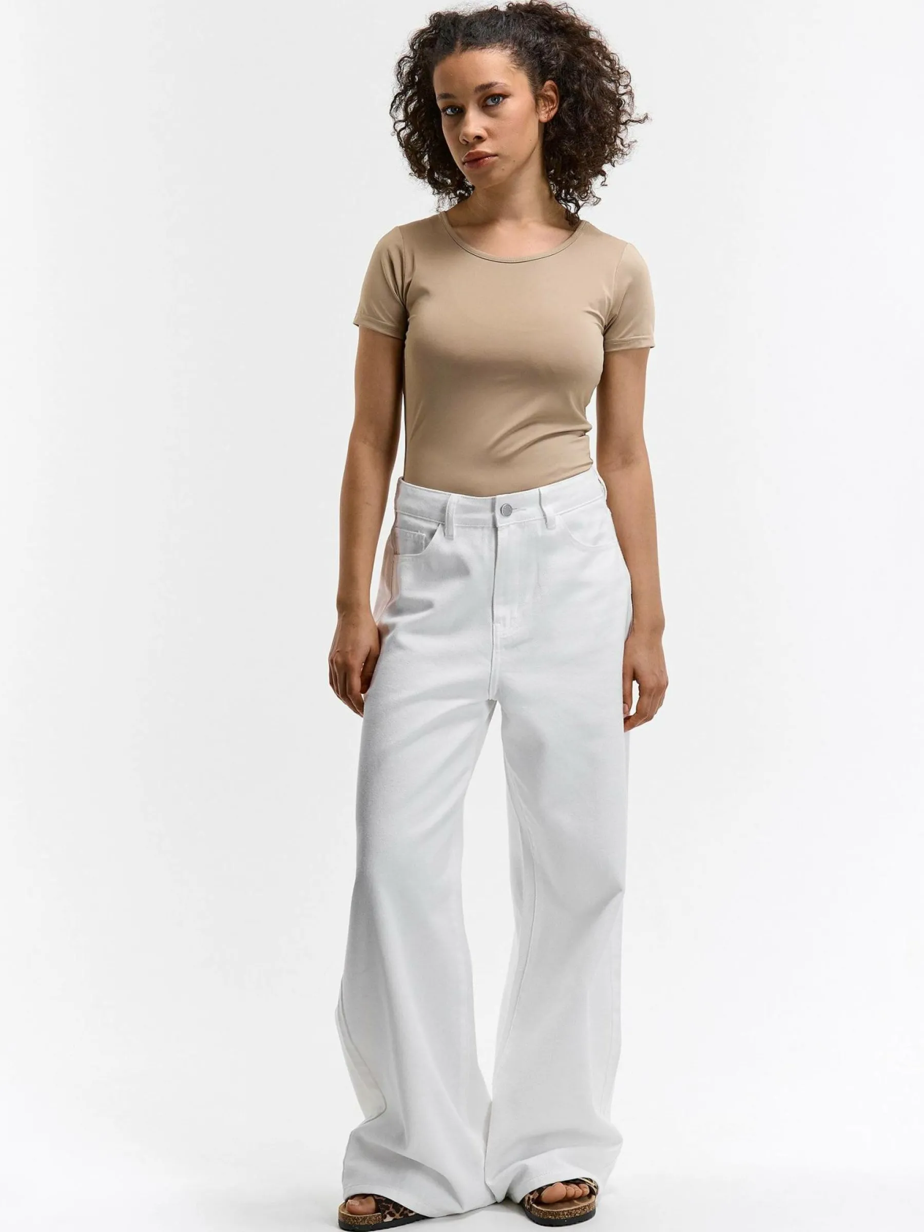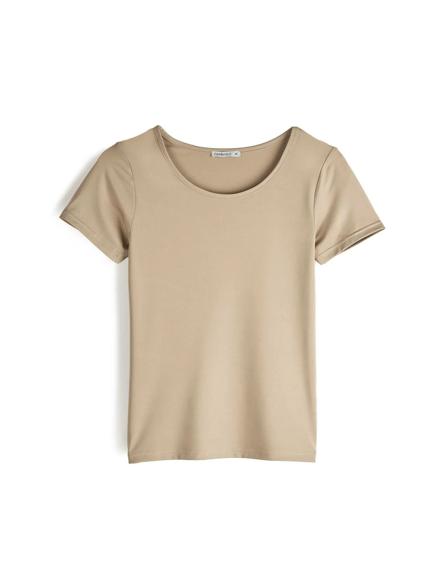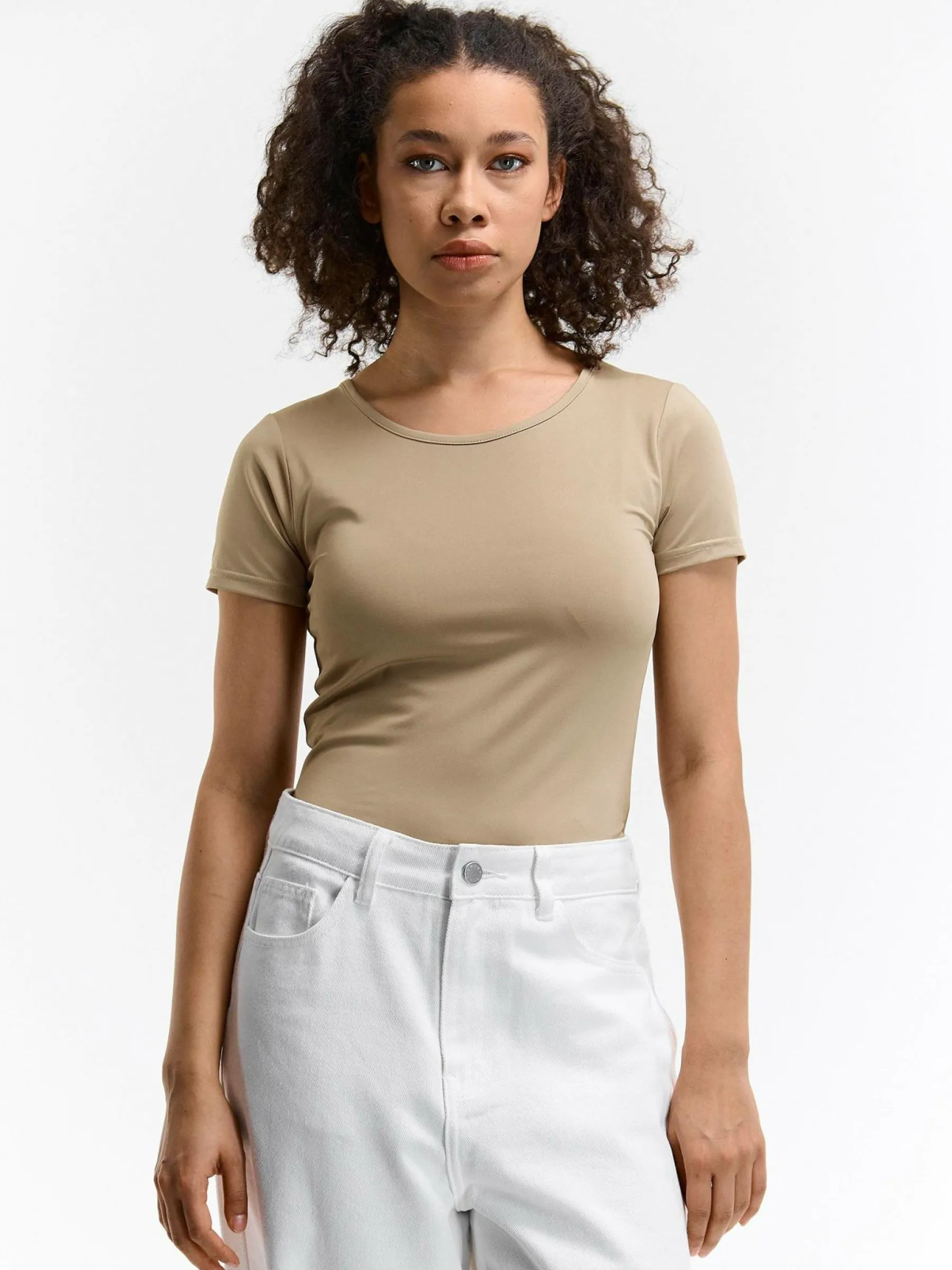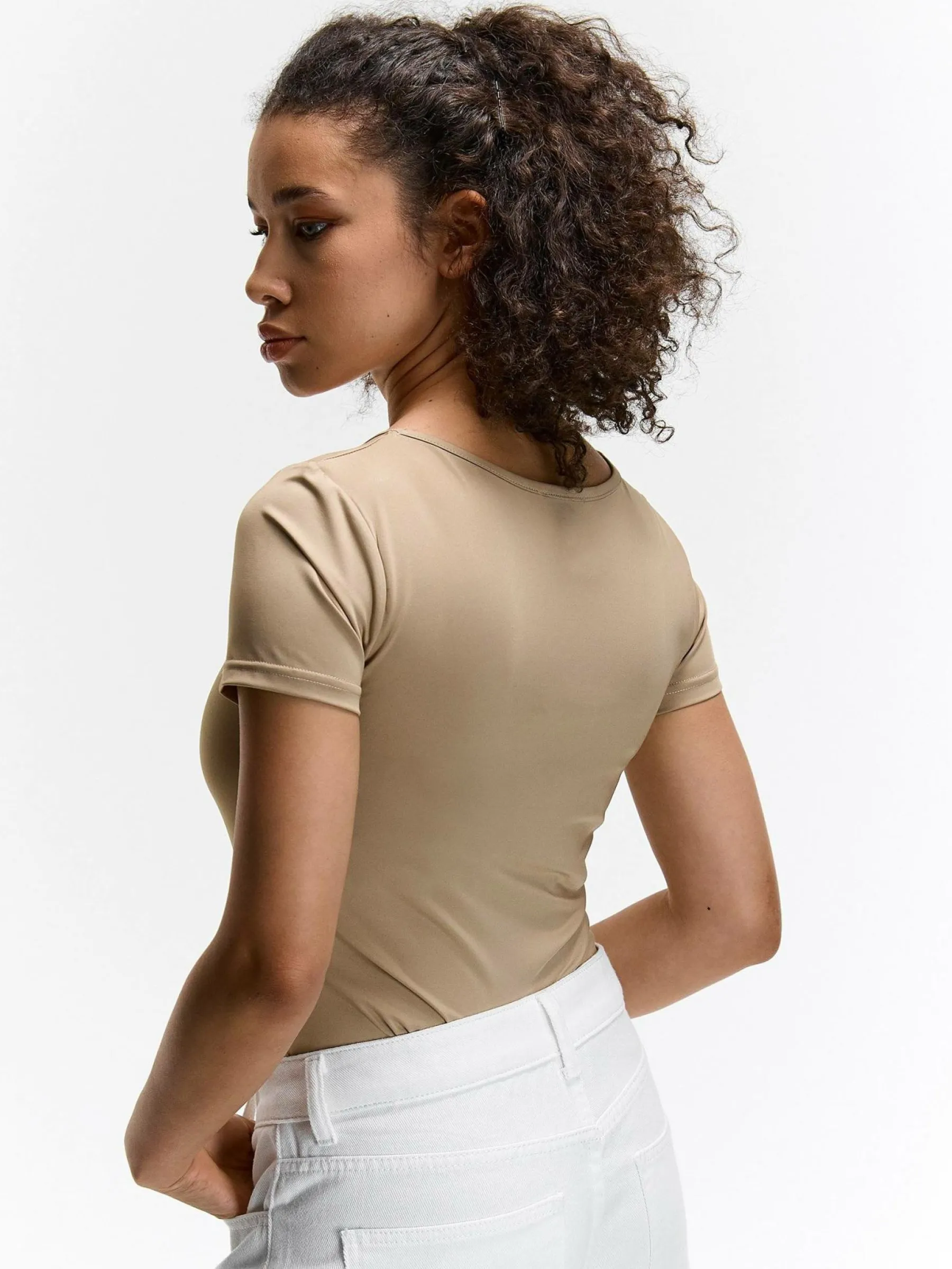 Kolor: beżowyKrój: regularTyp: koszulkaRekaw: krótki rękawDługość: krótkiPattern style: pojedynczy kolorDetal: n…