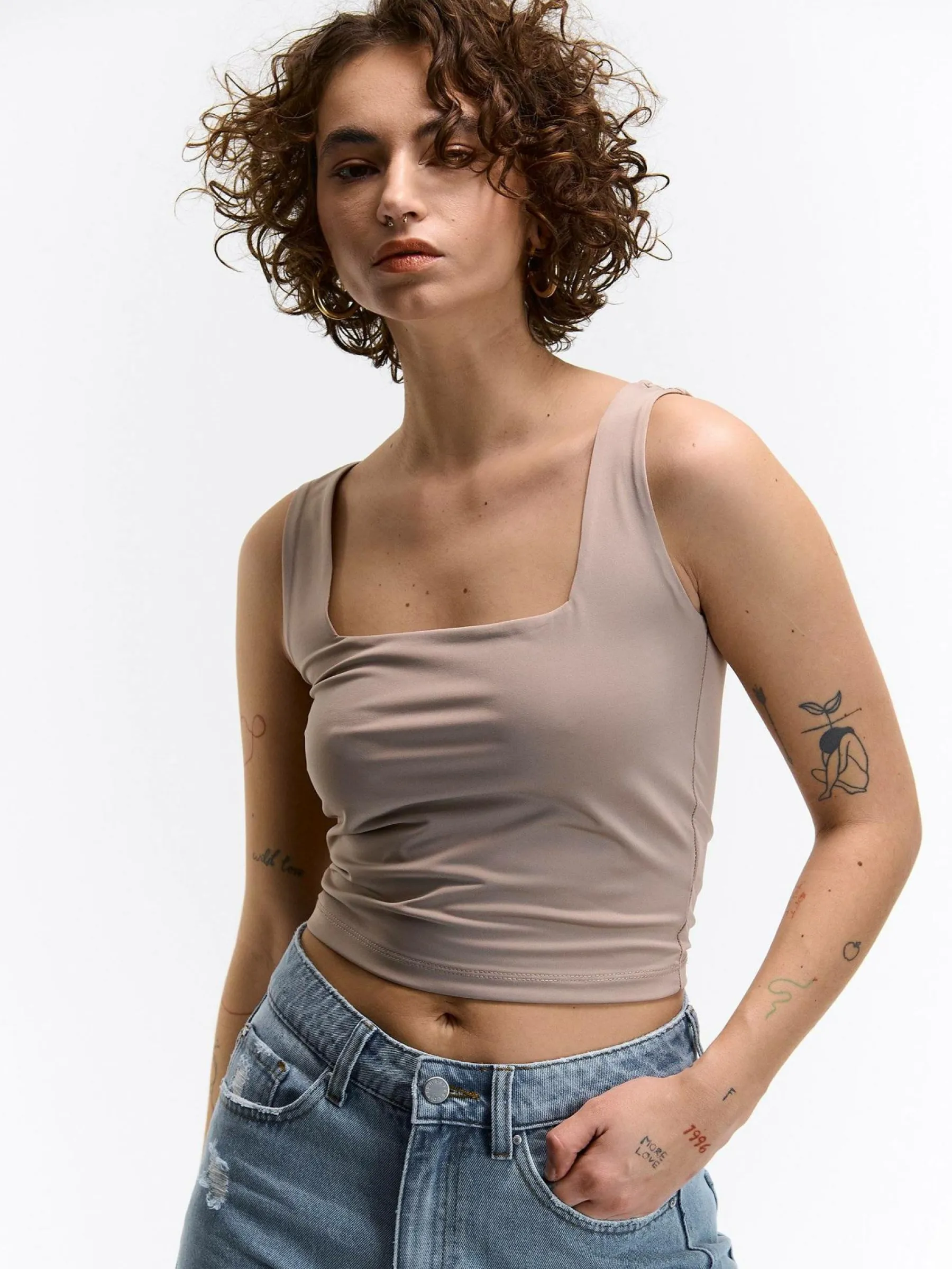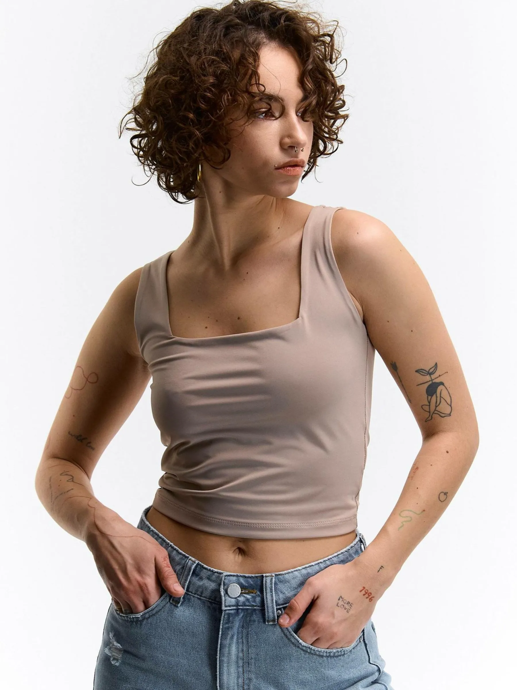 Kolor: beżowyKrój: ołówkoweTyp: podkoszulekRekaw: bez rękawówDługość: krótki topPattern style: pojedynczy kolo…