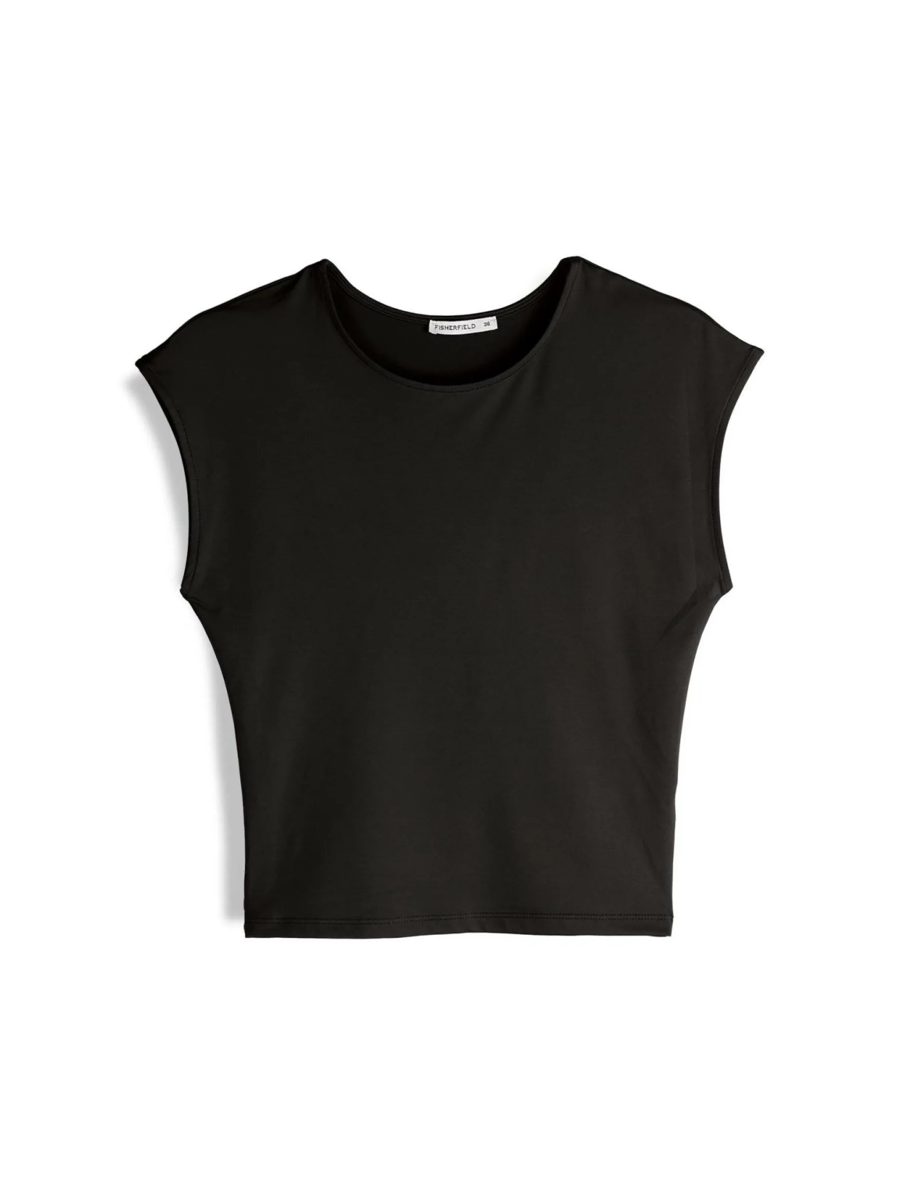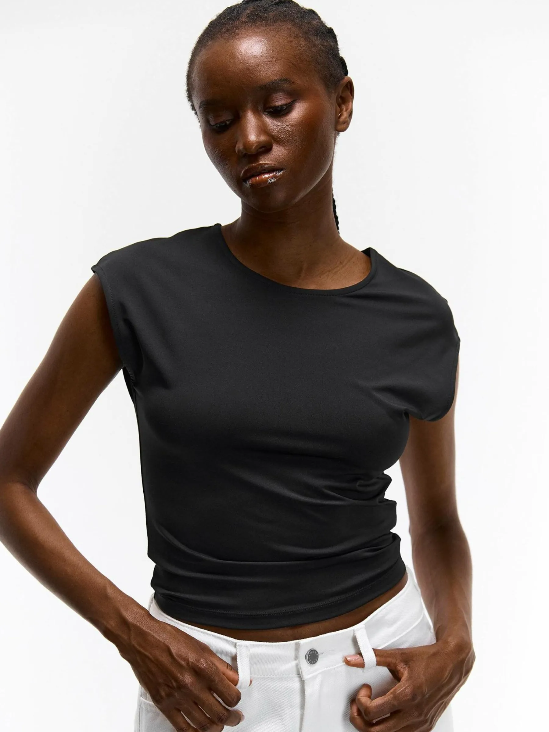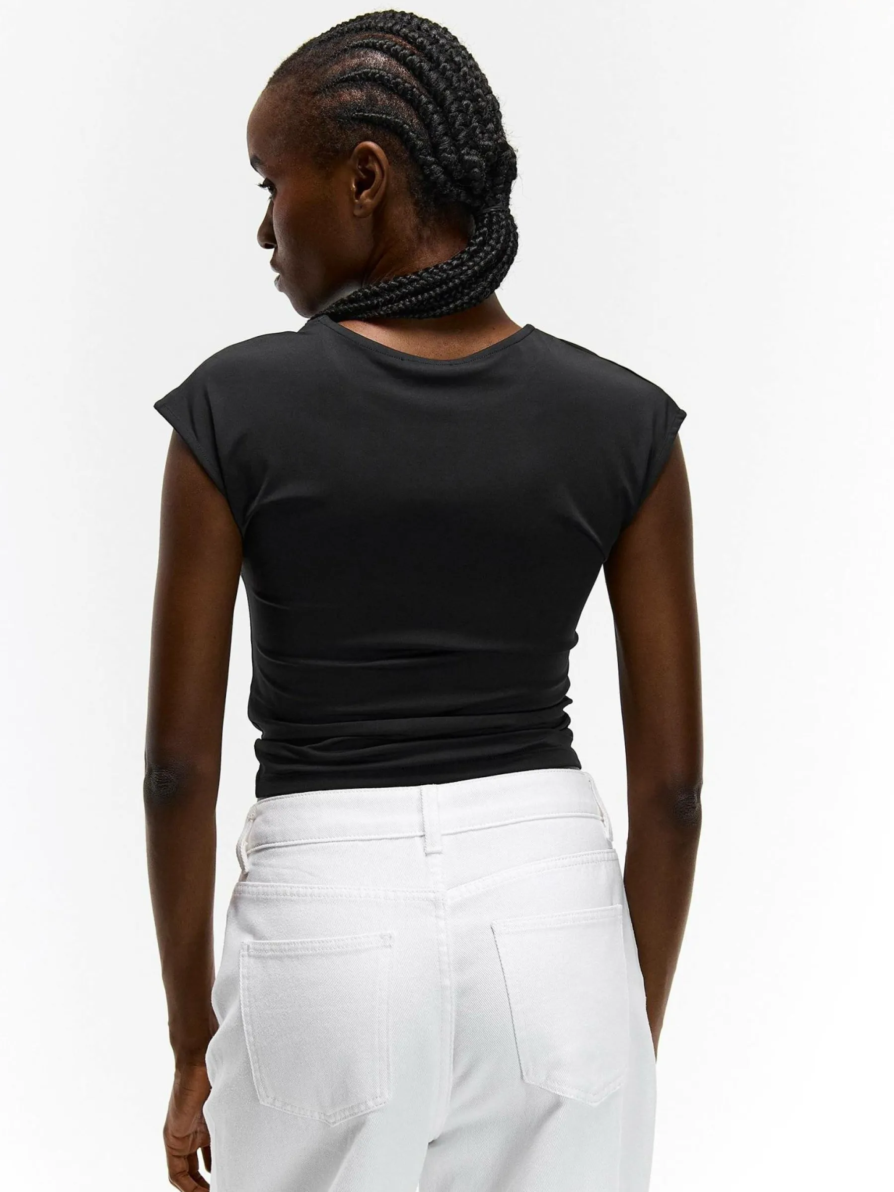 Kolor: czarnyKrój: regularTyp: topRekaw: krótki rękawDługość: krótkiPattern style: pojedynczy kolorDetal: nad gł…