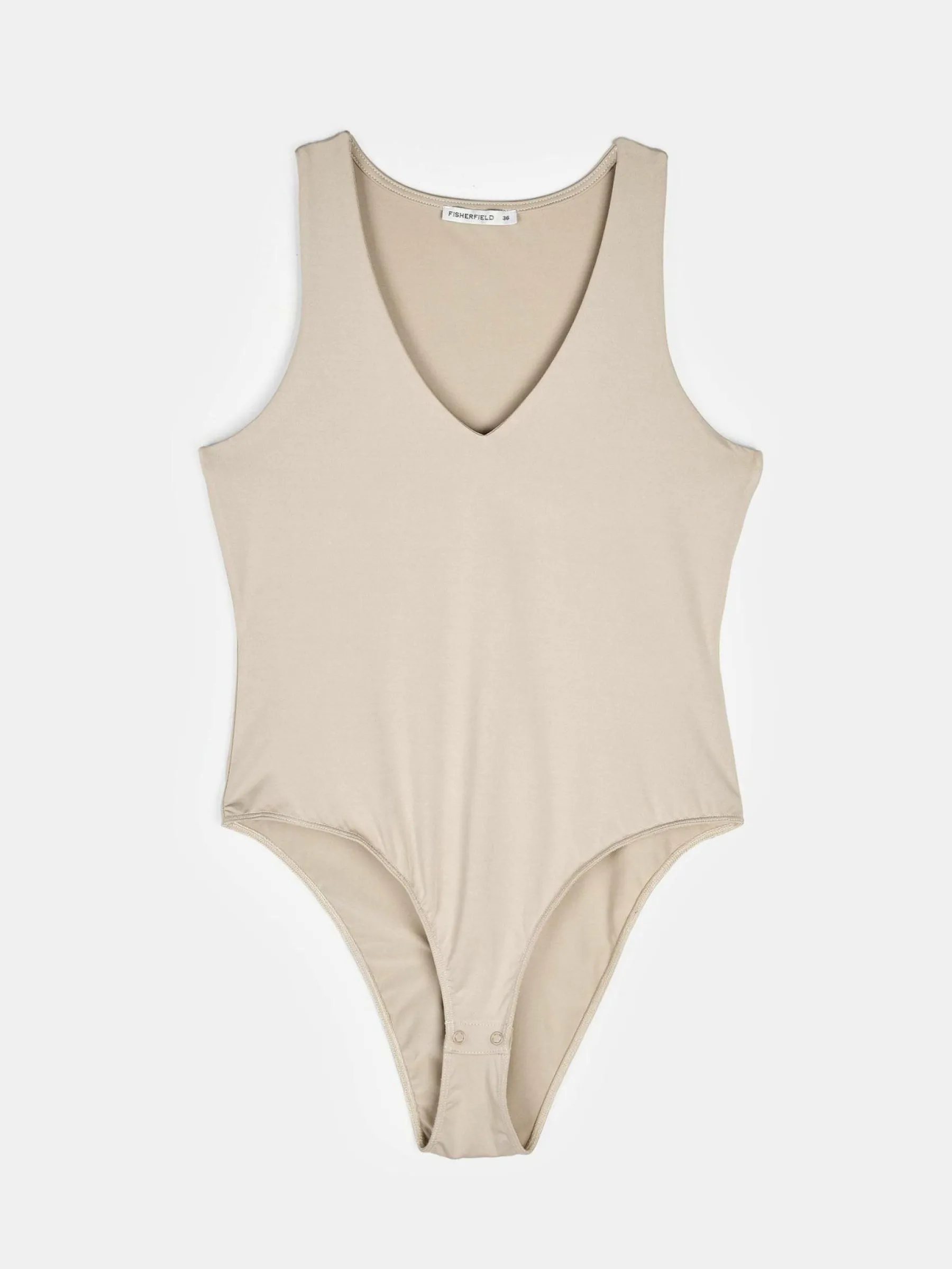 Kolor: beżowyKrój: slimTyp: bodyRekaw: bez rękawówDługość: krótkiPattern style: pojedynczy kolorDetal: v-neck, n…