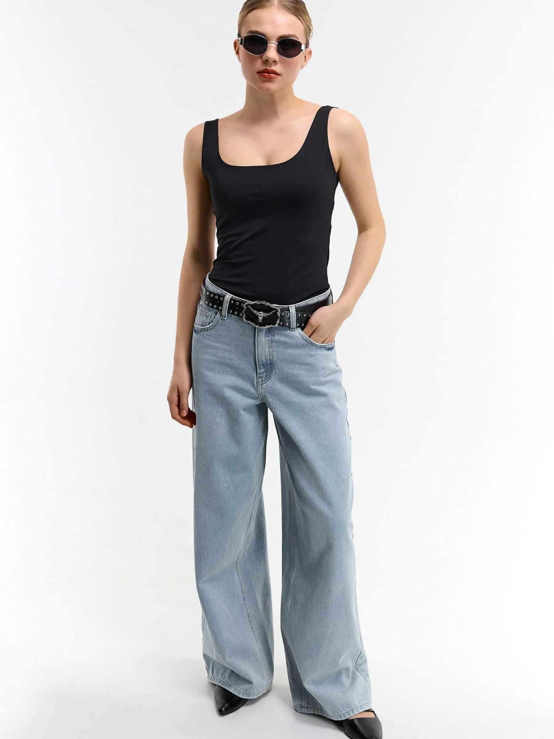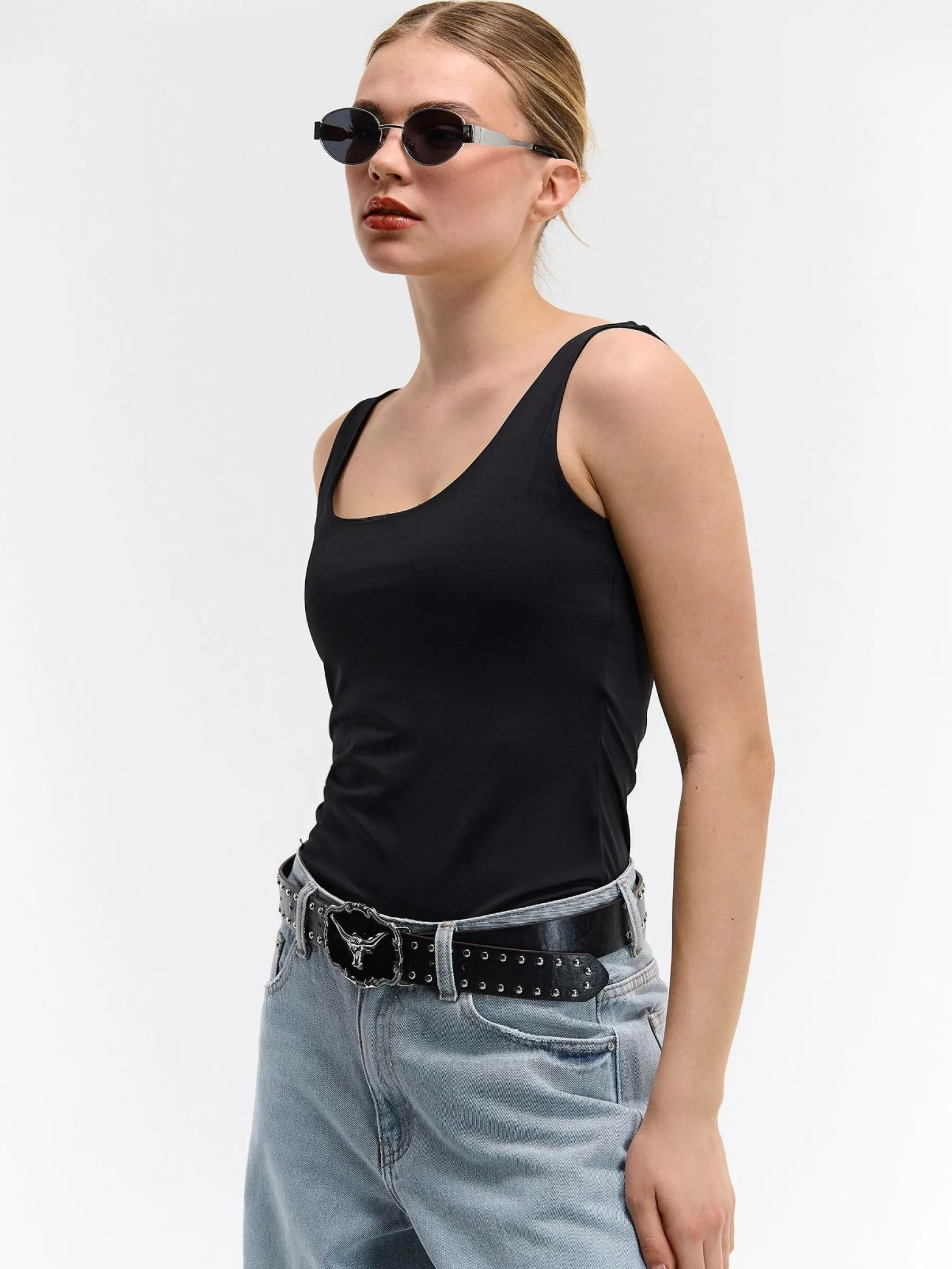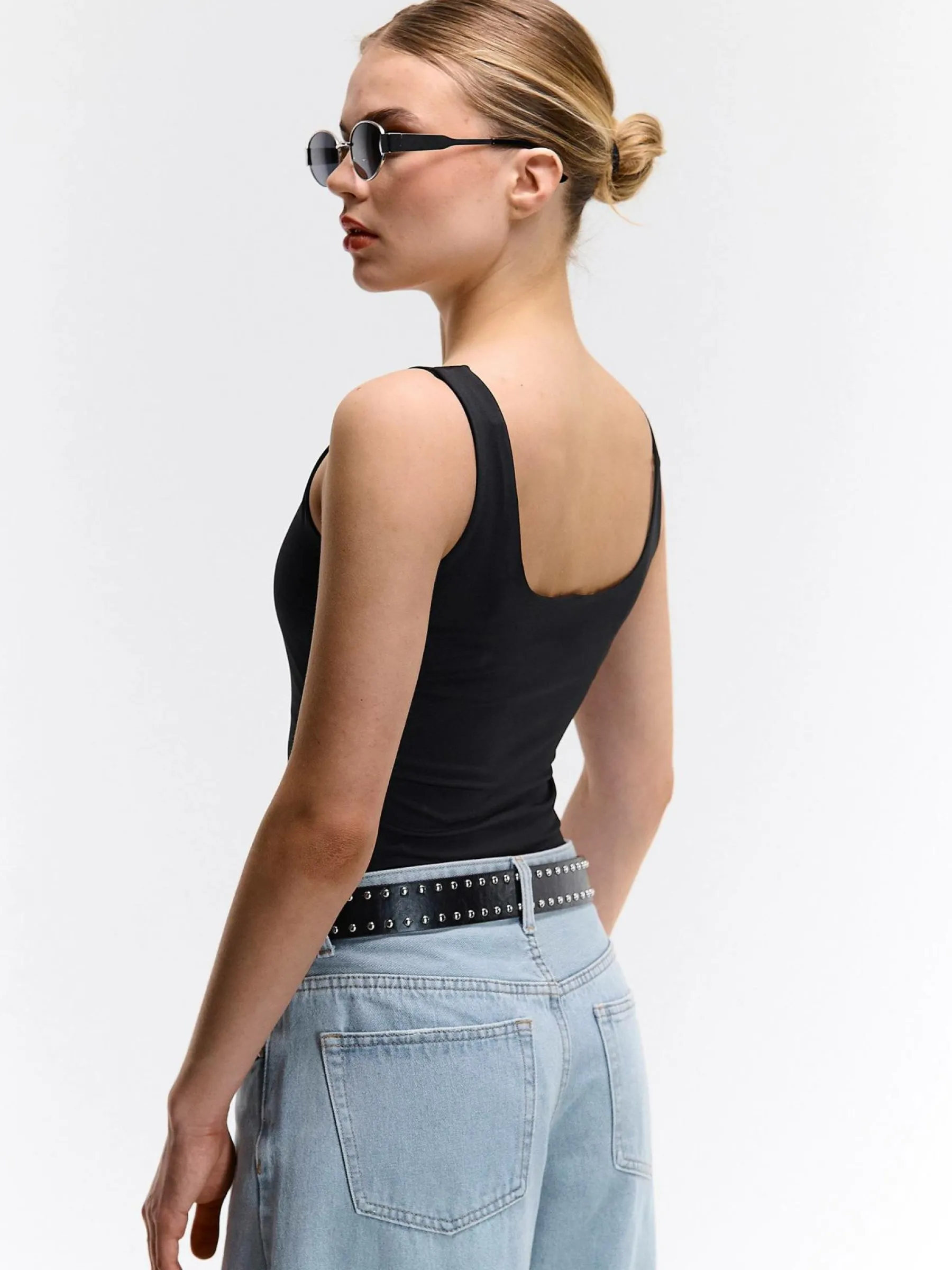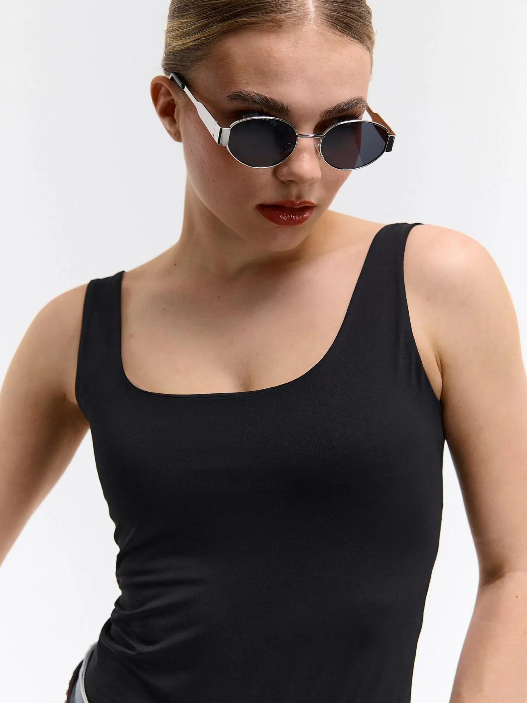 Kolor: czarnyKrój: slimTyp: bodyRekaw: bez rękawówDługość: krótkiPattern style: pojedynczy kolorDetal: na snapyMa…