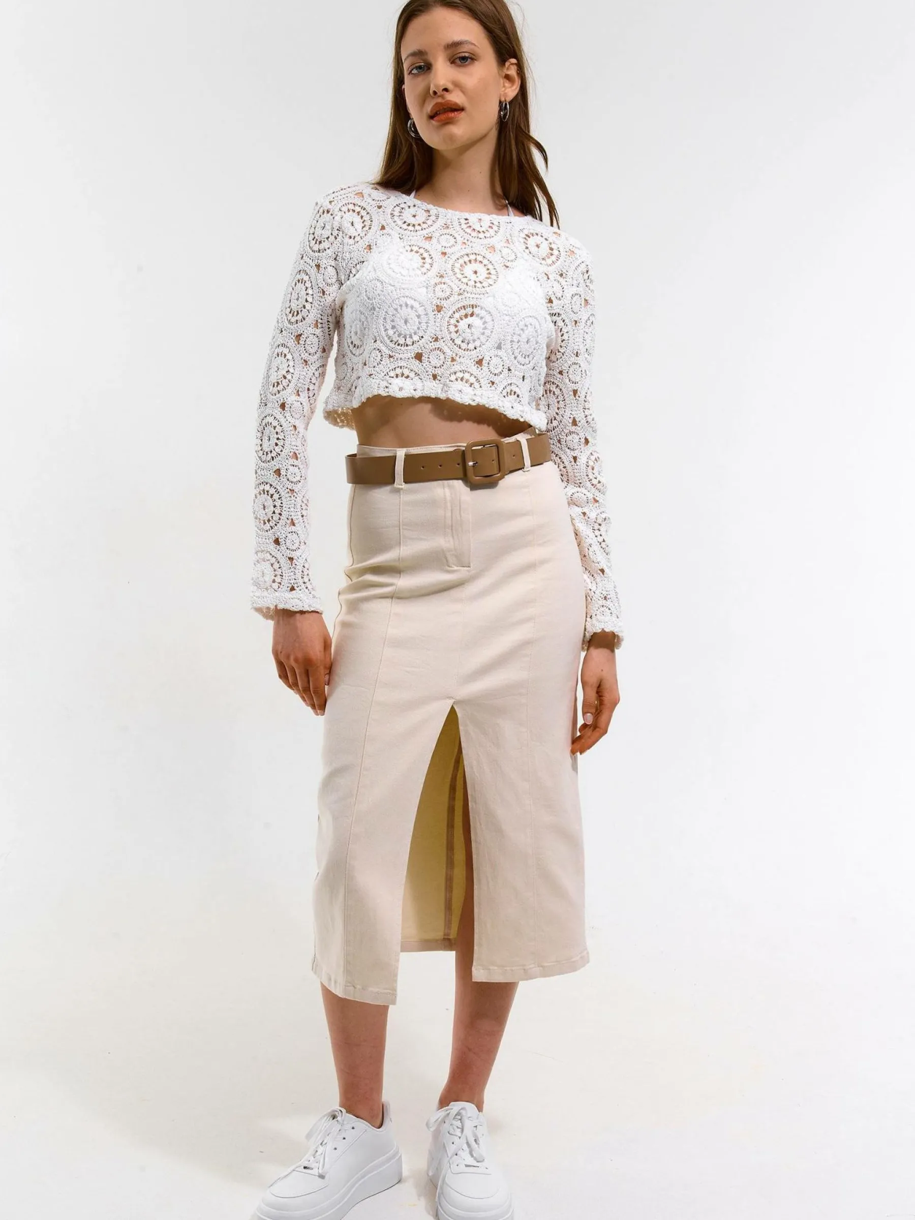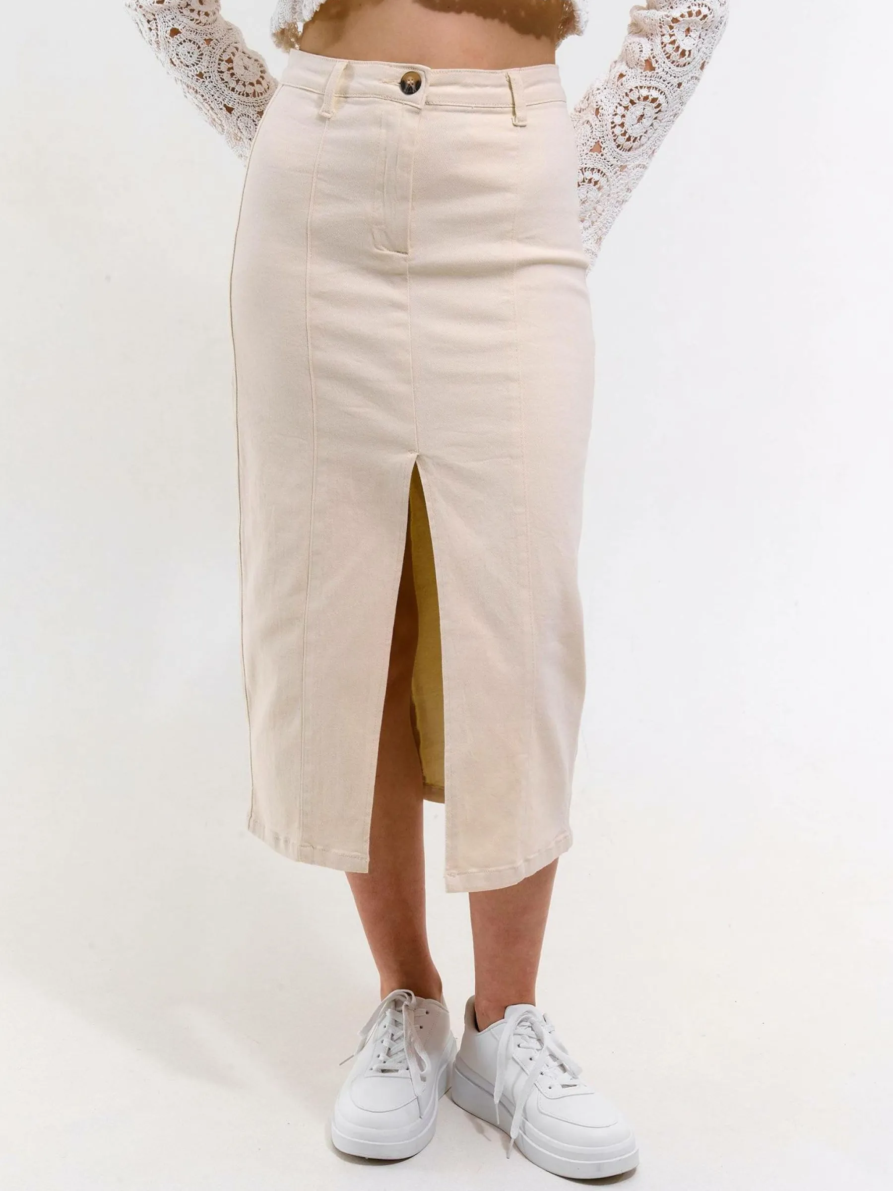 Kolor: beżowyKrój: podstawowyTyp: spódnicaDługość: midiPattern style: pojedynczy kolorDetal: z rozcięciem, na zam…