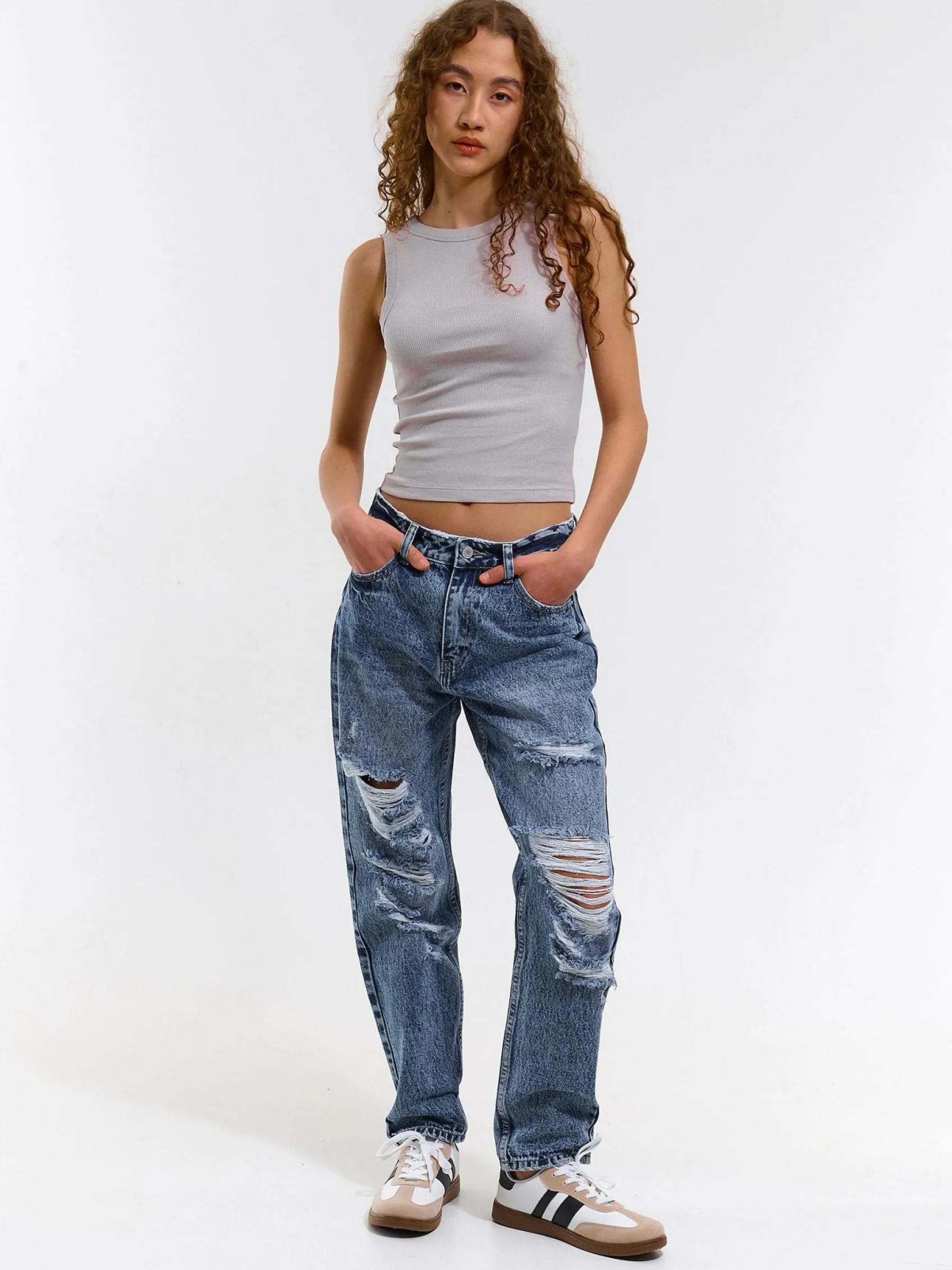 Kolor: niebieskiKrój: mamaTyp: jeansDługość: dlugiePattern style: pojedynczy kolorDetal: na zamek, z otworamiMateria…