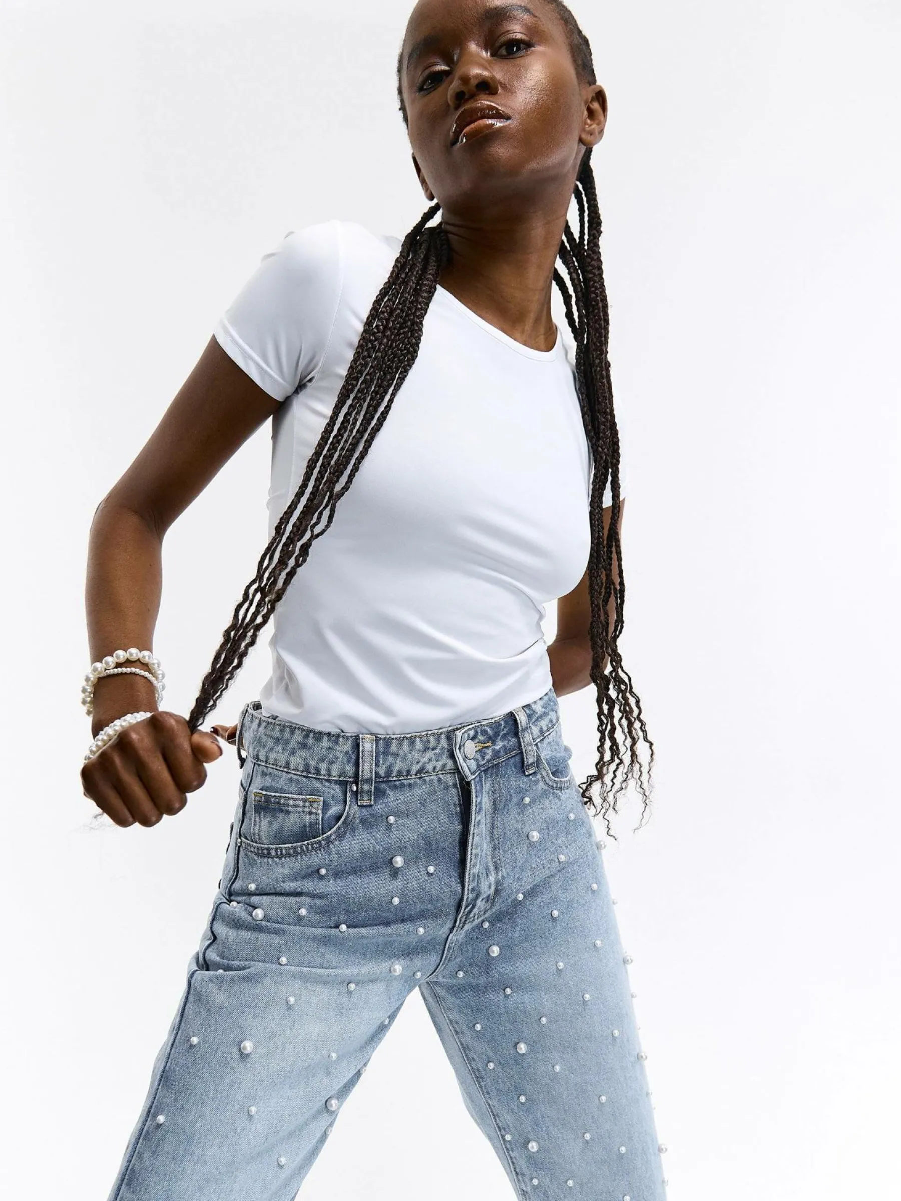 Kolor: niebieskiKrój: straightTyp: jeansDługość: dlugiePattern style: pojedynczy kolorDetal: z perełkamiMateriał: …