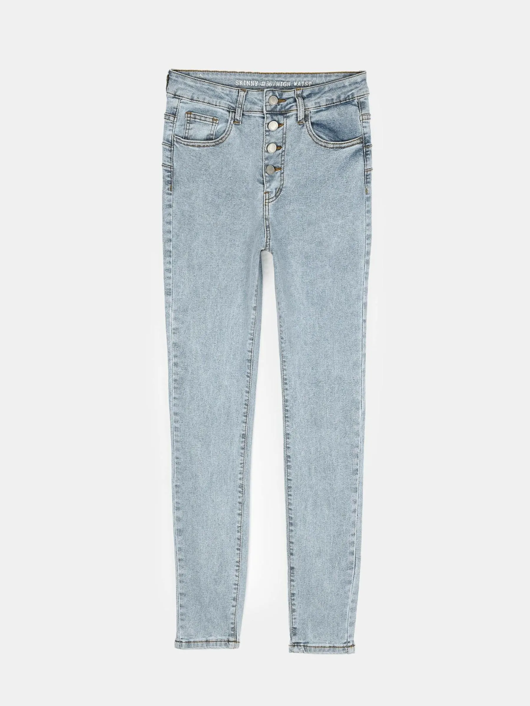 Kolor: niebieskiKrój: skinny, z wysokim stanemTyp: jeansDługość: dlugiePattern style: pojedynczy kolorDetal: na guzi…