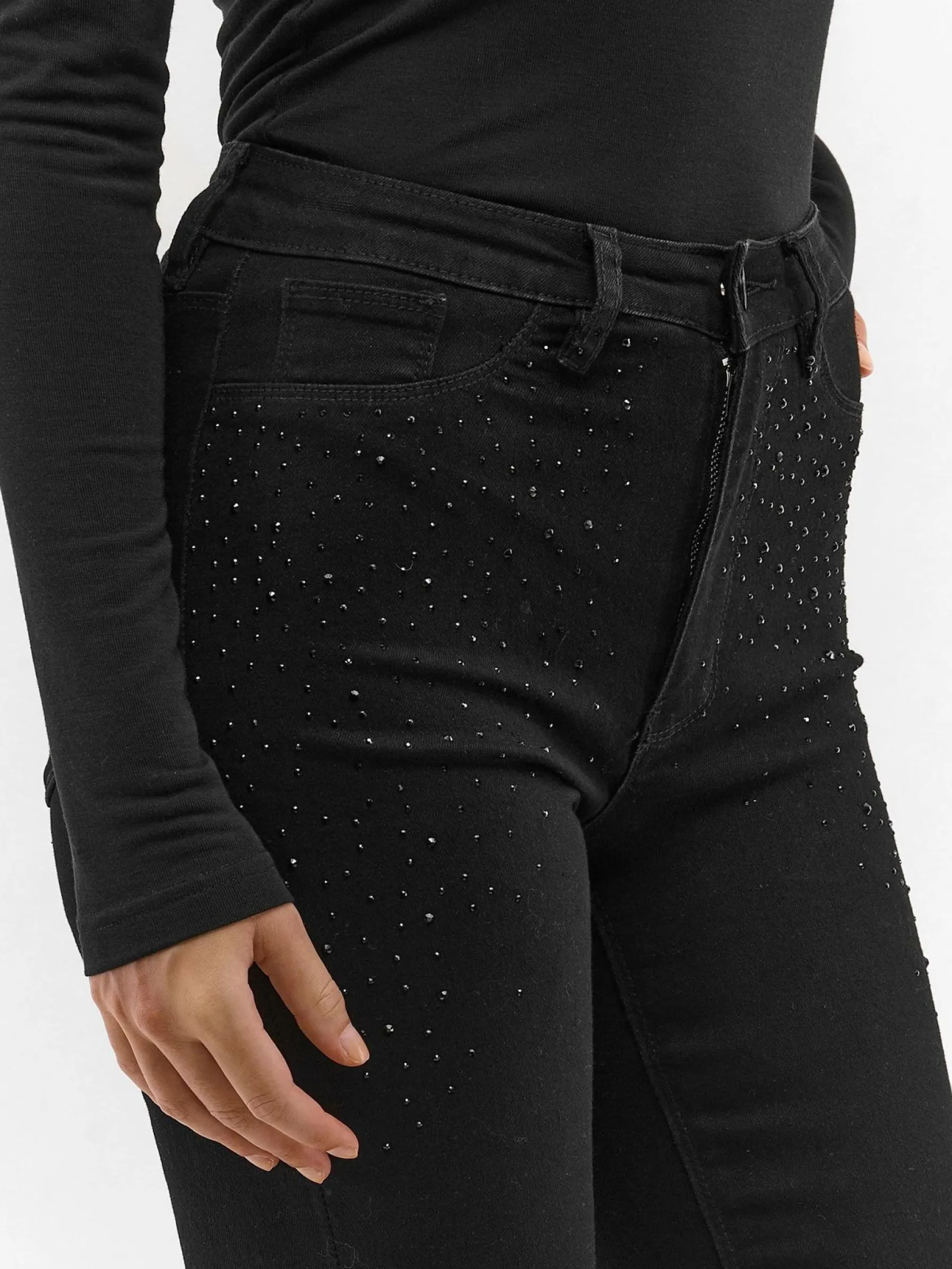 Kolor: czarnyKrój: skinnyTyp: jeansDługość: dlugiePattern style: pojedynczy kolorDetal: z kamieniami, na zamekMateri…