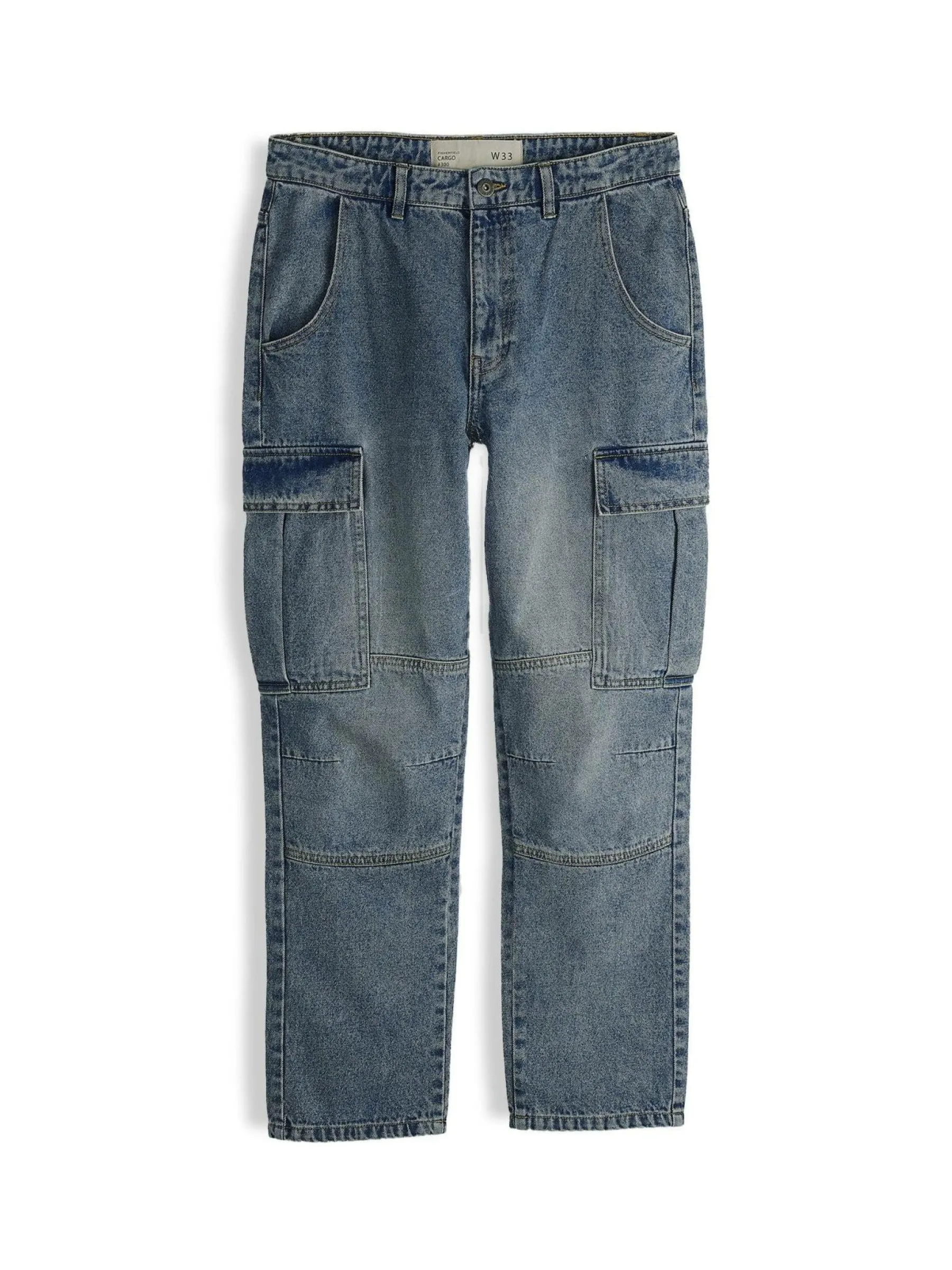 Kolor: niebieskiKrój: cargoTyp: jeansDługość: dlugiePattern style: pojedynczy kolorDetal: na zamek, z kieszeniamiMat…