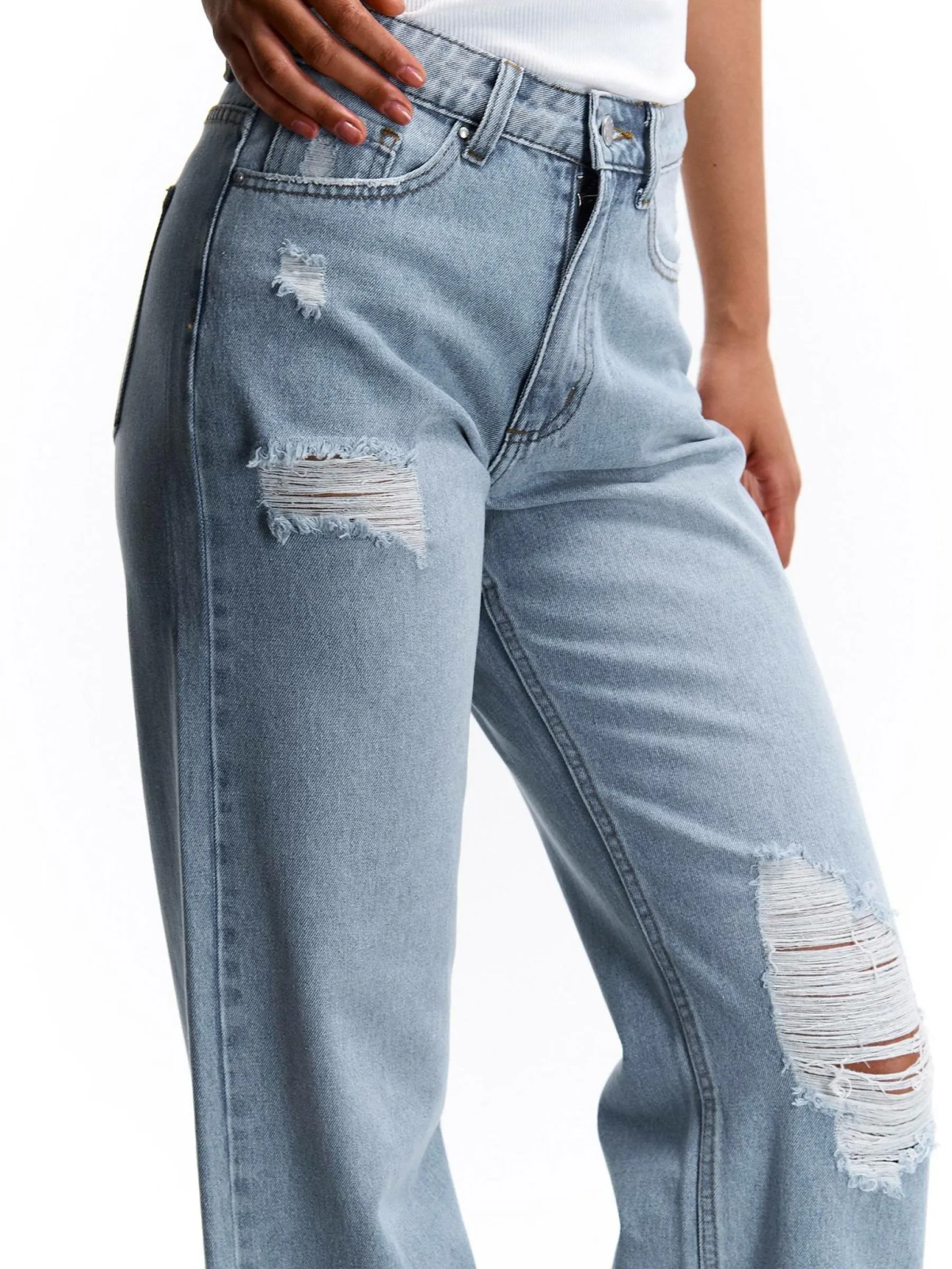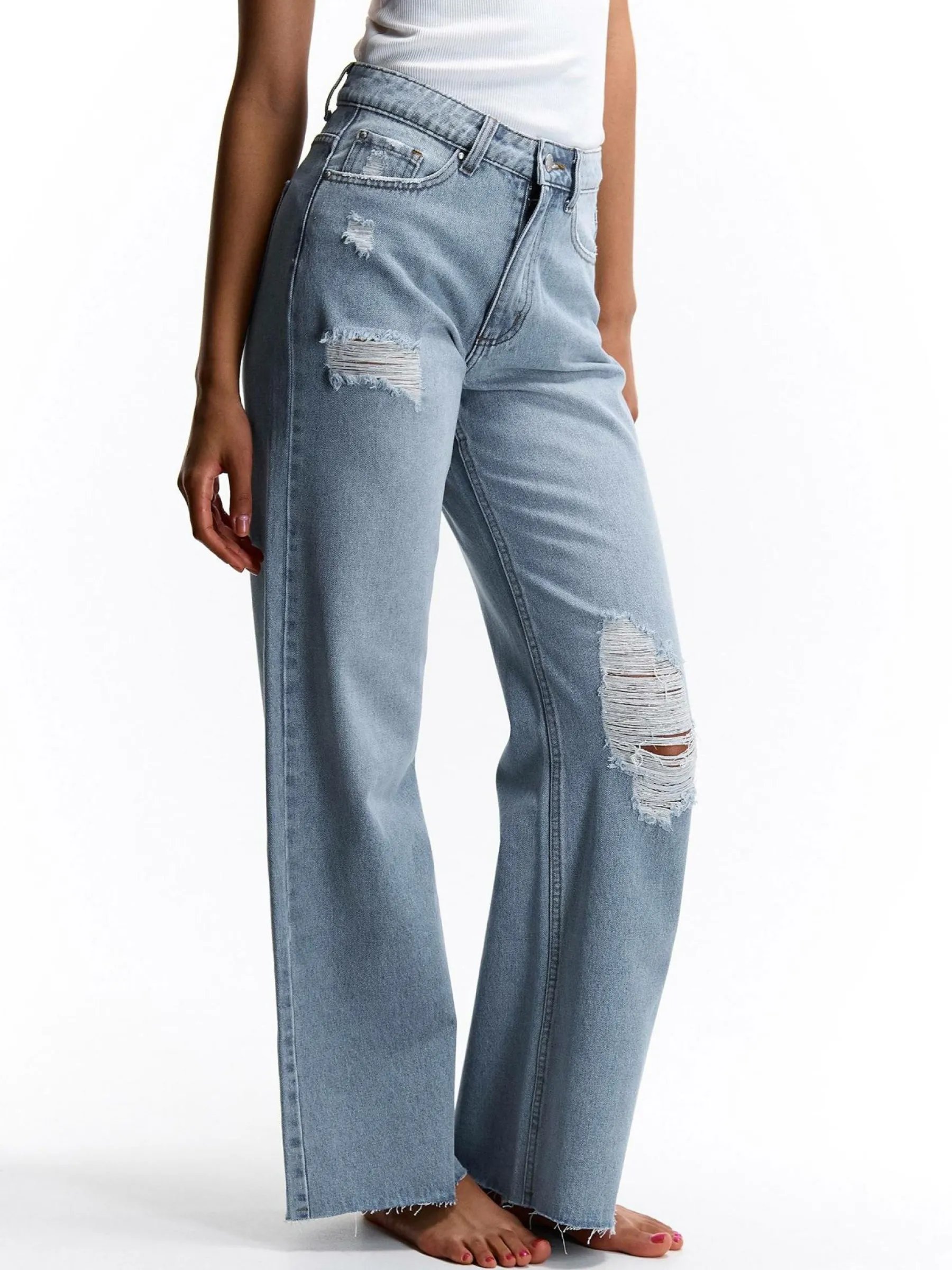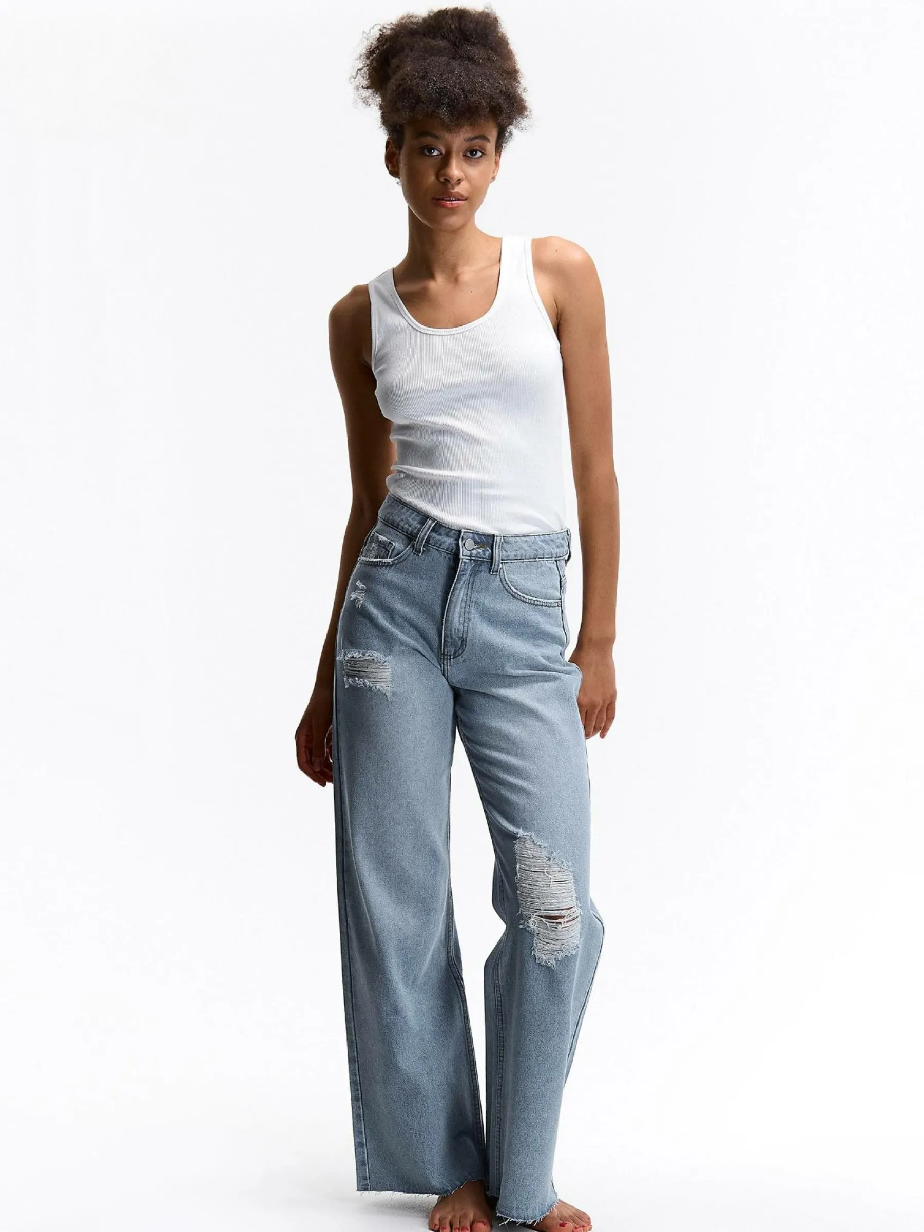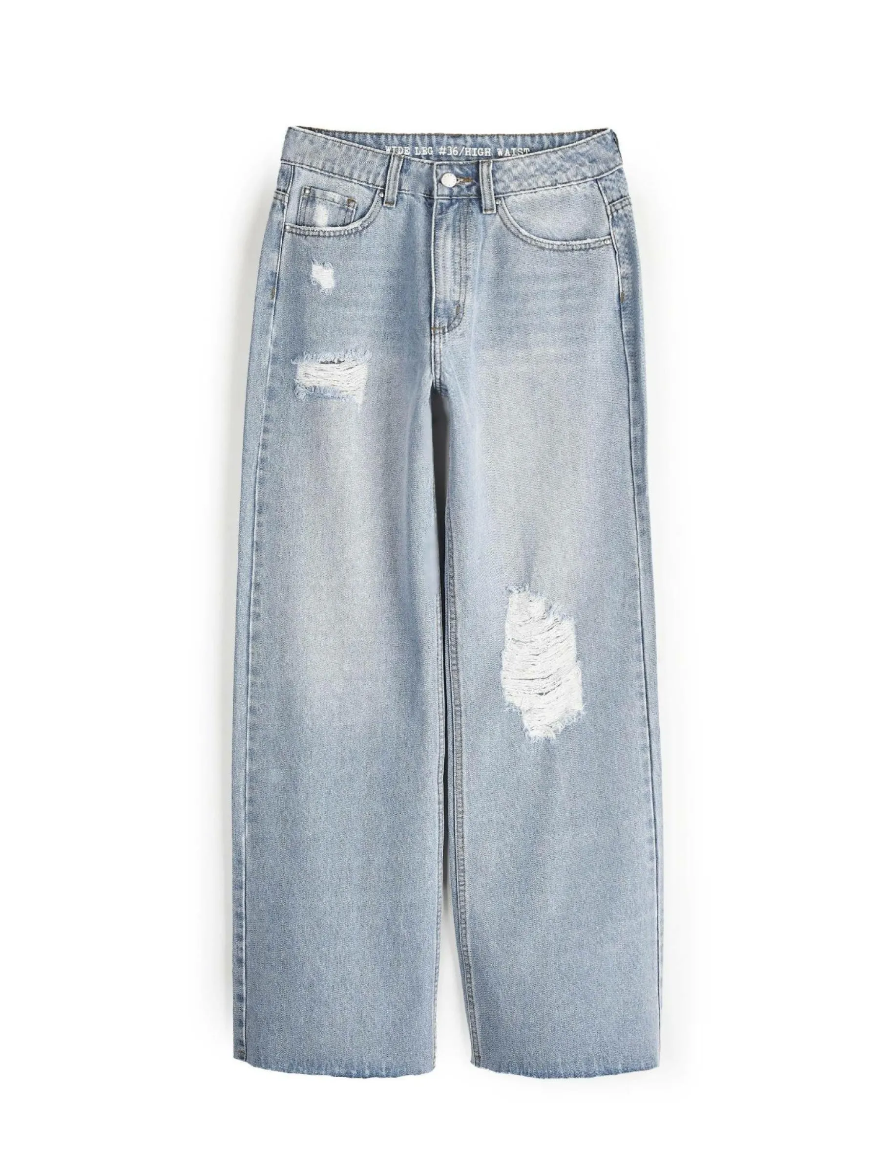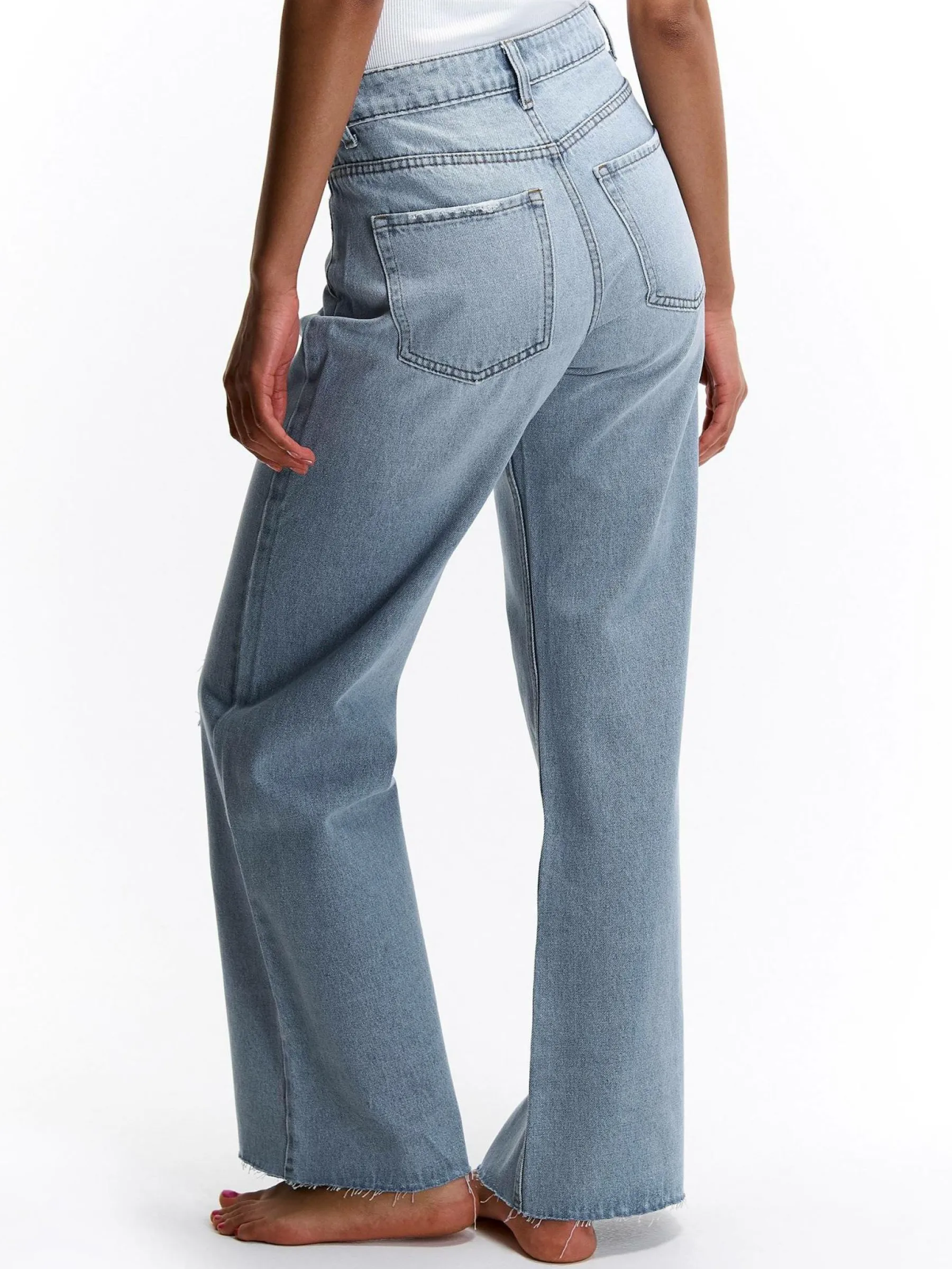 Kolor: niebieskiKrój: z wysokim stanem, szerokieTyp: jeansDługość: dlugiePattern style: pojedynczy kolorDetal: z otw…