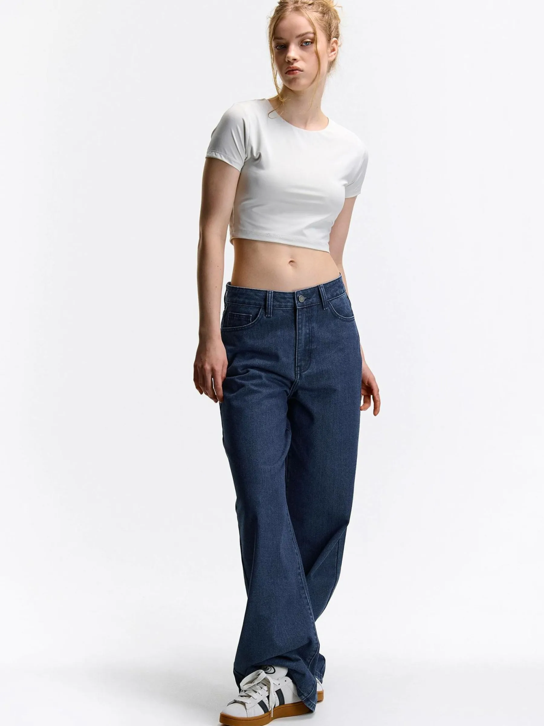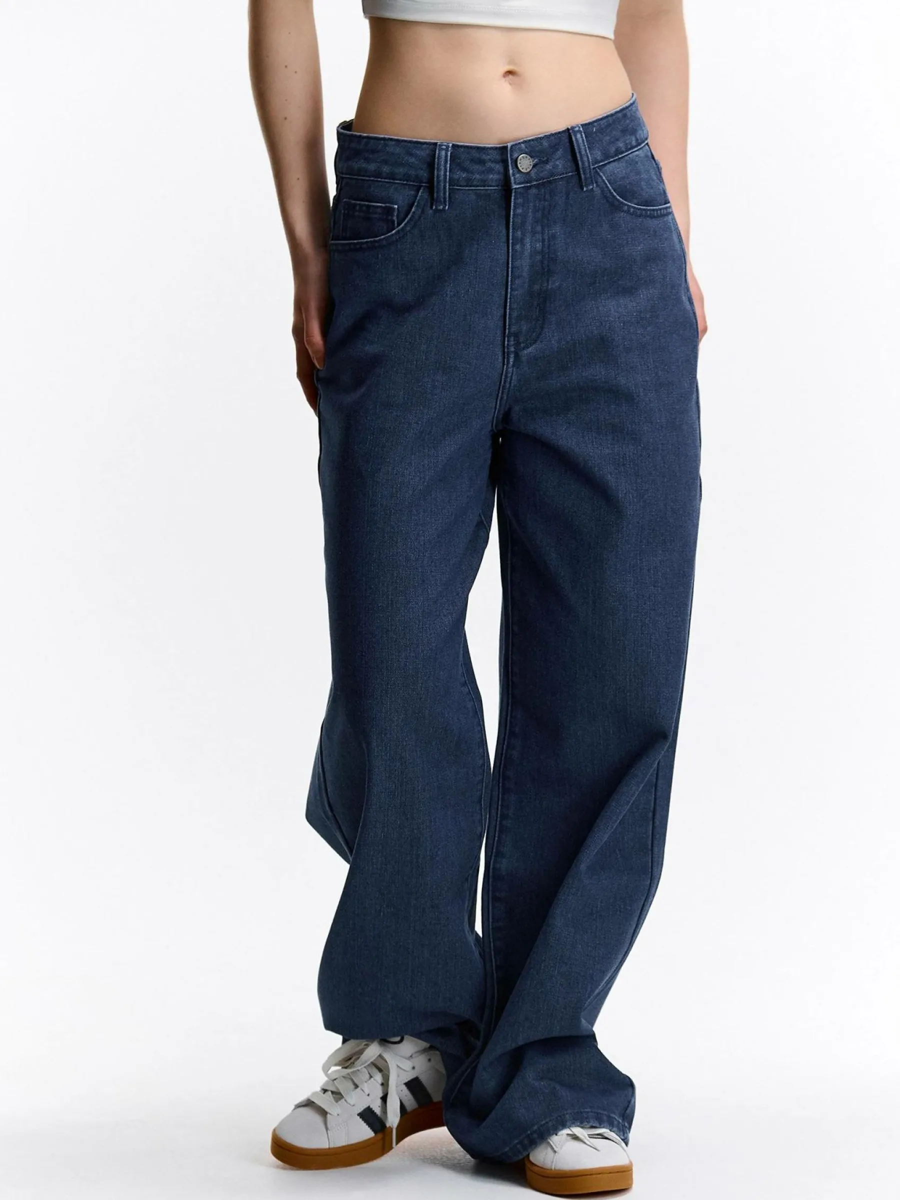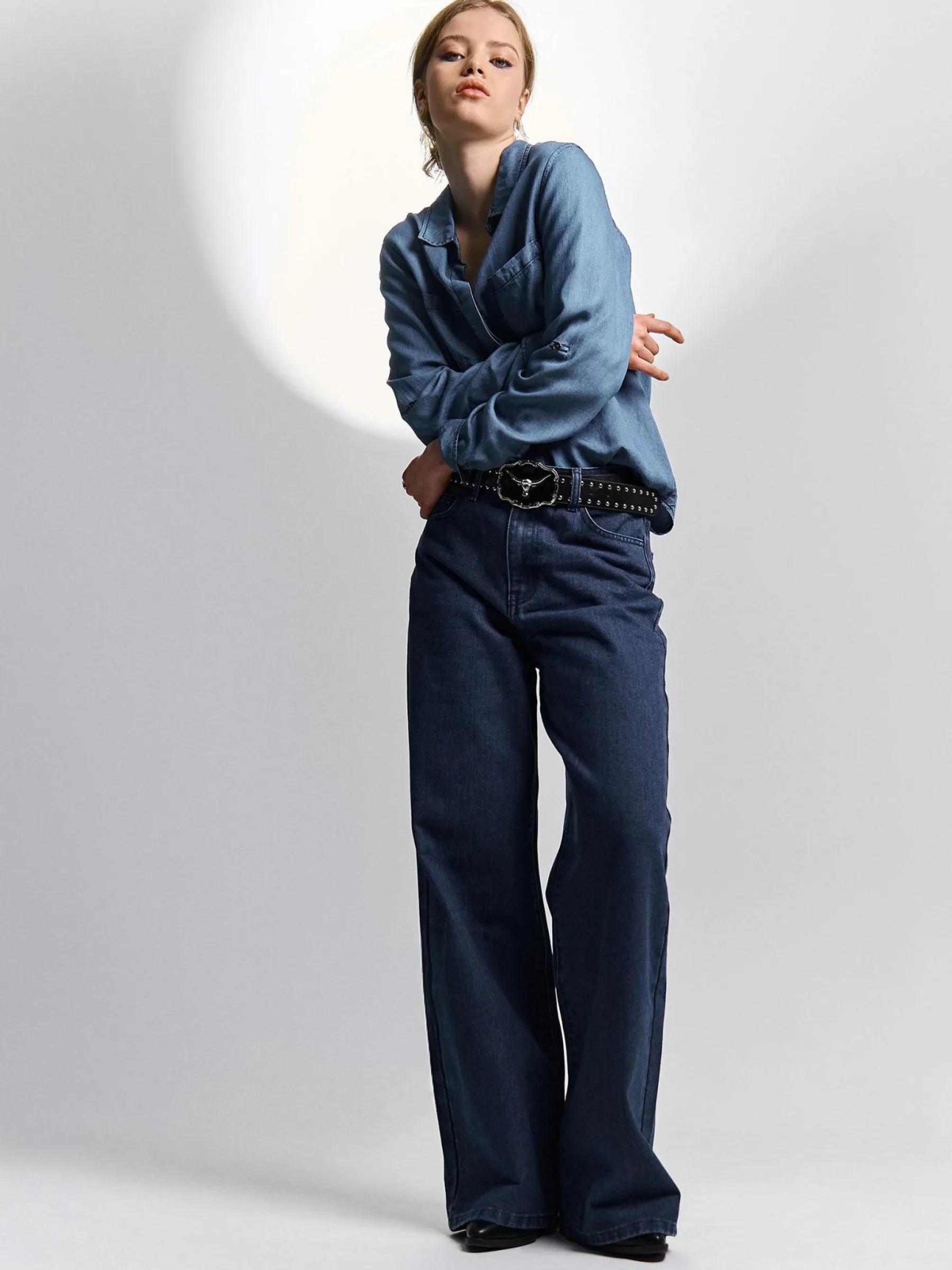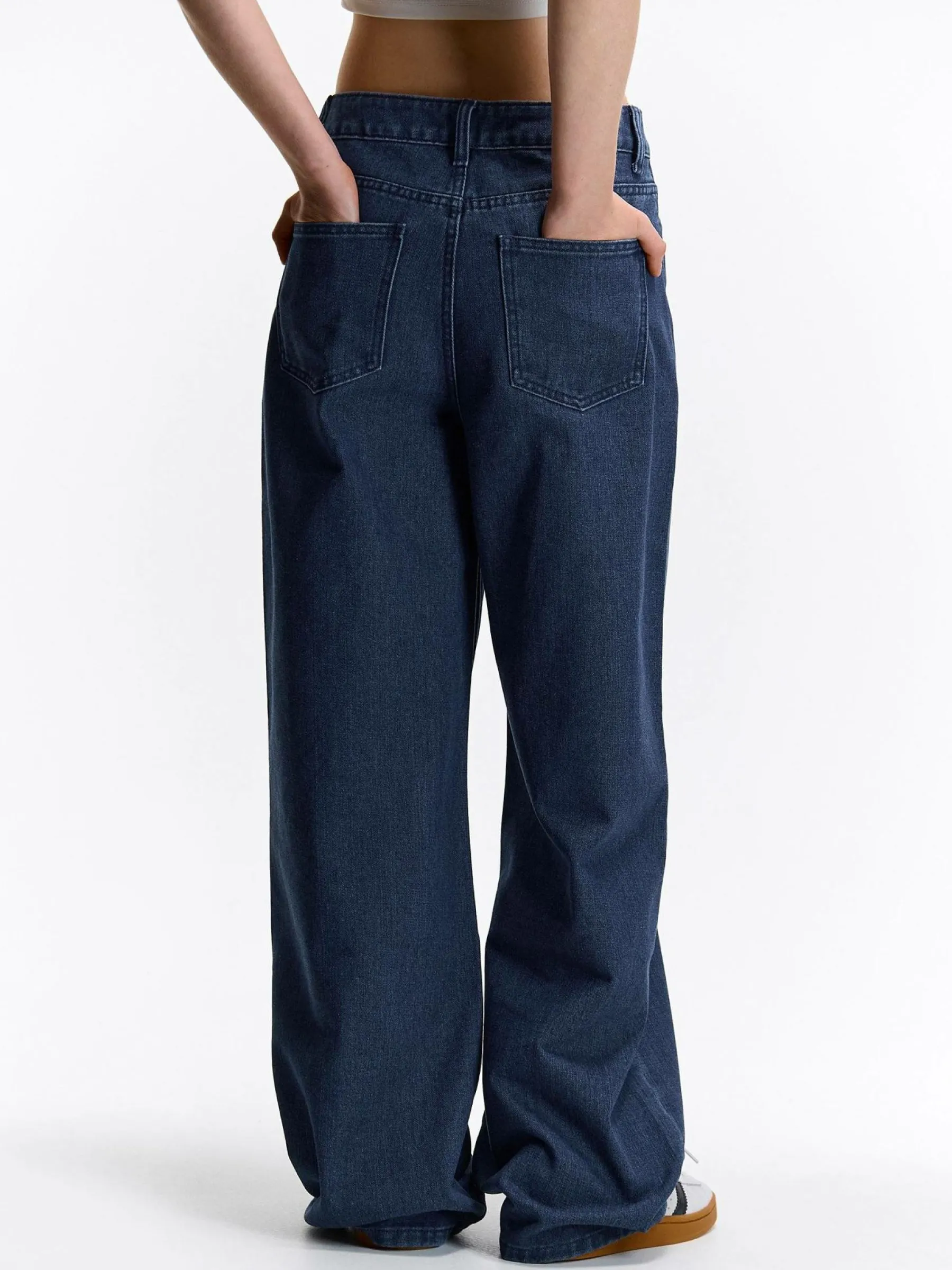 Kolor: granatowyKrój: szerokieTyp: jeansDługość: dlugiePattern style: pojedynczy kolorDetal: na zamekMateriał: dżi…