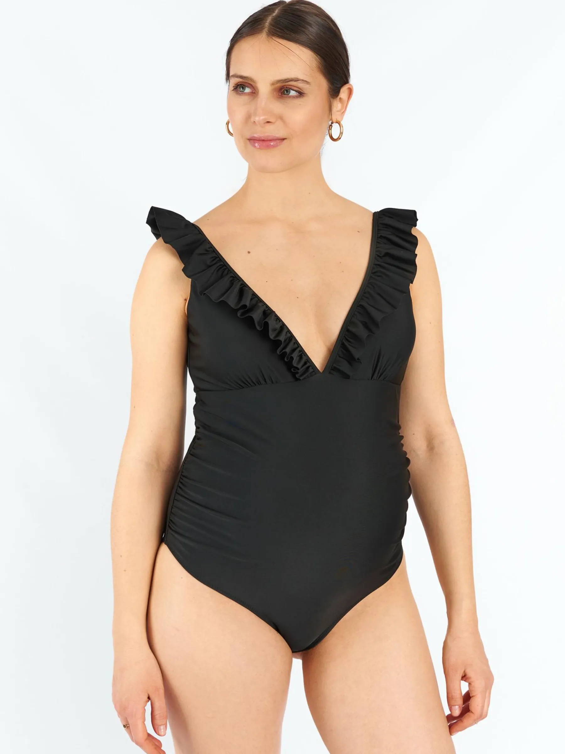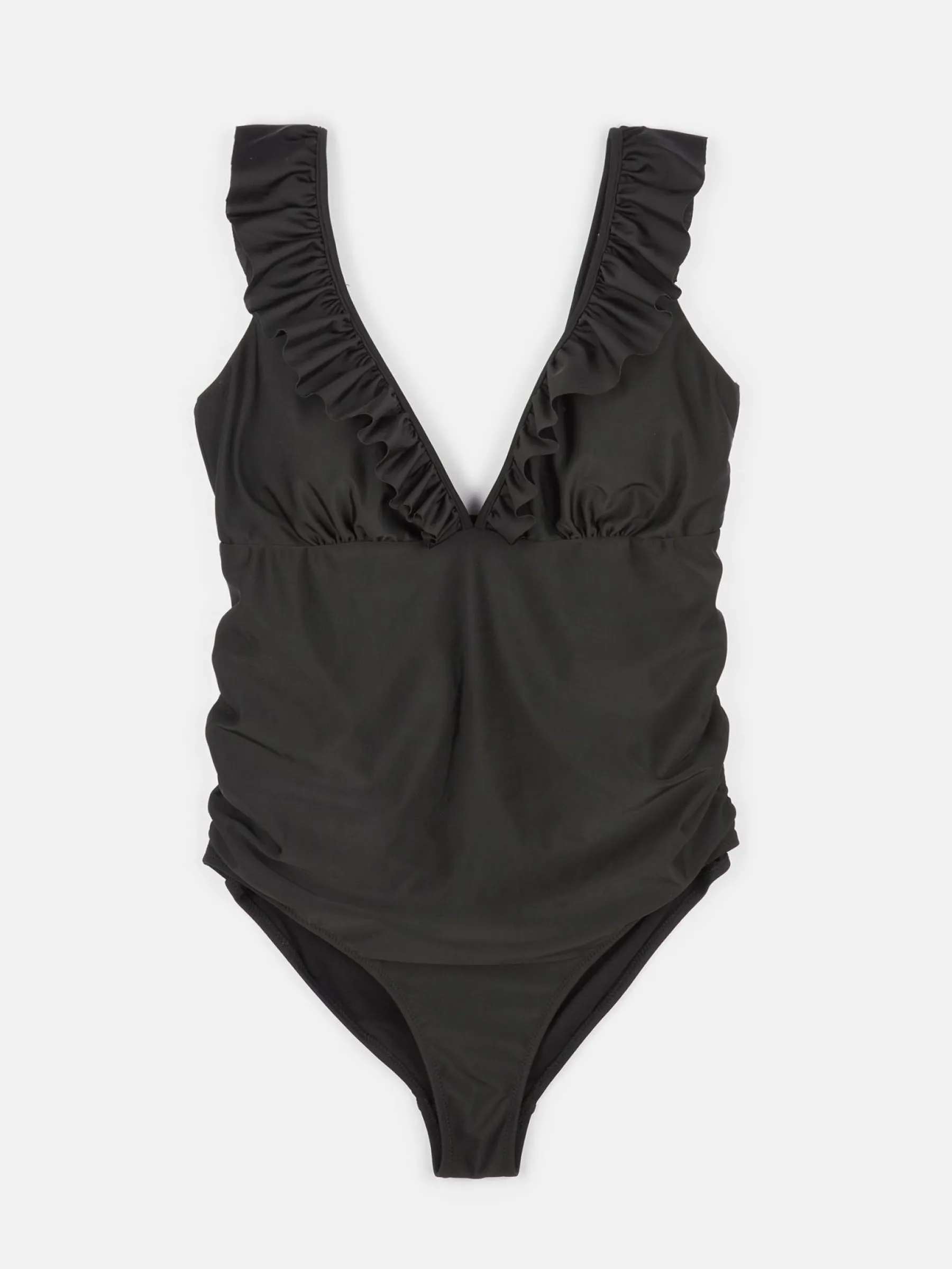 Kolor: czarnyKrój: z falbanąTyp: jednoczęściowy strój kąpielowyPattern style: pojedynczy kolorDetal: wzmocnionyPł…