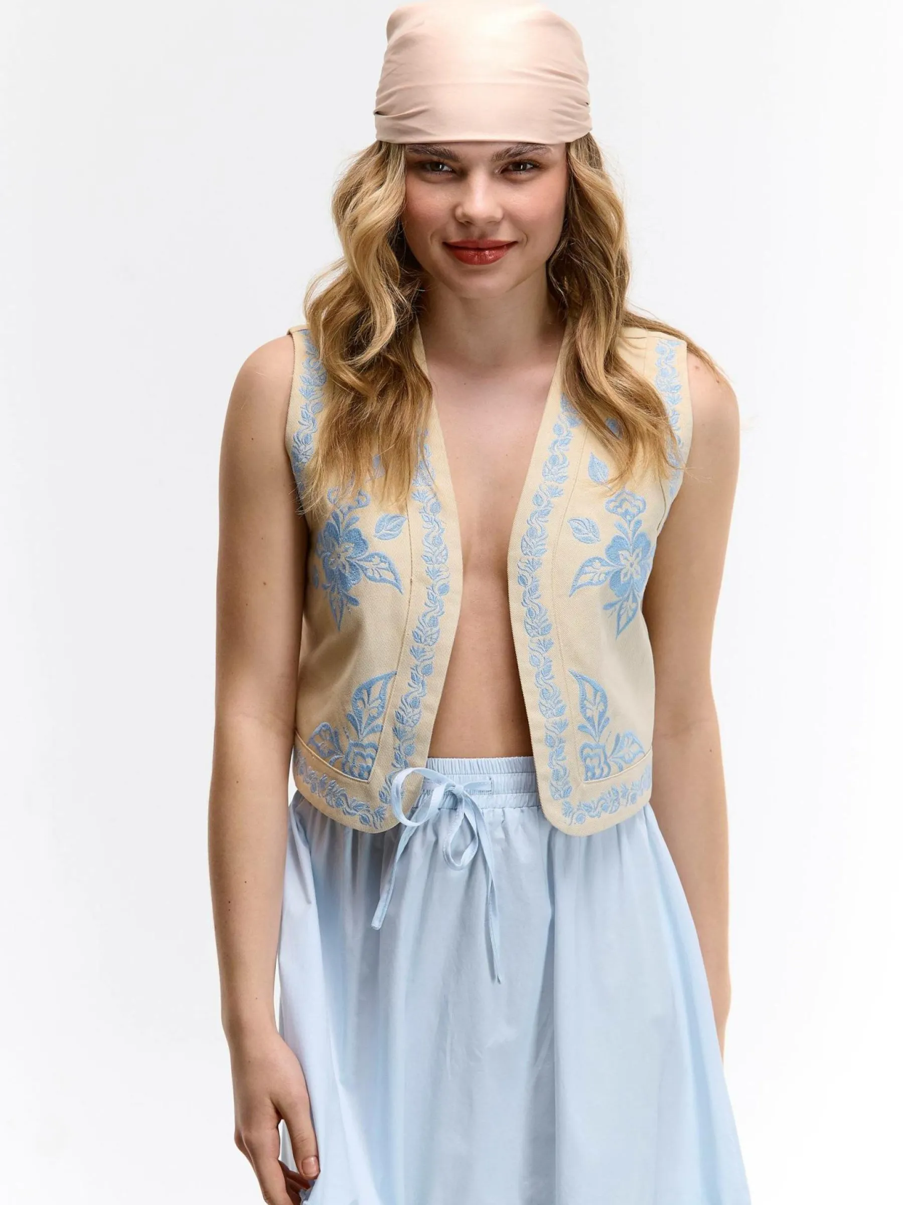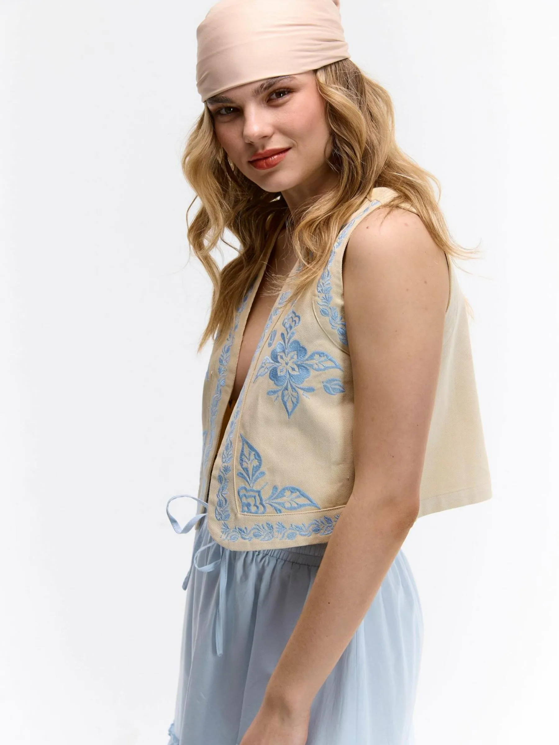 Kolor: beżowyKrój: regularTyp: kamizelkaRekaw: krótki rękawDługość: krótki topPattern style: haftowaneDetal: bez…