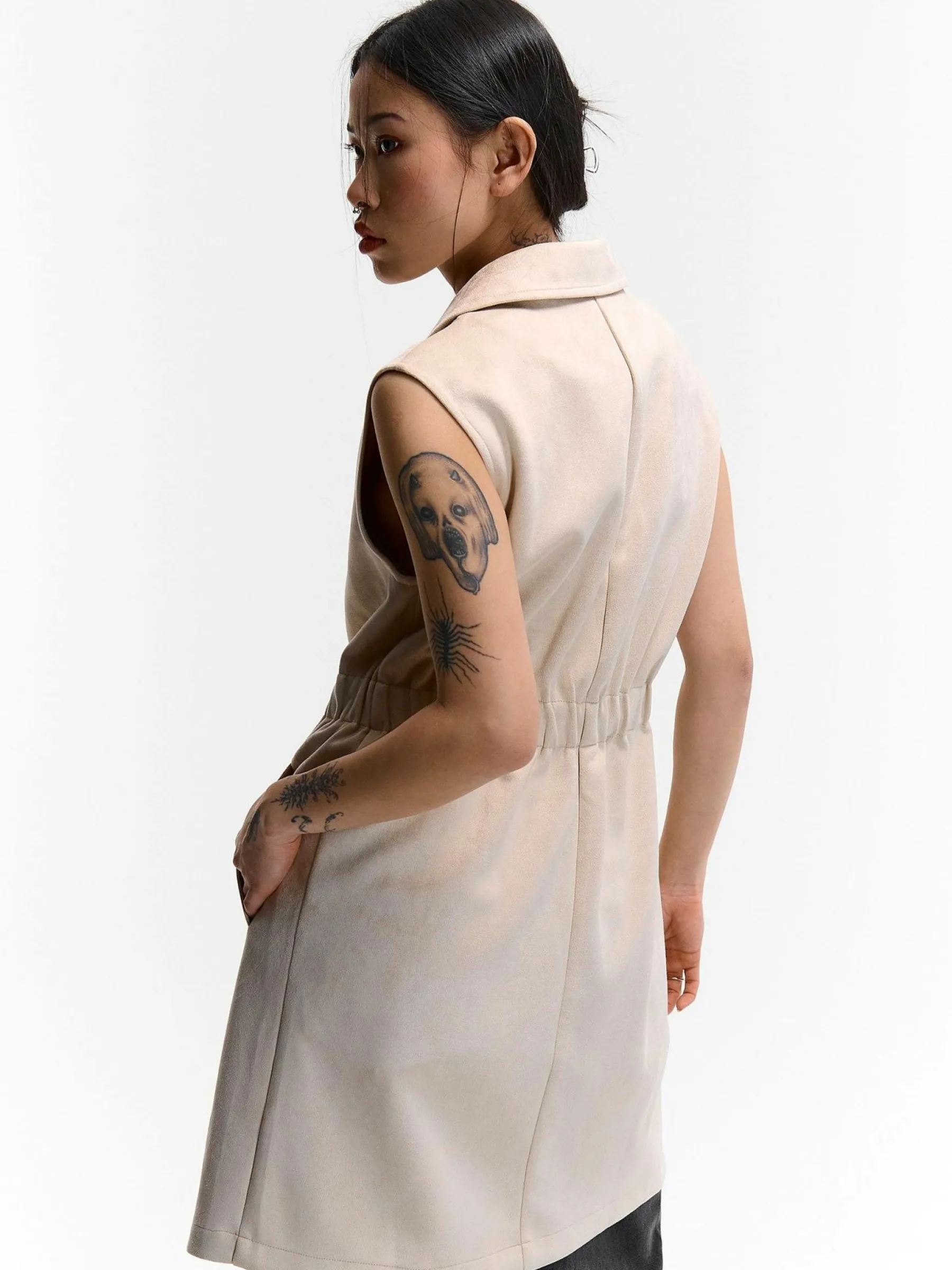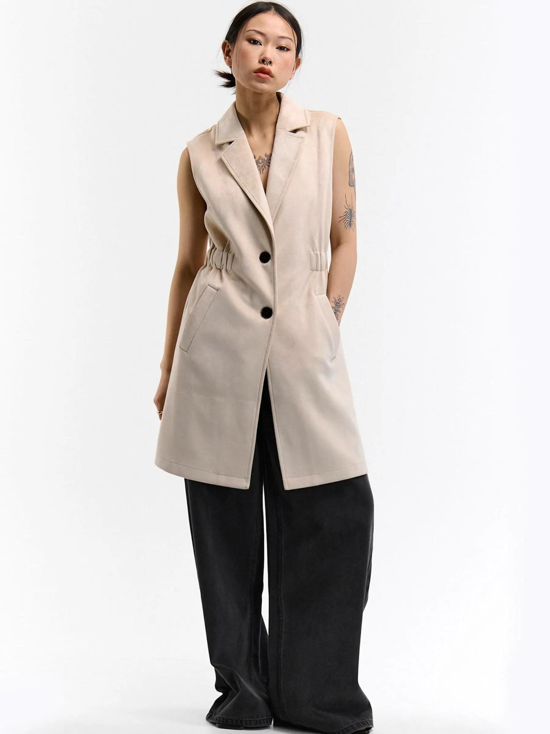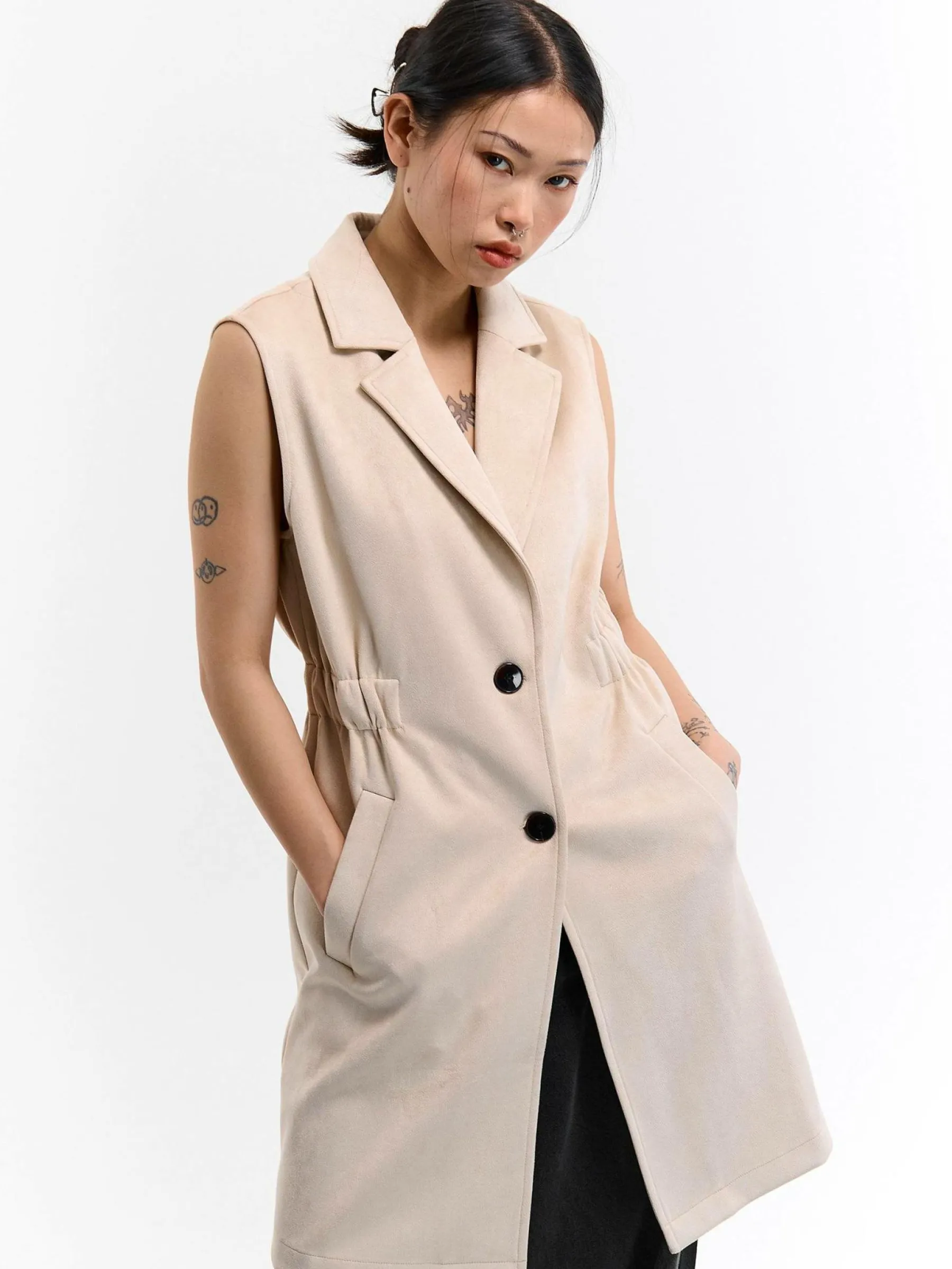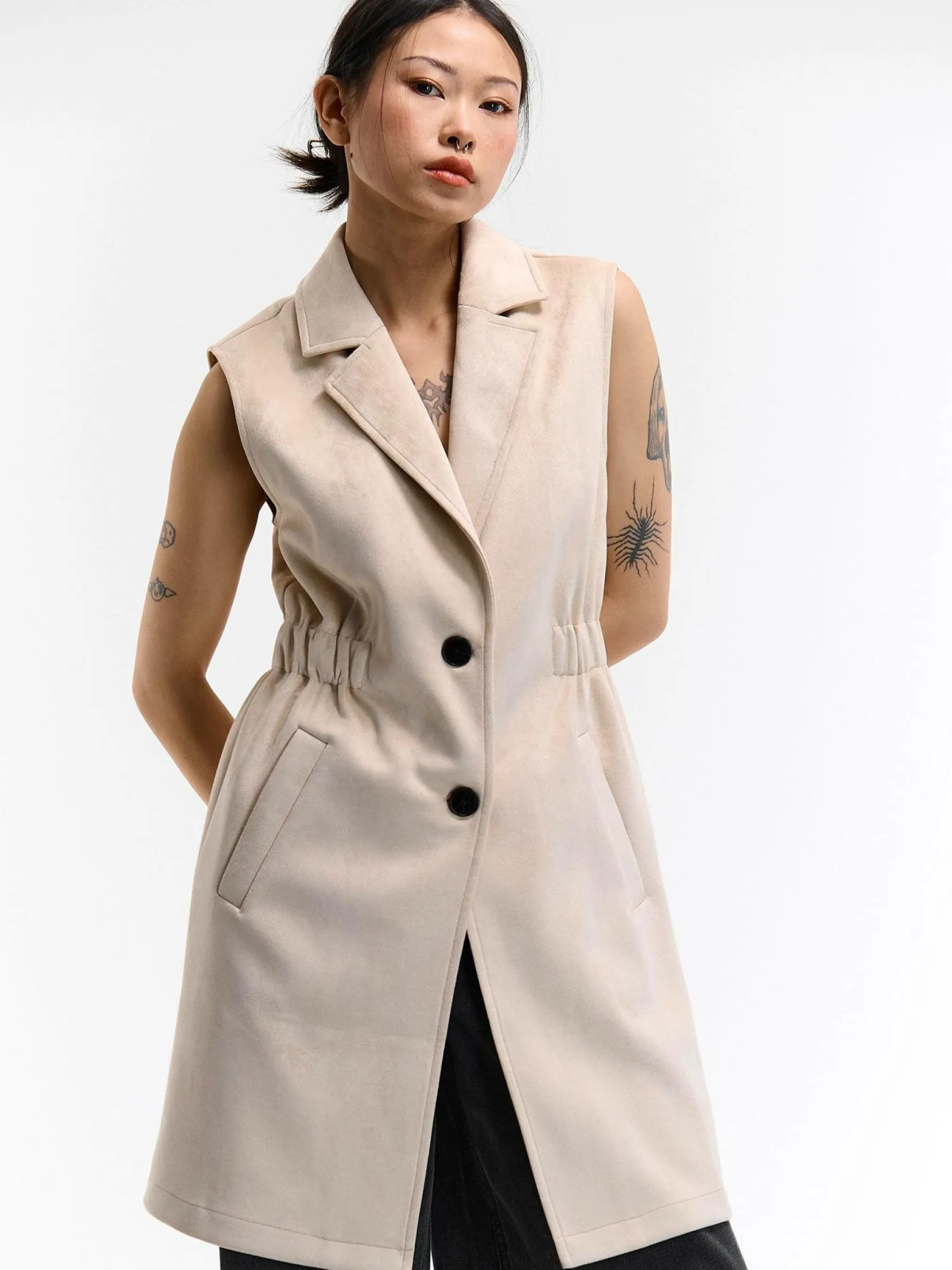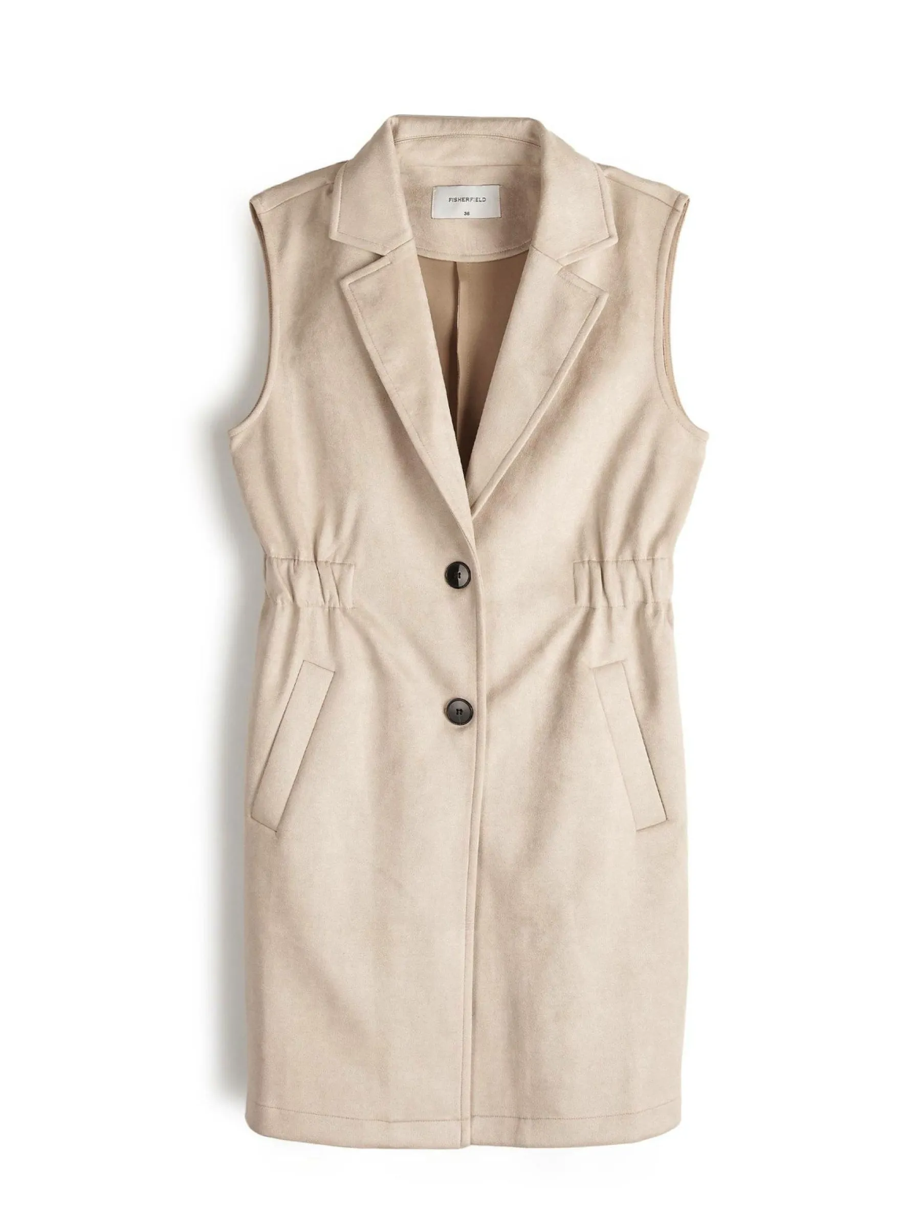 Kolor: beżowyKrój: podstawowyTyp: kamizelkaRekaw: bez rękawówDługość: dlugiePattern style: pojedynczy kolorDetal:…