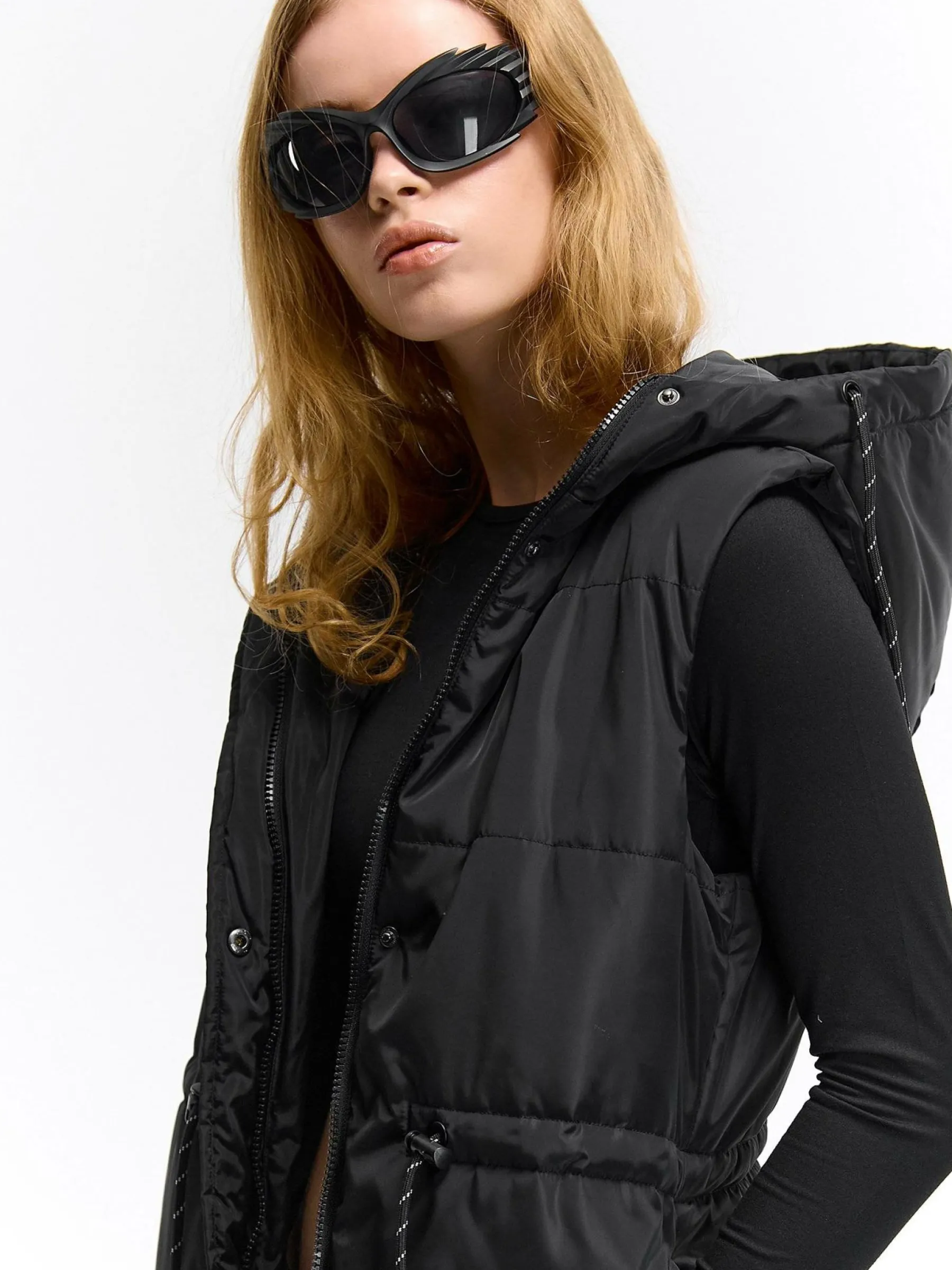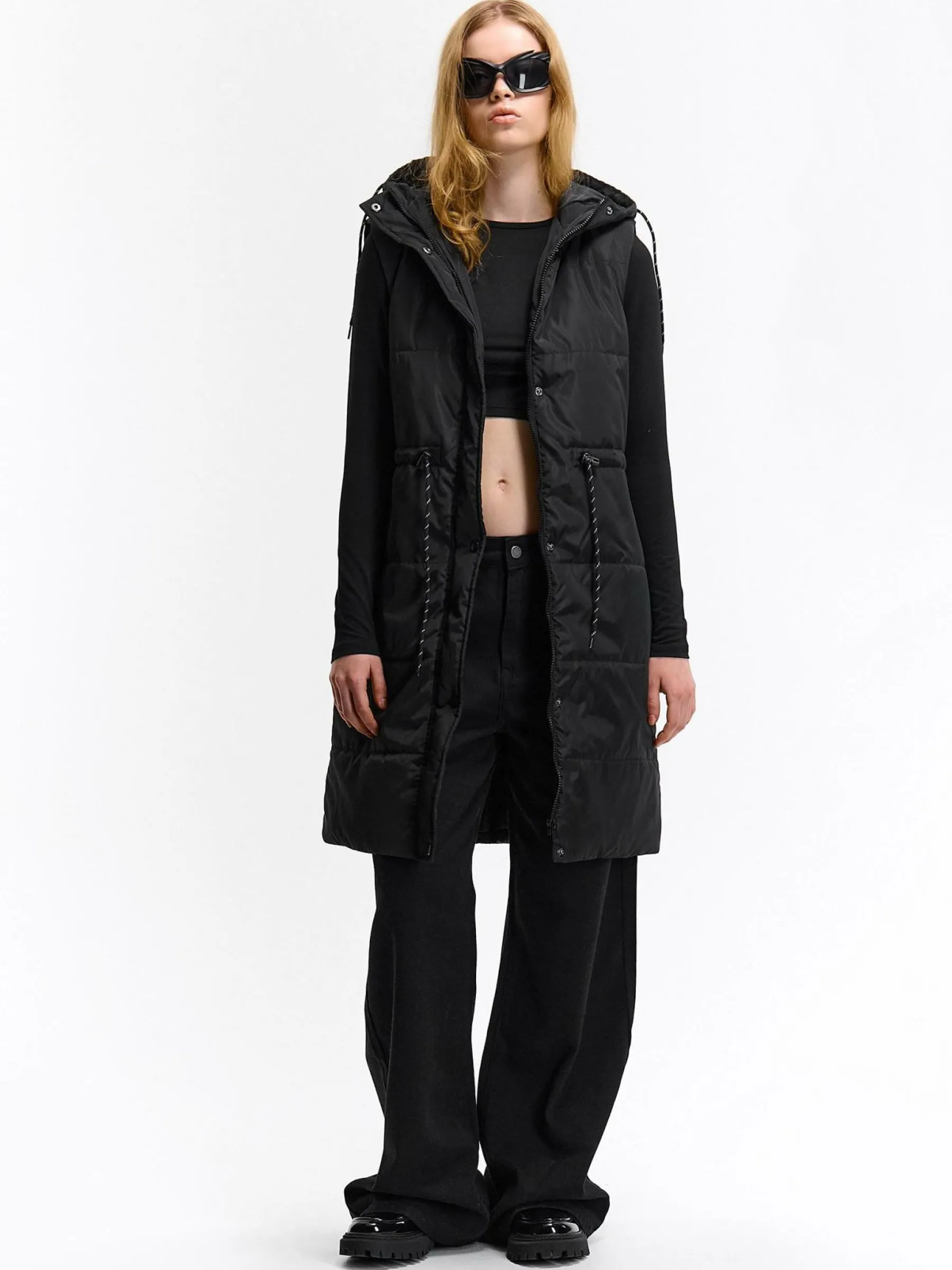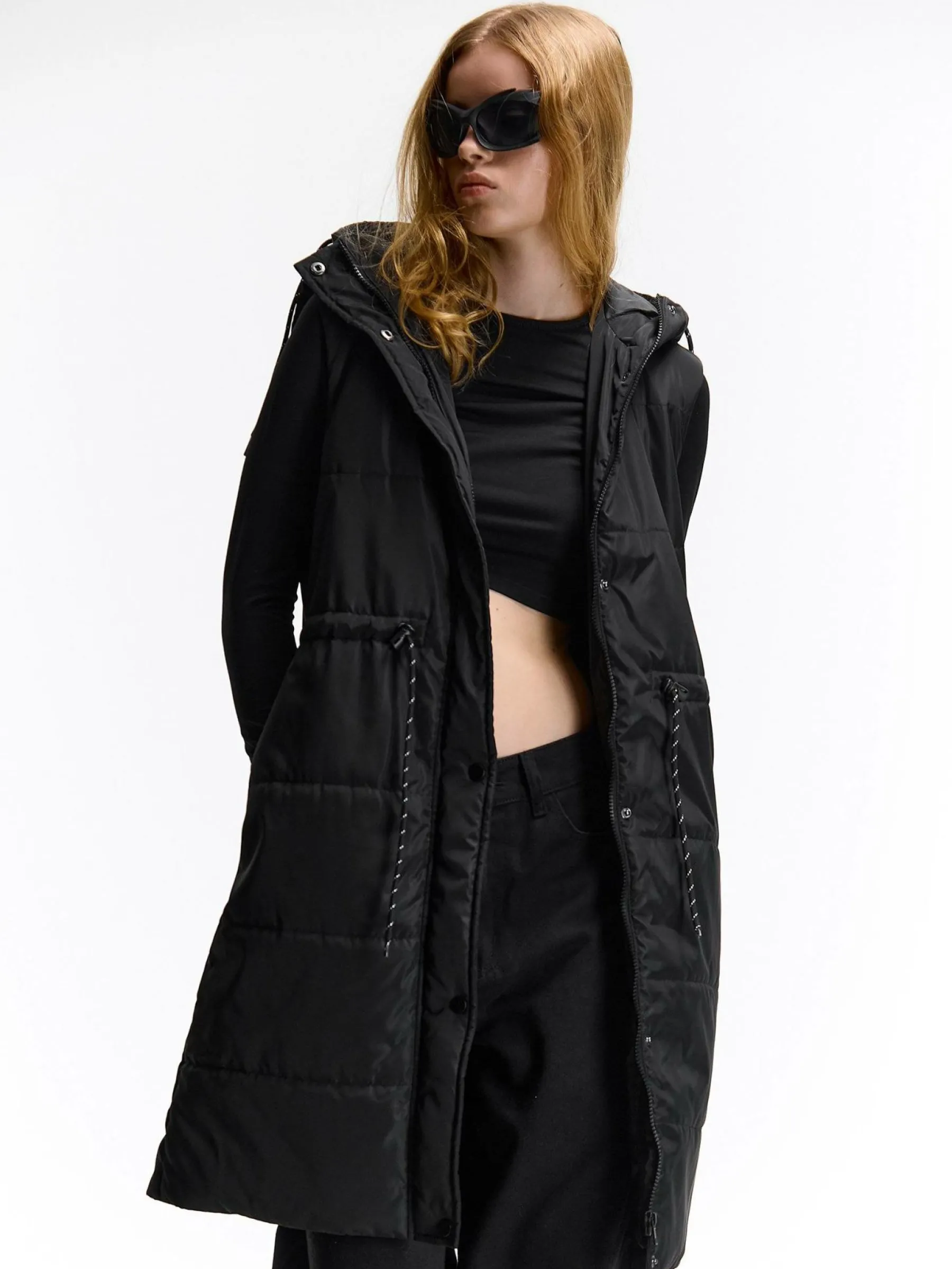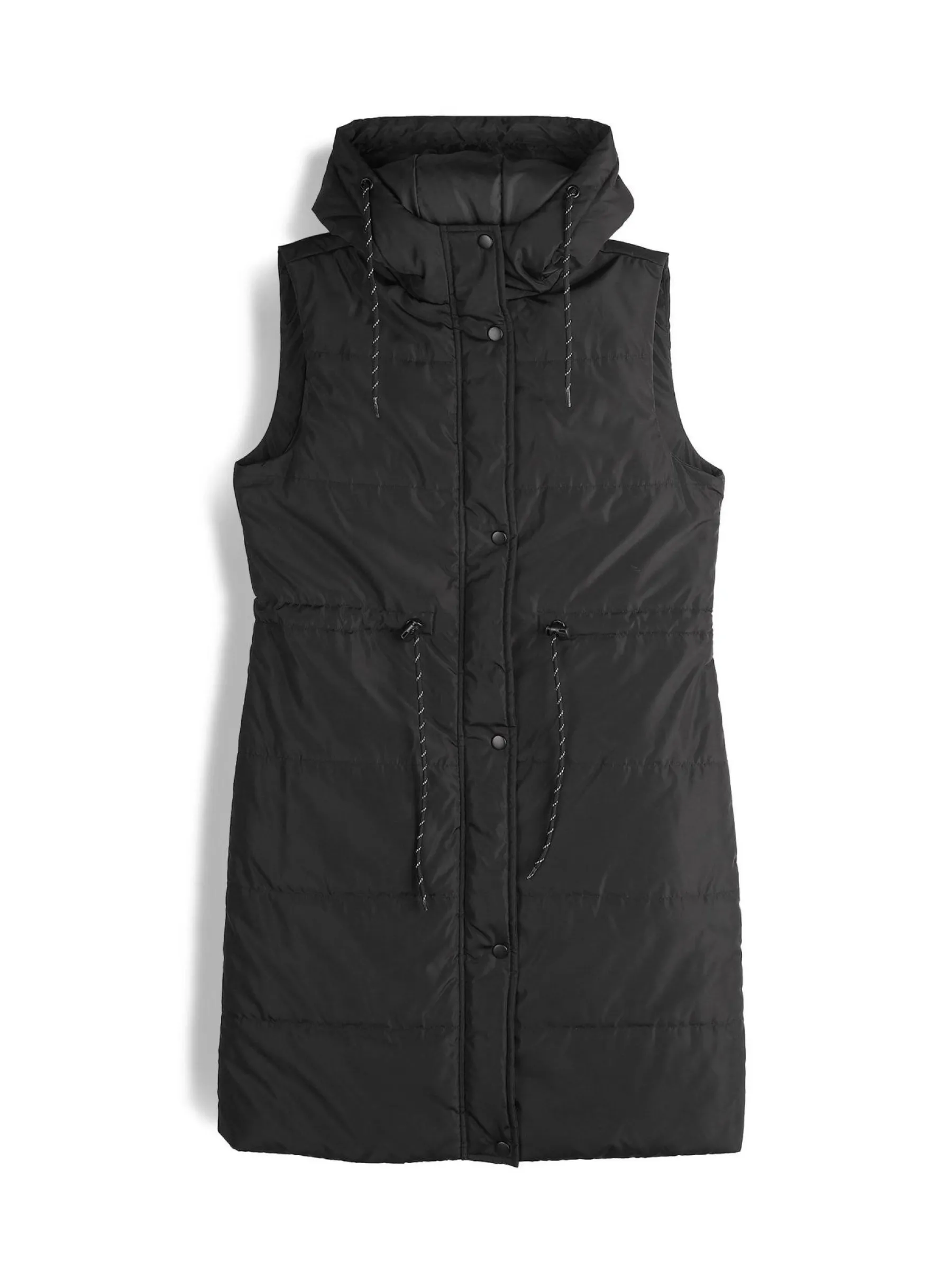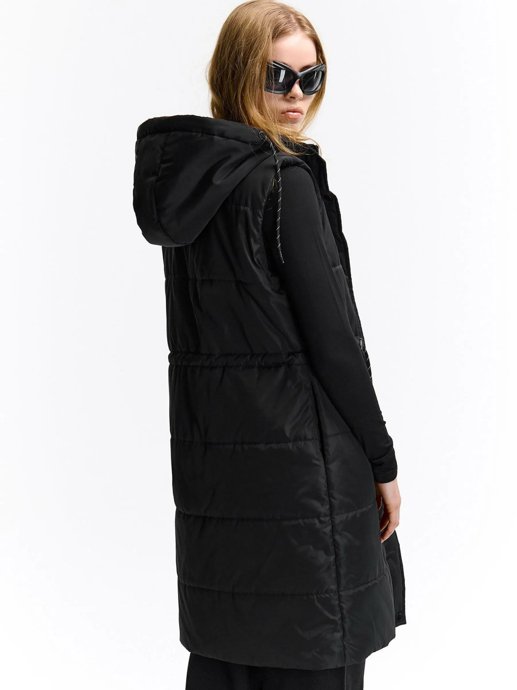 Kolor: czarnyKrój: pikowane, regularTyp: zimowa/przejściowa kamizelkaRekaw: bez rękawówDługość: dlugiePattern sty…