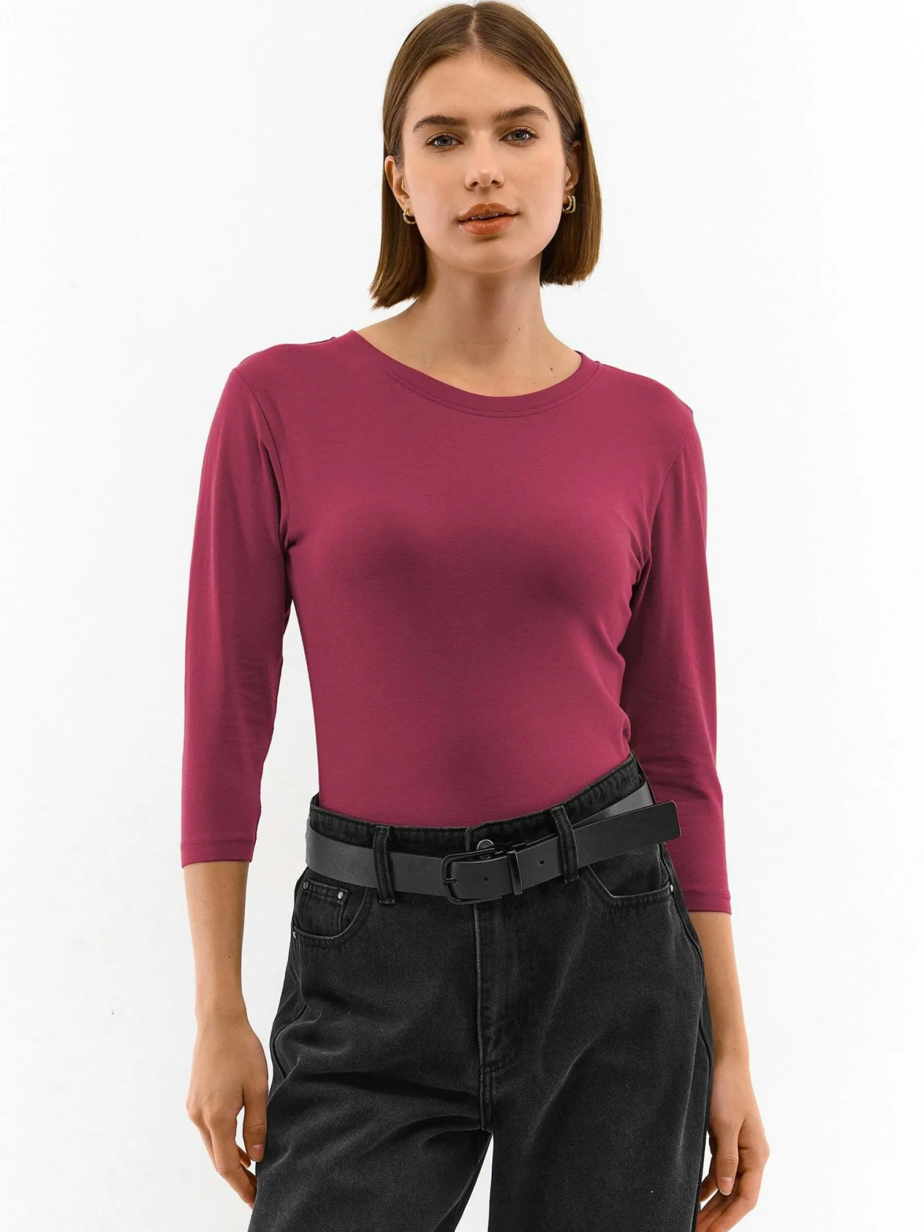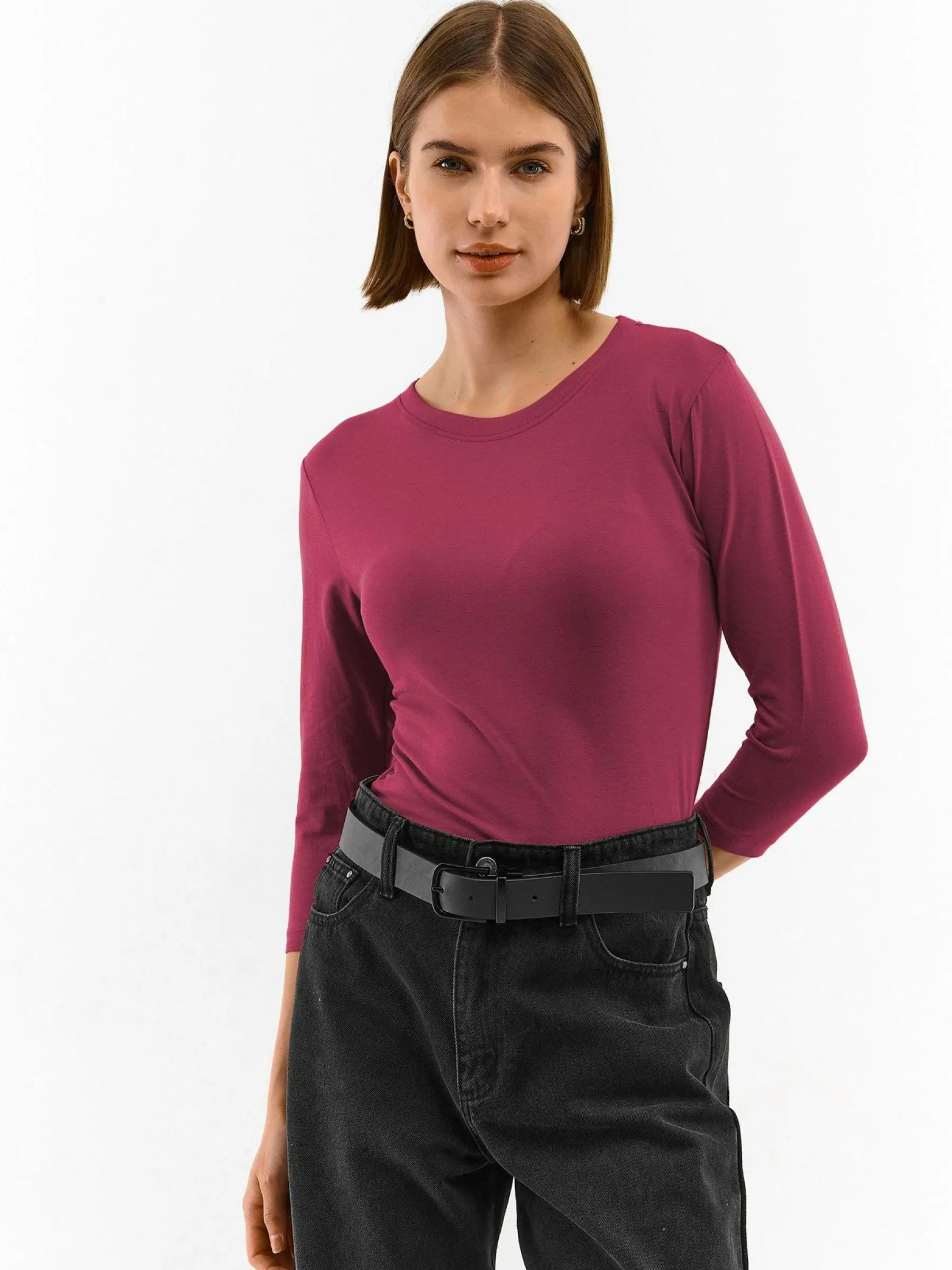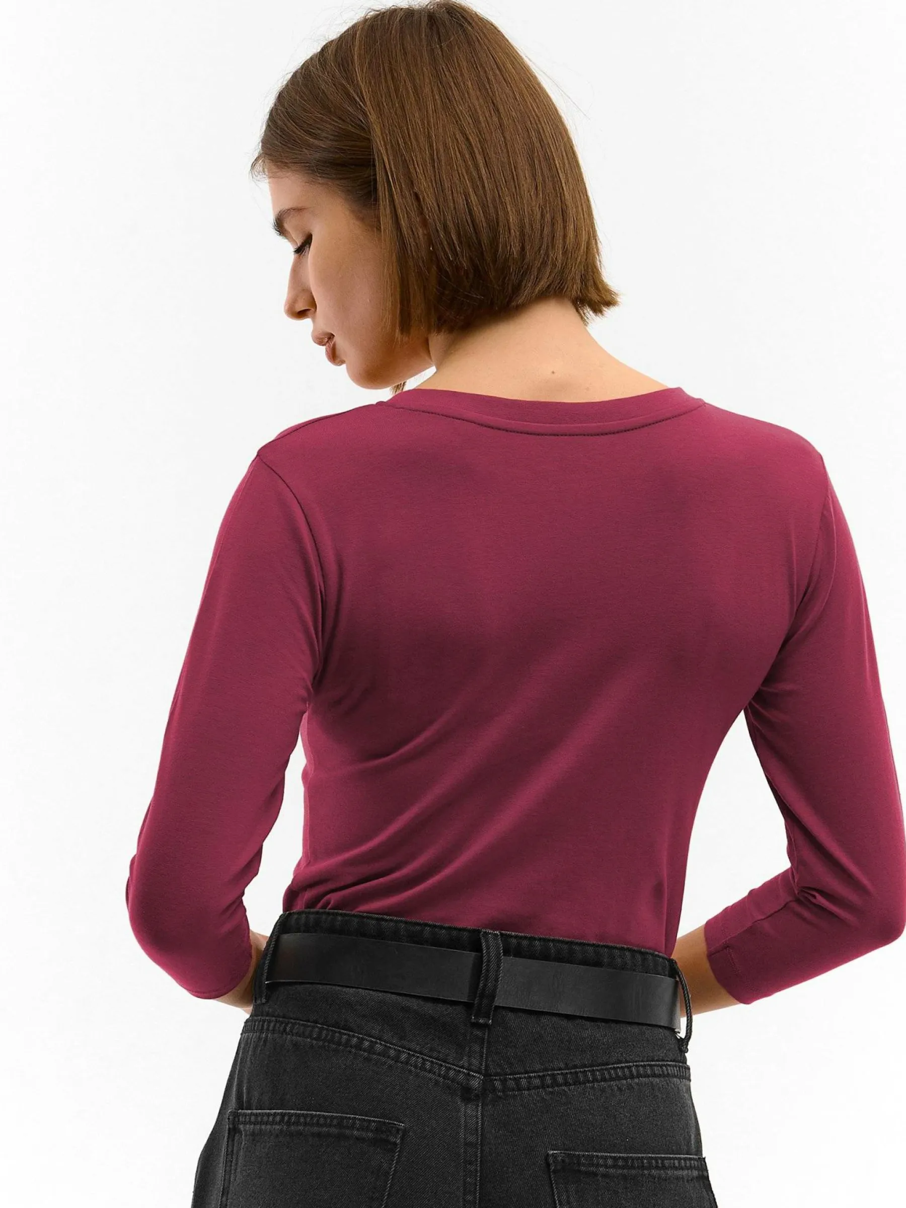 Kolor: burgundyKrój: podstawowyTyp: koszulkaRekaw: długi rękawDługość: krótkiPattern style: pojedynczy kolorDetal…