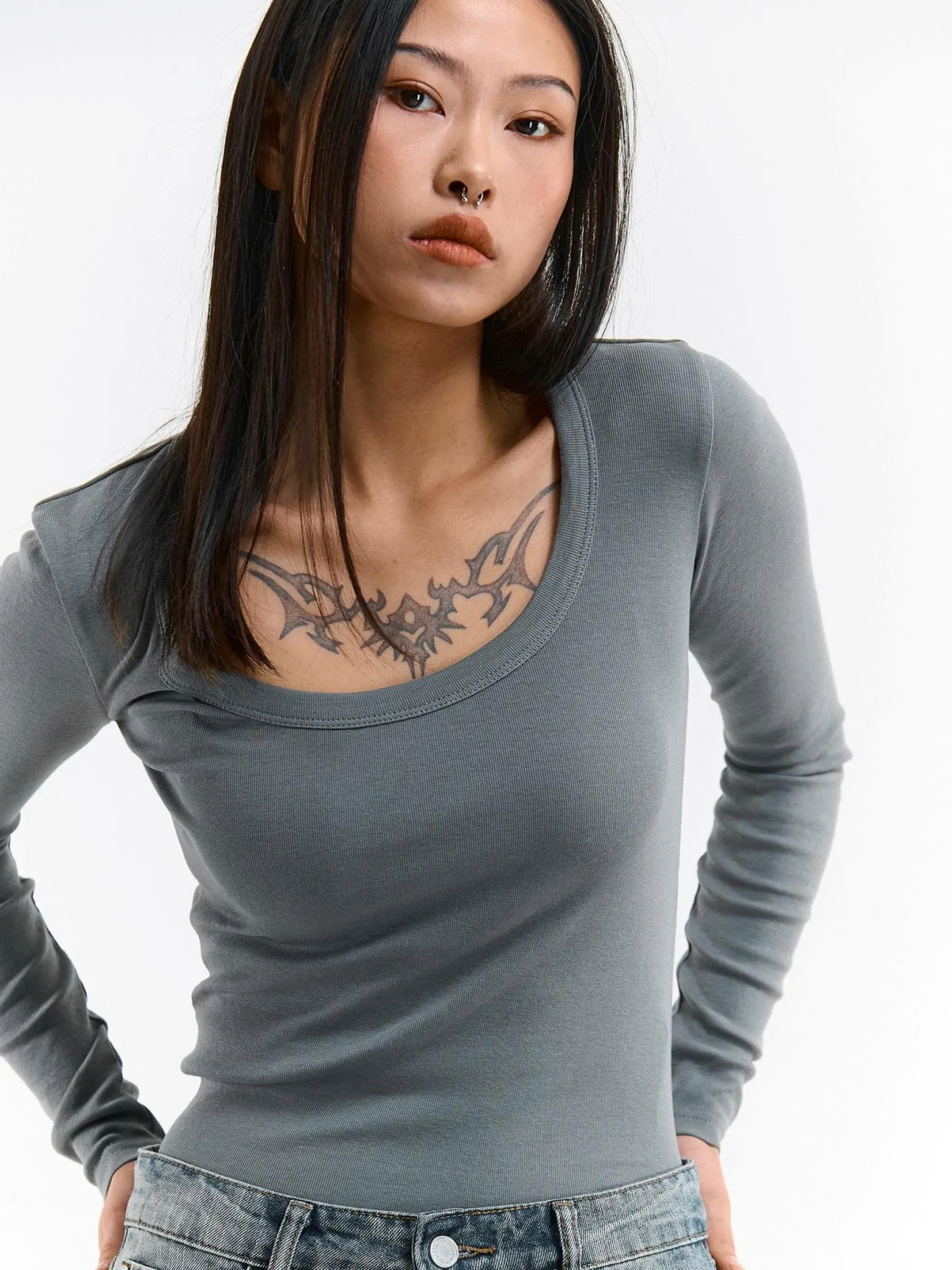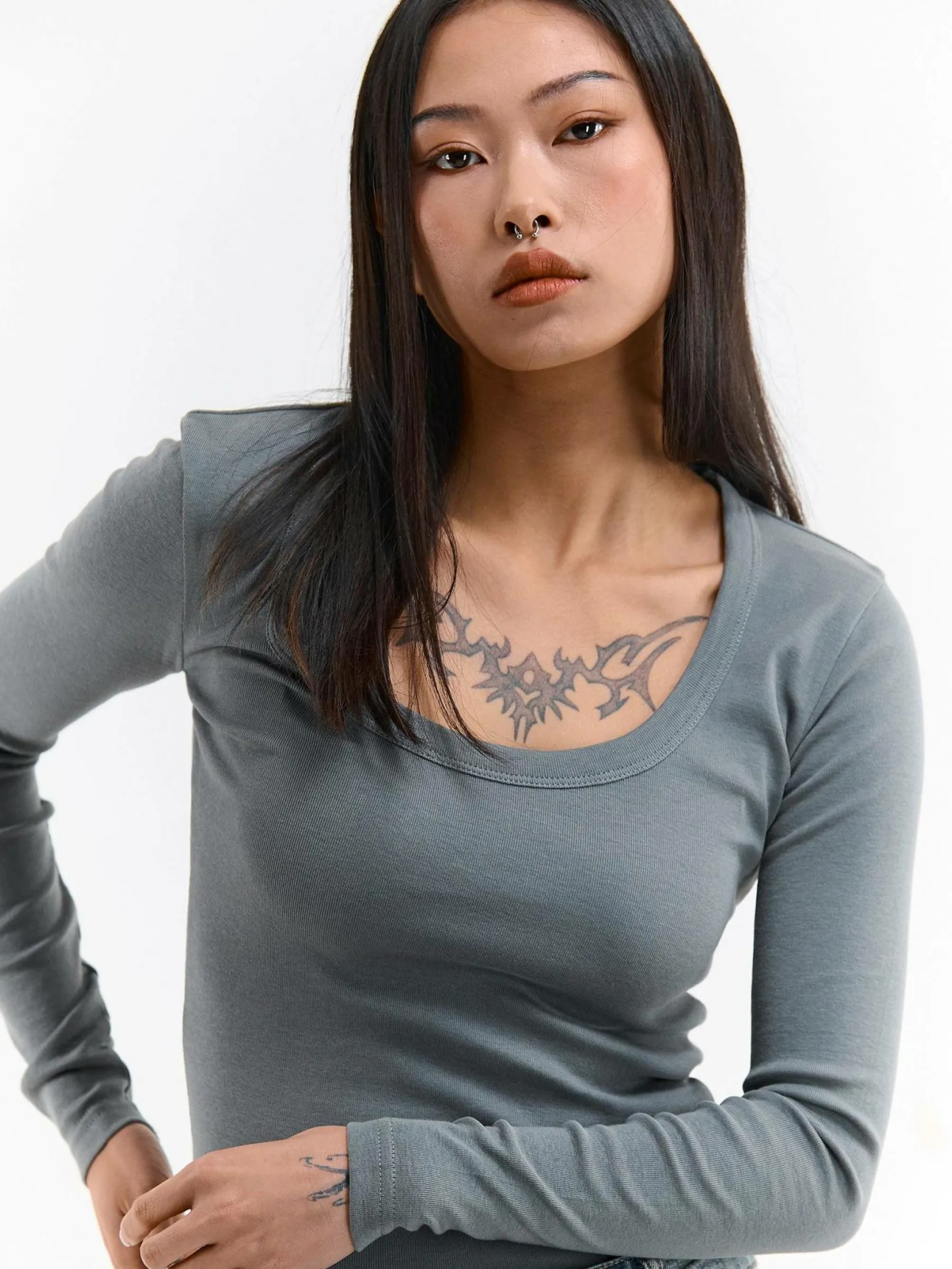 Kolor: szaryKrój: regularTyp: koszulkaRekaw: długi rękawDługość: krótkiPattern style: pojedynczy kolorDetal: nad …