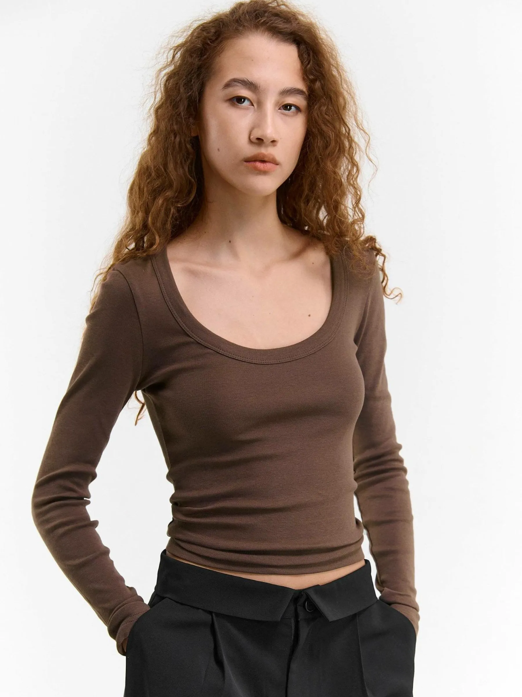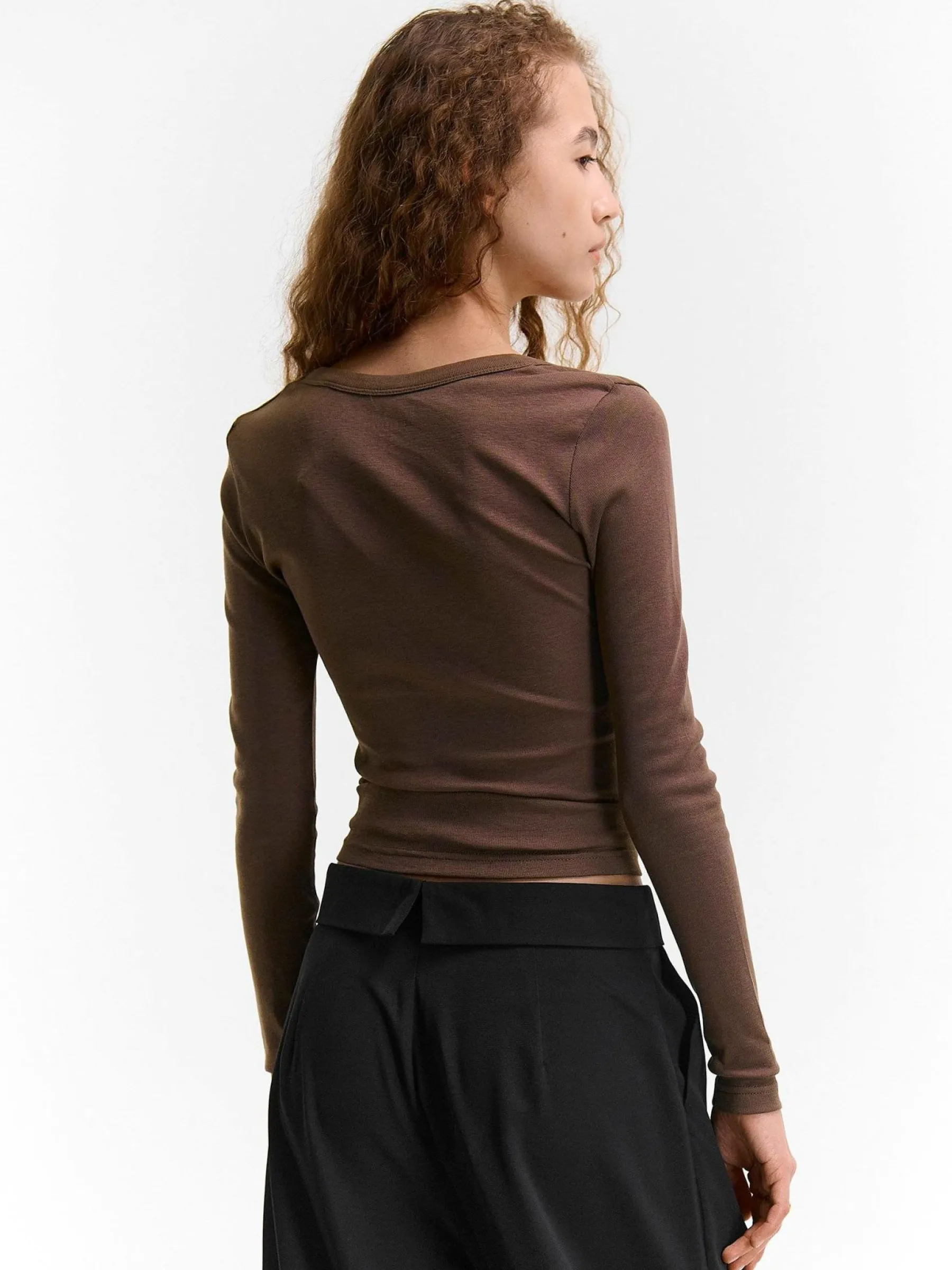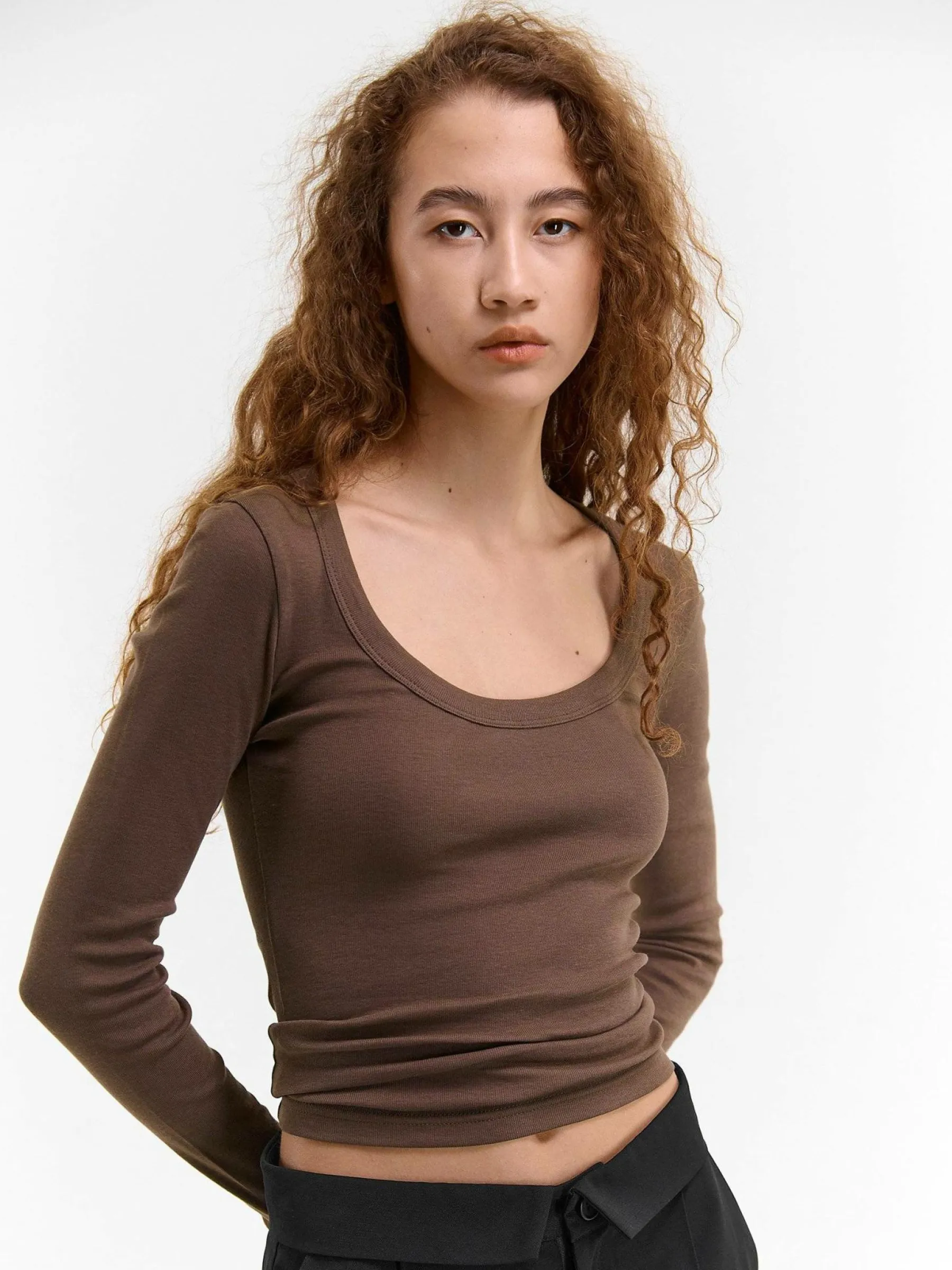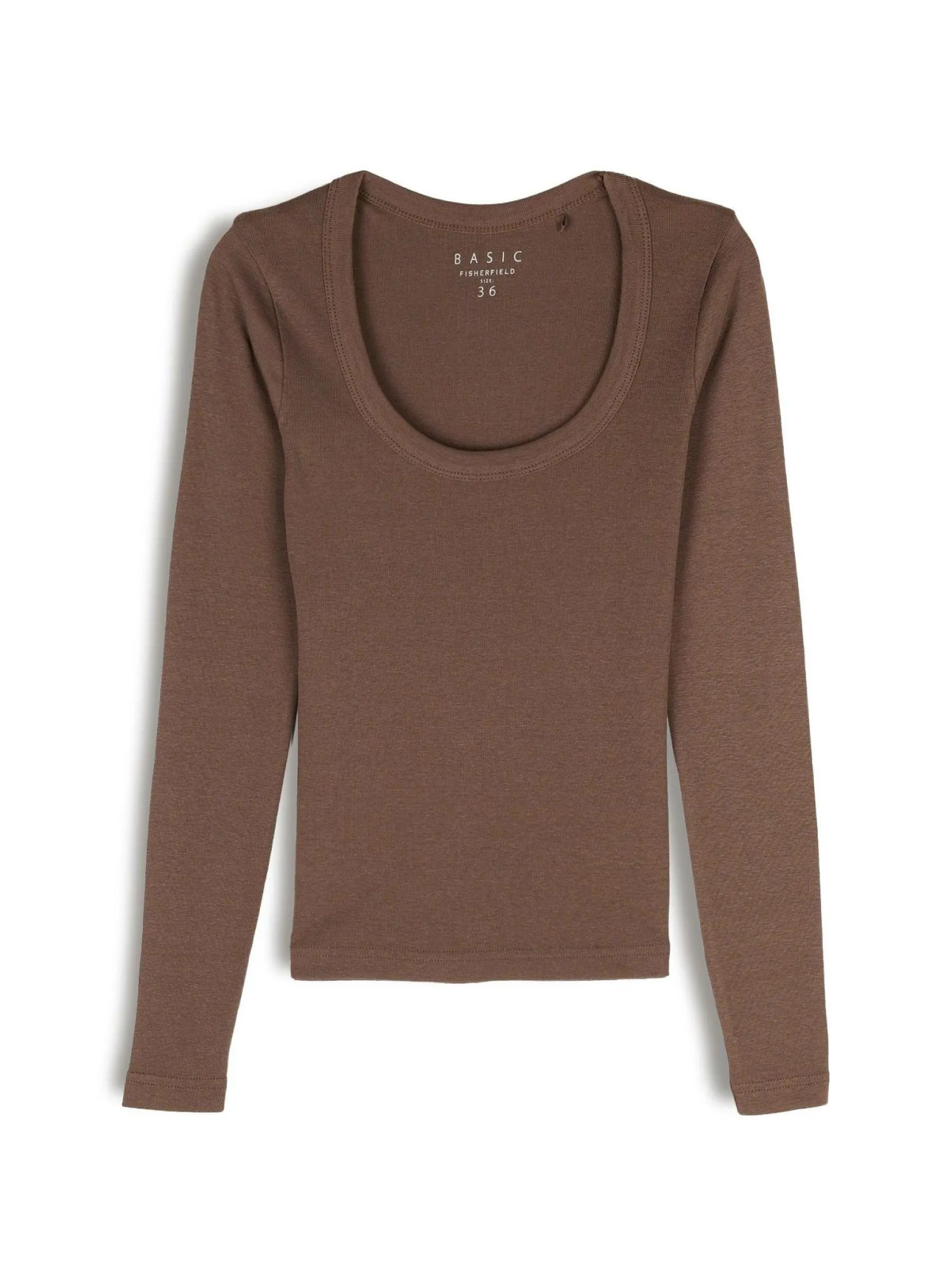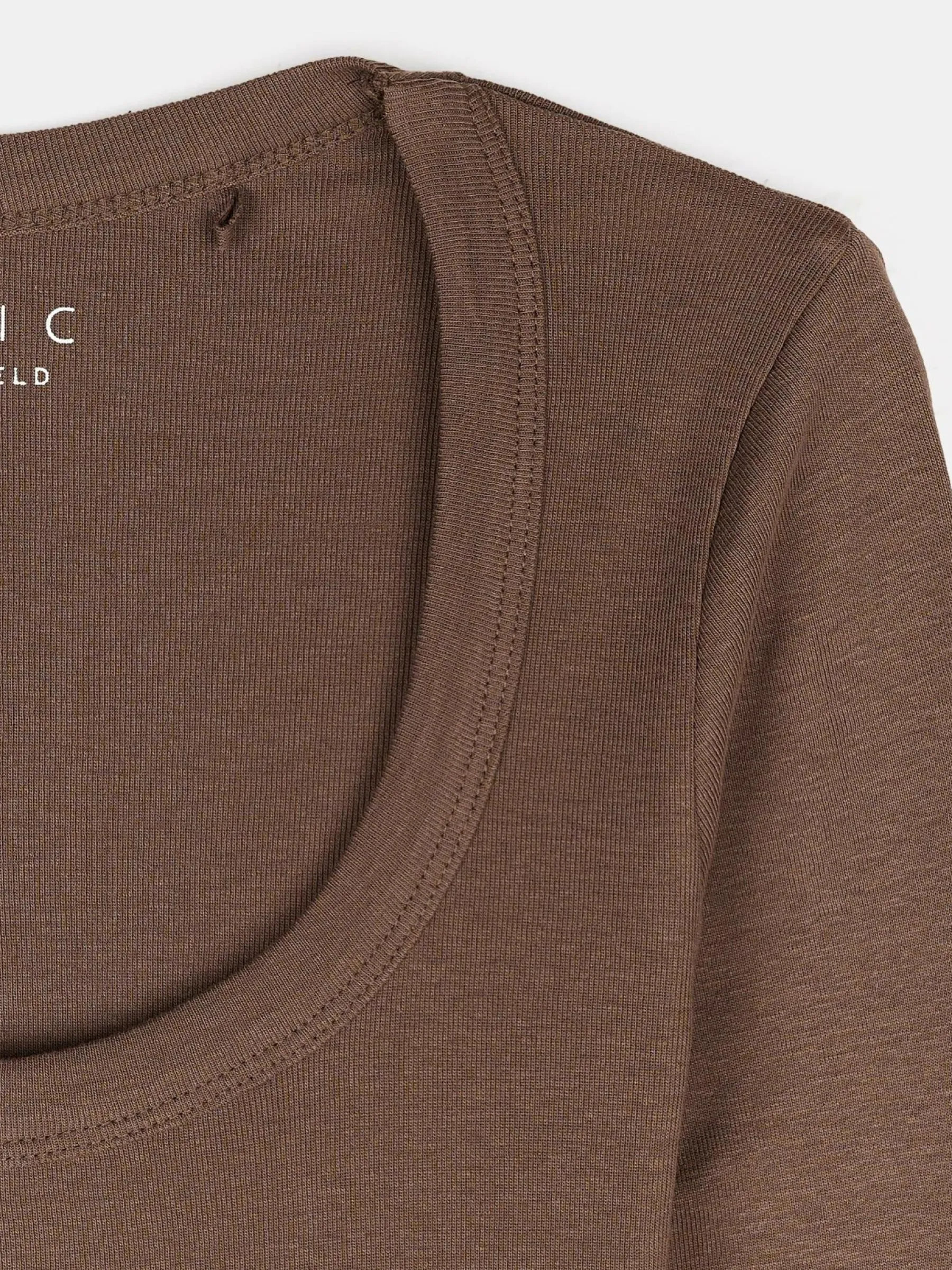 Kolor: brązowyKrój: regularTyp: koszulkaRekaw: długi rękawDługość: krótkiPattern style: pojedynczy kolorDetal: n…