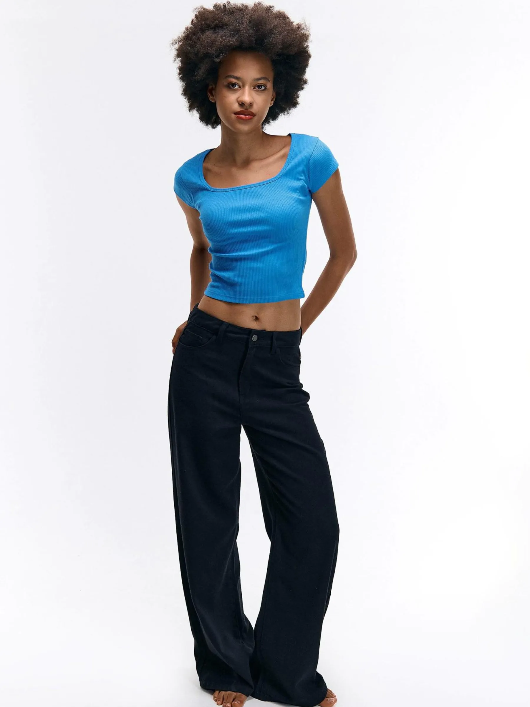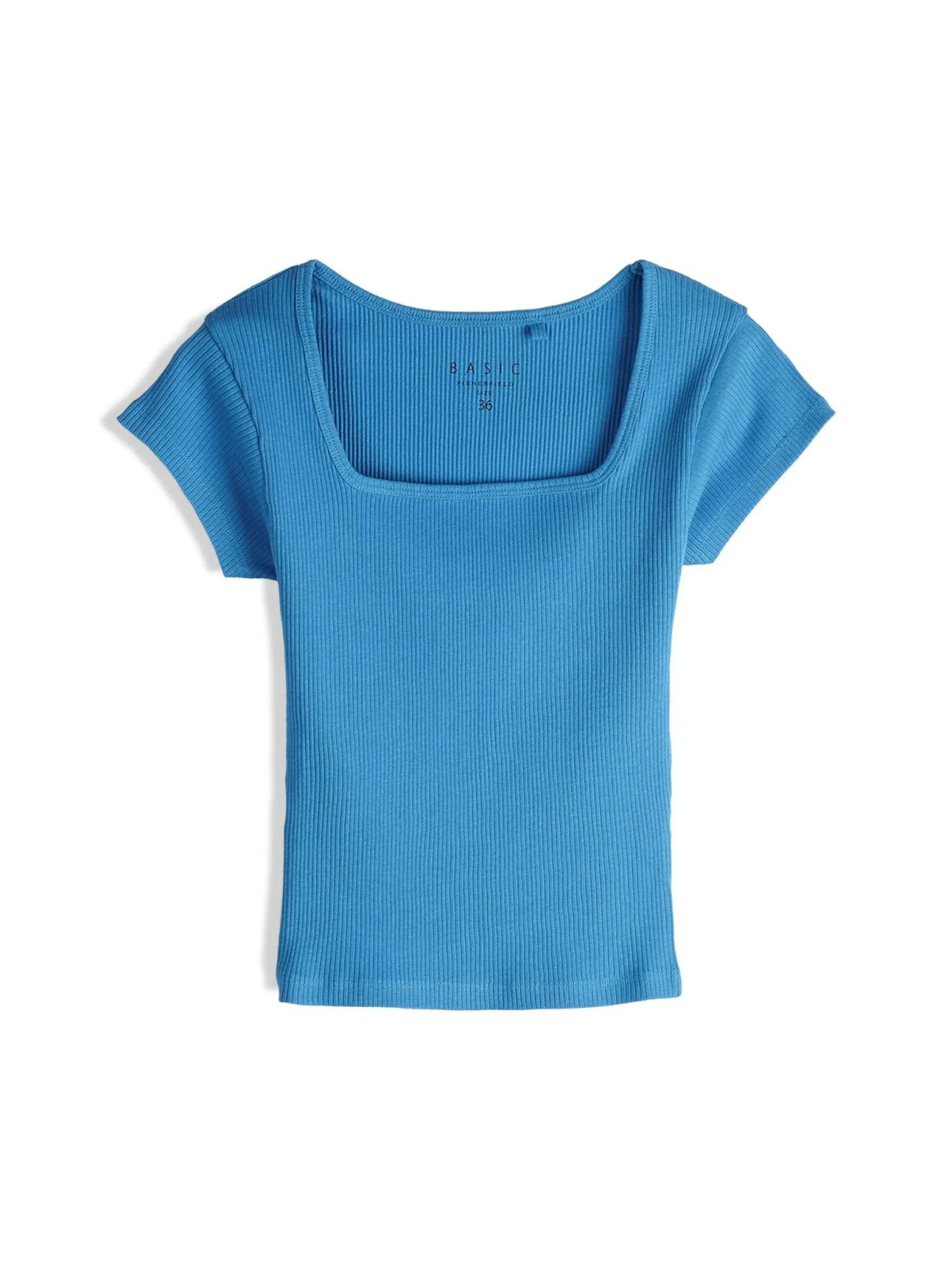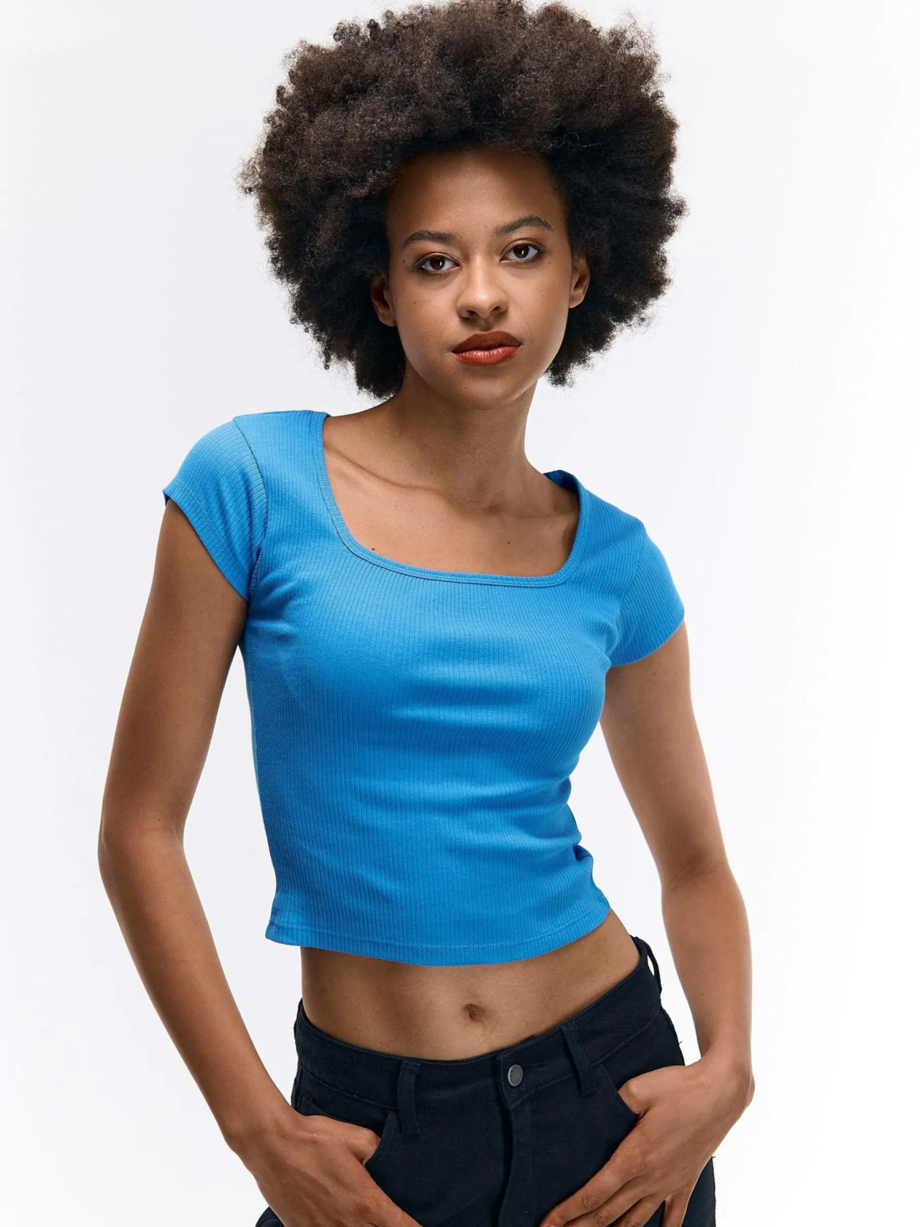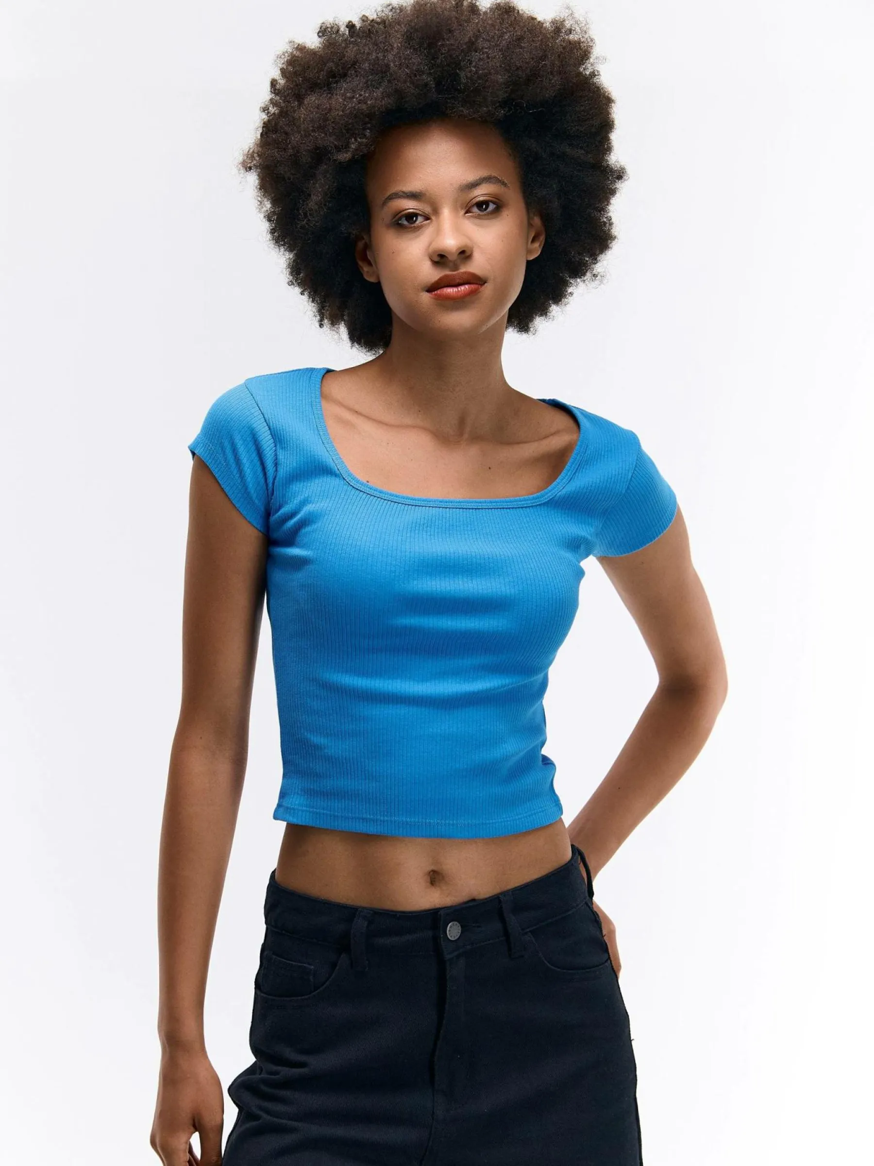 Kolor: niebieskiKrój: regularTyp: koszulkaRekaw: krótki rękawDługość: krótkiPattern style: pojedynczy kolor, żeb…