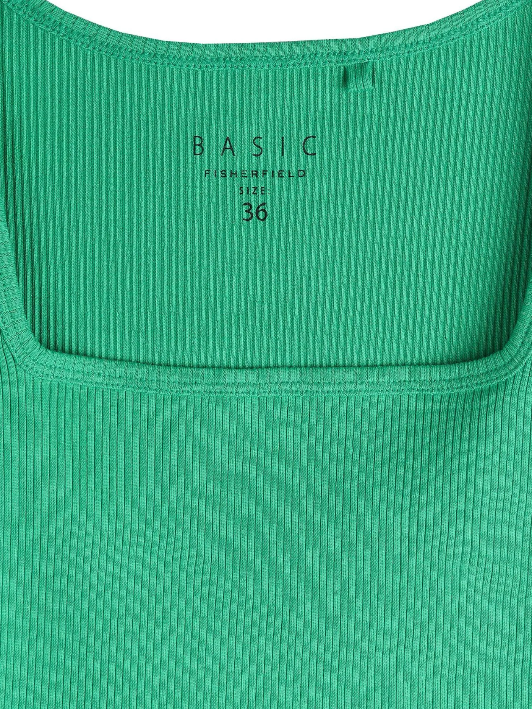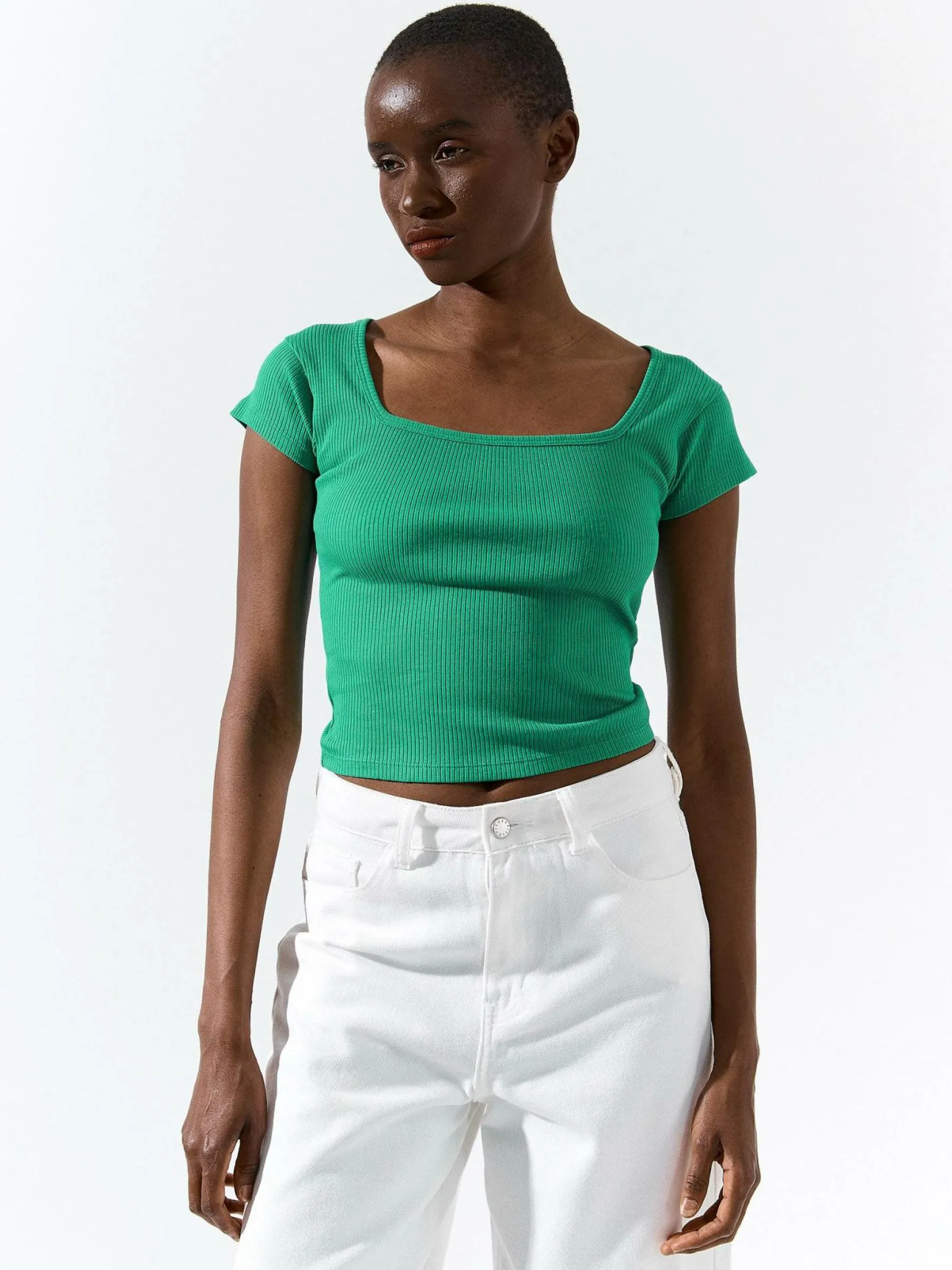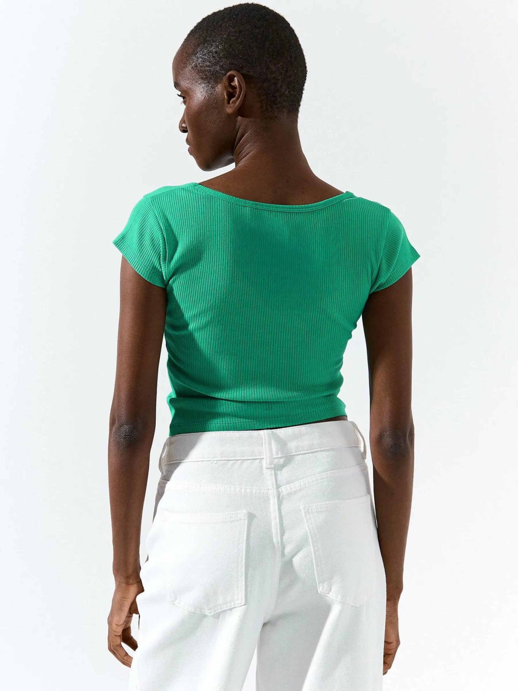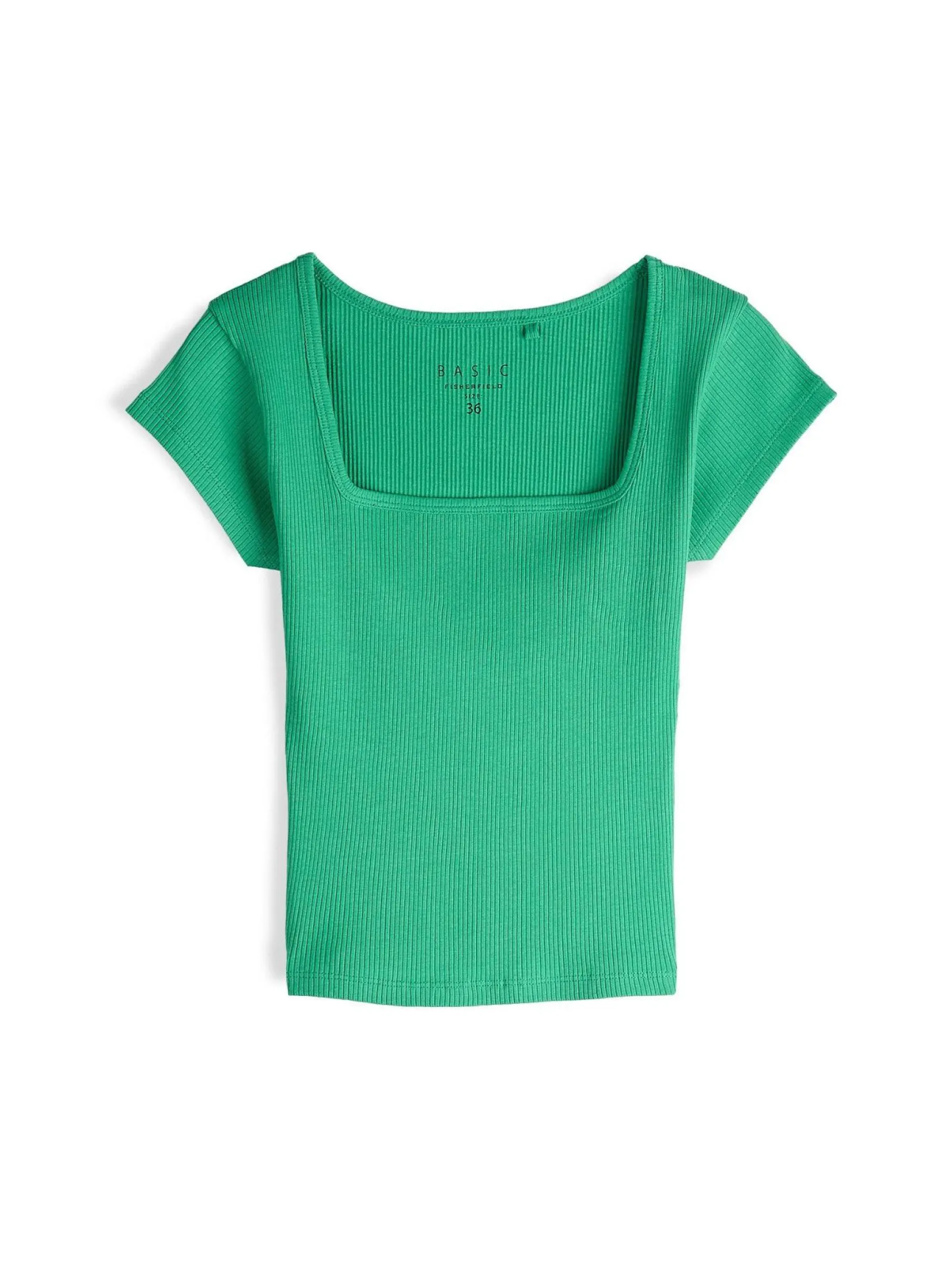 Kolor: zielonyKrój: regularTyp: koszulkaRekaw: krótki rękawDługość: krótkiPattern style: pojedynczy kolor, żebro…