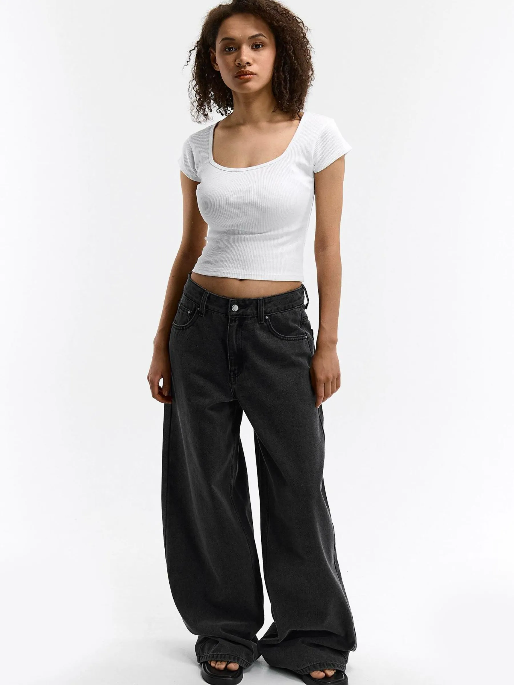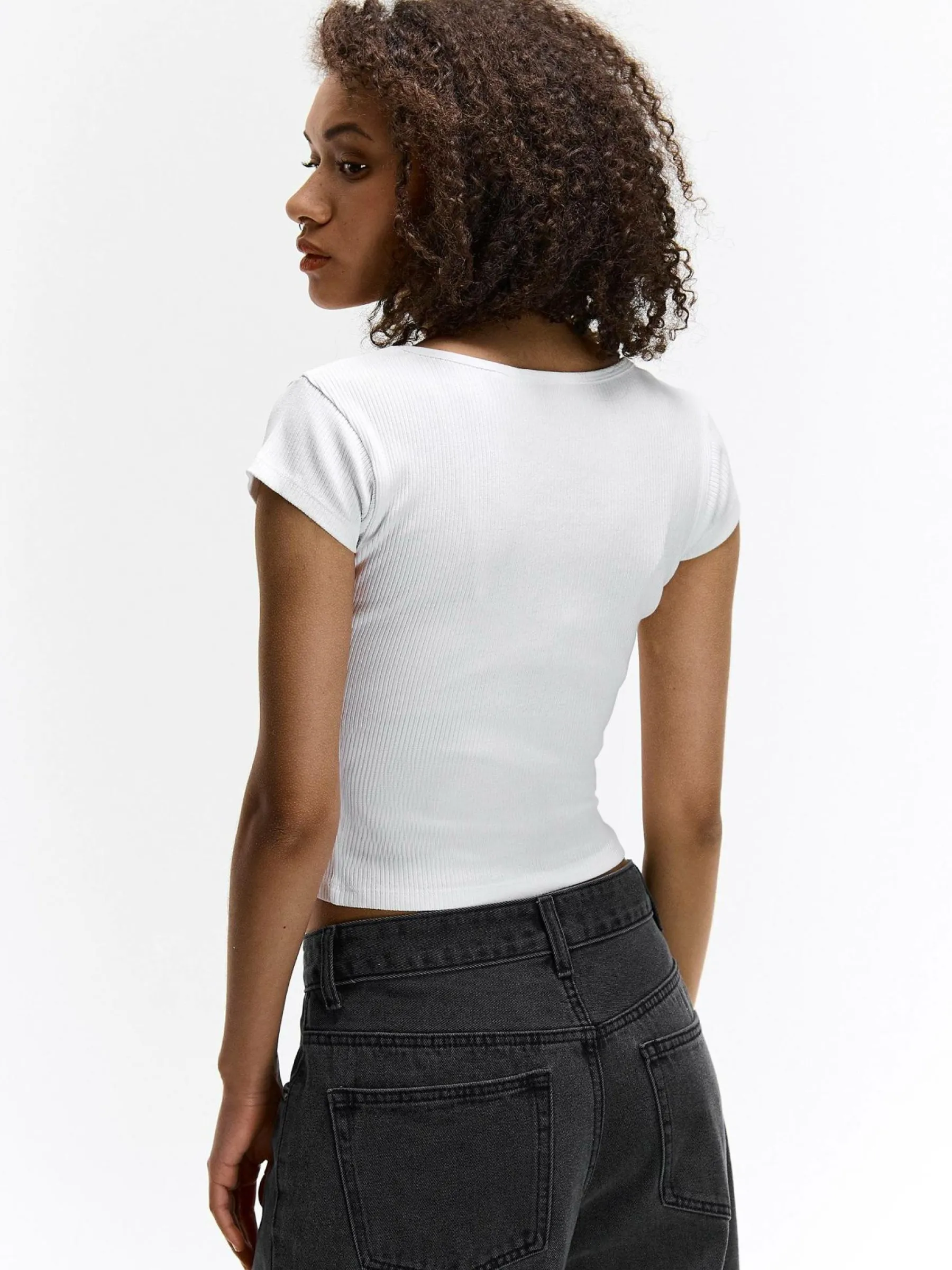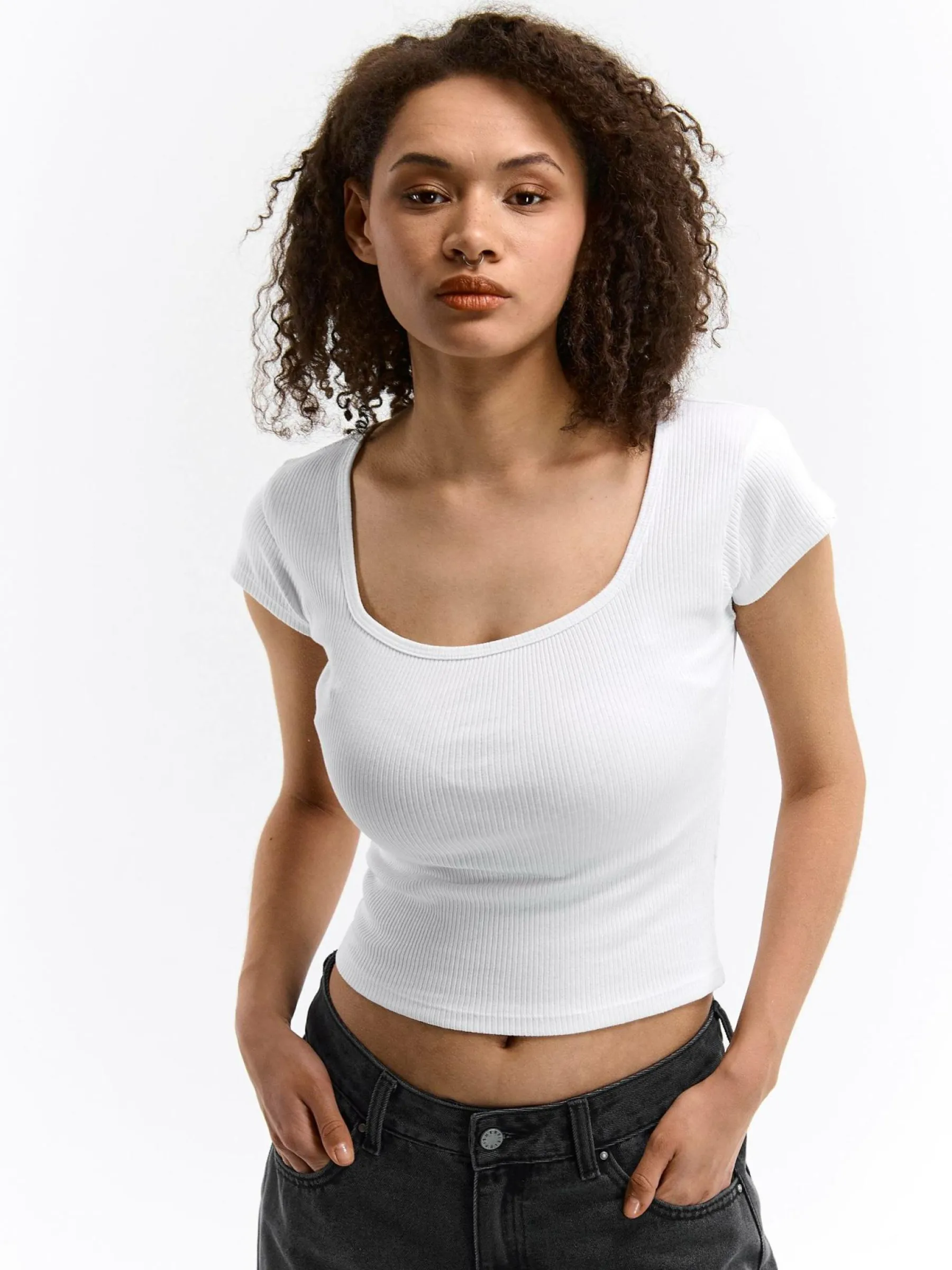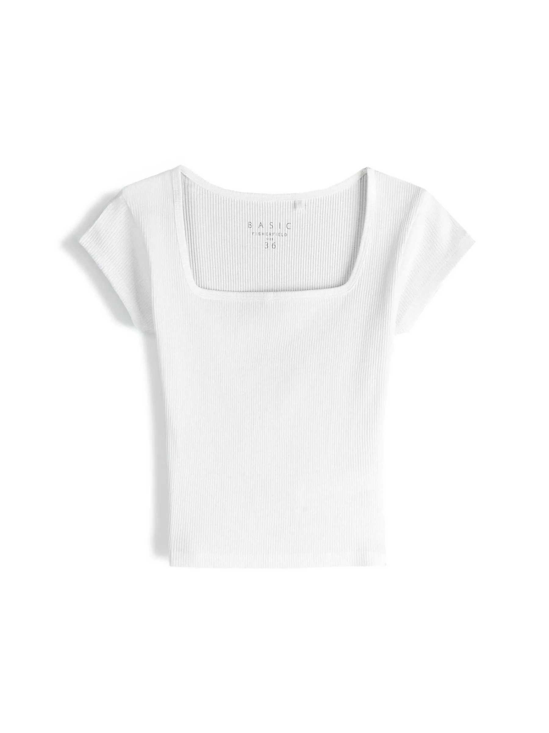 Kolor: białyKrój: regularTyp: koszulkaRekaw: krótki rękawDługość: krótkiPattern style: pojedynczy kolor, żebrow…