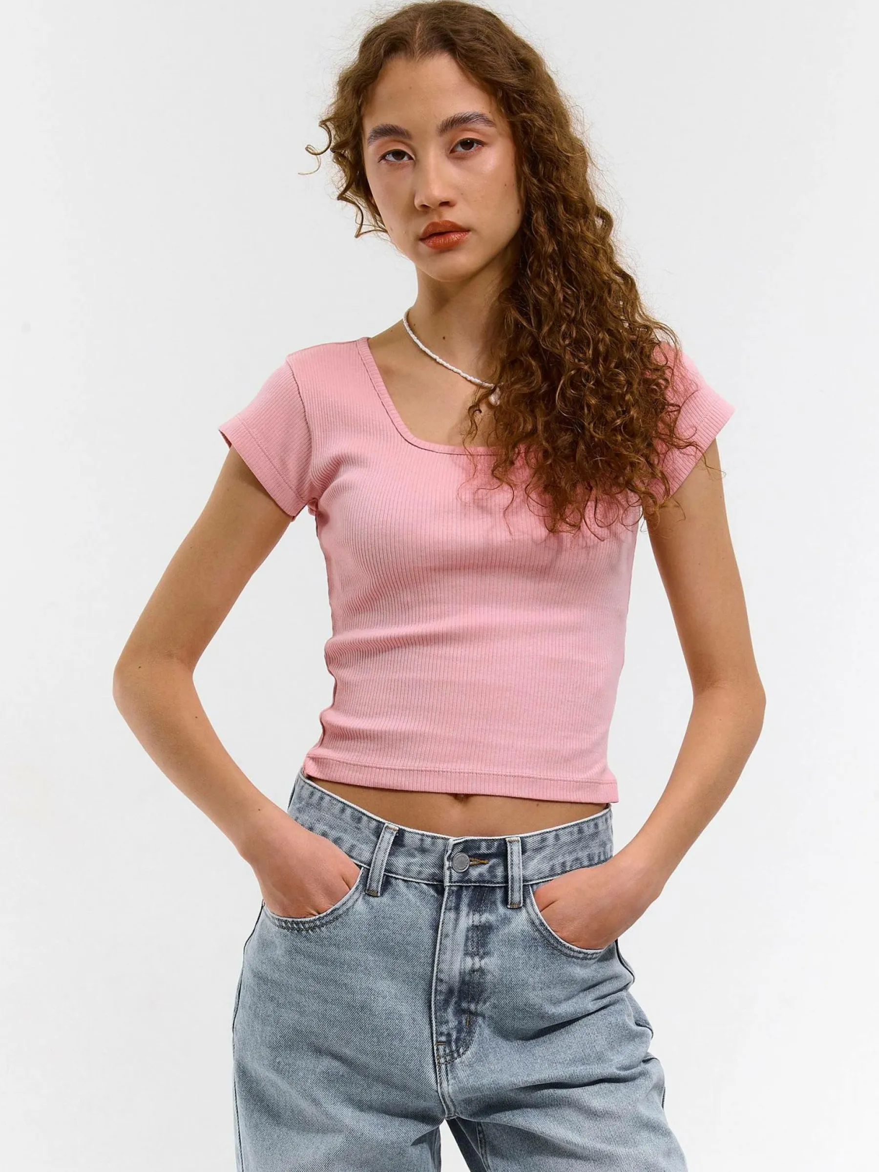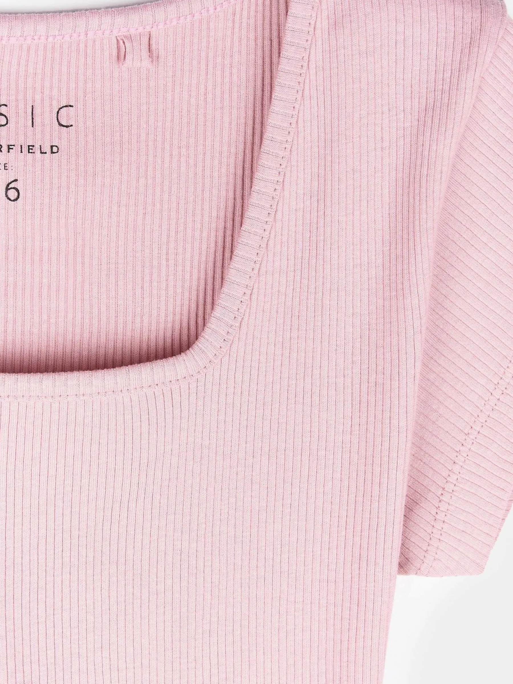 Kolor: różowyKrój: podstawowyTyp: koszulkaRekaw: krótki rękawDługość: krótkiPattern style: żebrowany, pojedync…